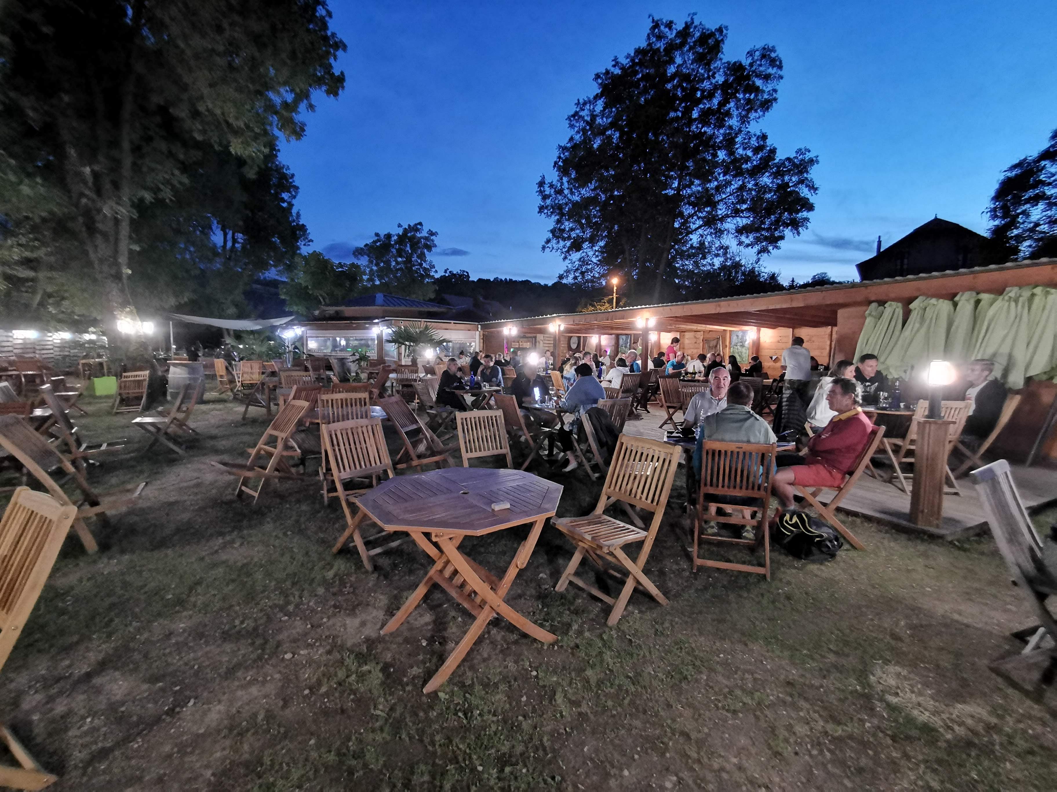 Bel emplacement pour une soirée en amoureux. Un samedi soir, pas de réservation, on nous demande de réserver pour 21h30...pourquoi pas ? Nous revenons après une balade et nous installons ...le lac n'est pas loin, les tables espacées et l'ambiance musicale plaisante. Un peu d'air frais, c'est parfait. Les serveurs sont jeunes dynamiques et très agréables. Au petit soin...on nous sert du vin rouge chaud...on nous ramène un verre sans discuter. Le patron nous parles de tunes . L'accueil a été limite, on appelle et on nous snobé.beaucoup de monde...mais bon Les plats sont bons...mais les prix ...abusifs, l'emplacement justifie t'il cela ? Franchement on était pas non plus les pieds dans l'eau eau, dans l'herbe et sur des mobiliers de jardin en teck...bref, on est loin d'un établissement gastronomique et je ne reviendrais pas