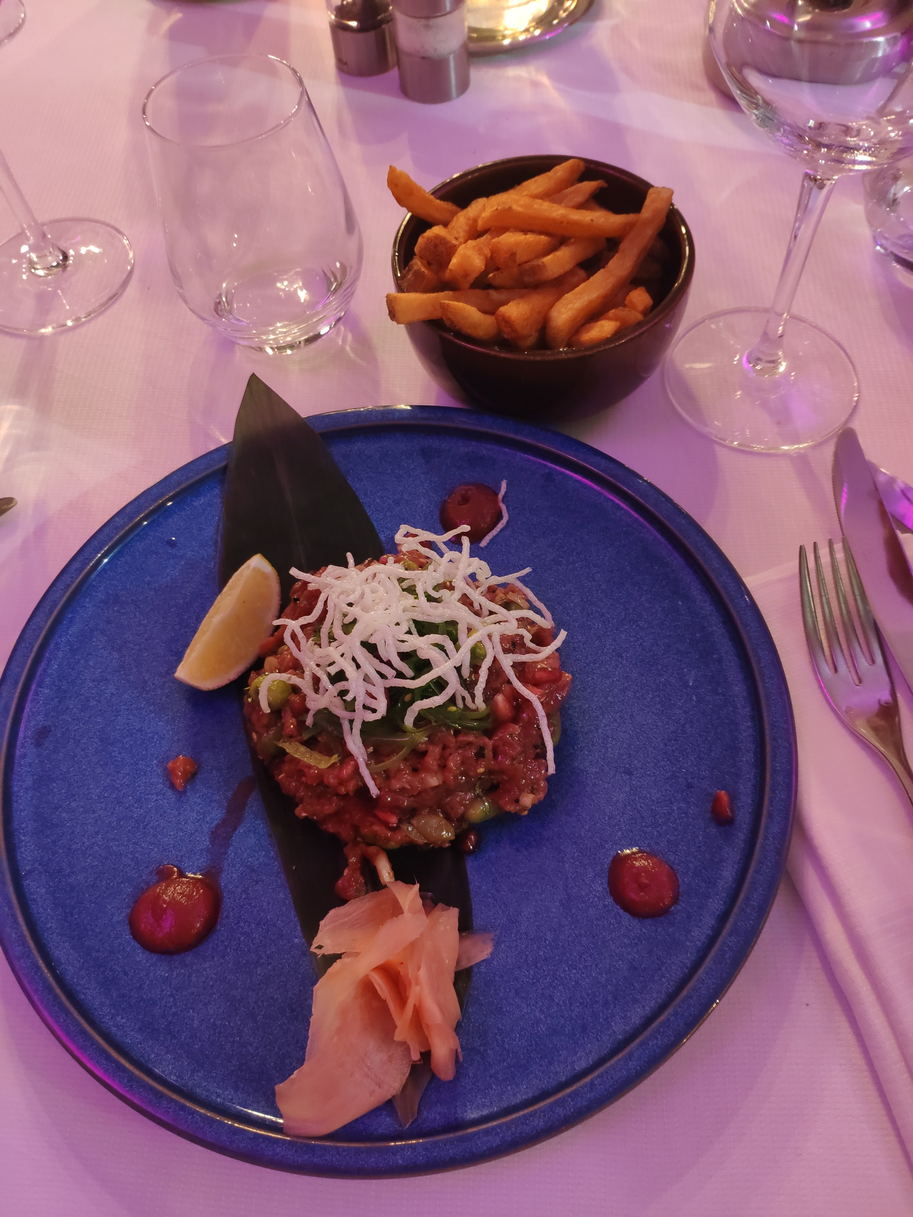 Le dîner était bon même si les prix sont un peu élevés le décor est agréable mais nous avons été un peu déçus de l ambiance qui n a pas été du tout festive alors que nous y étions pour l anniversaire de mon mari malgré la bonne volonté des serveurs… les clients malheureusement trop jeunes n ont pas saisis l opportunité de faire la fête 🥳