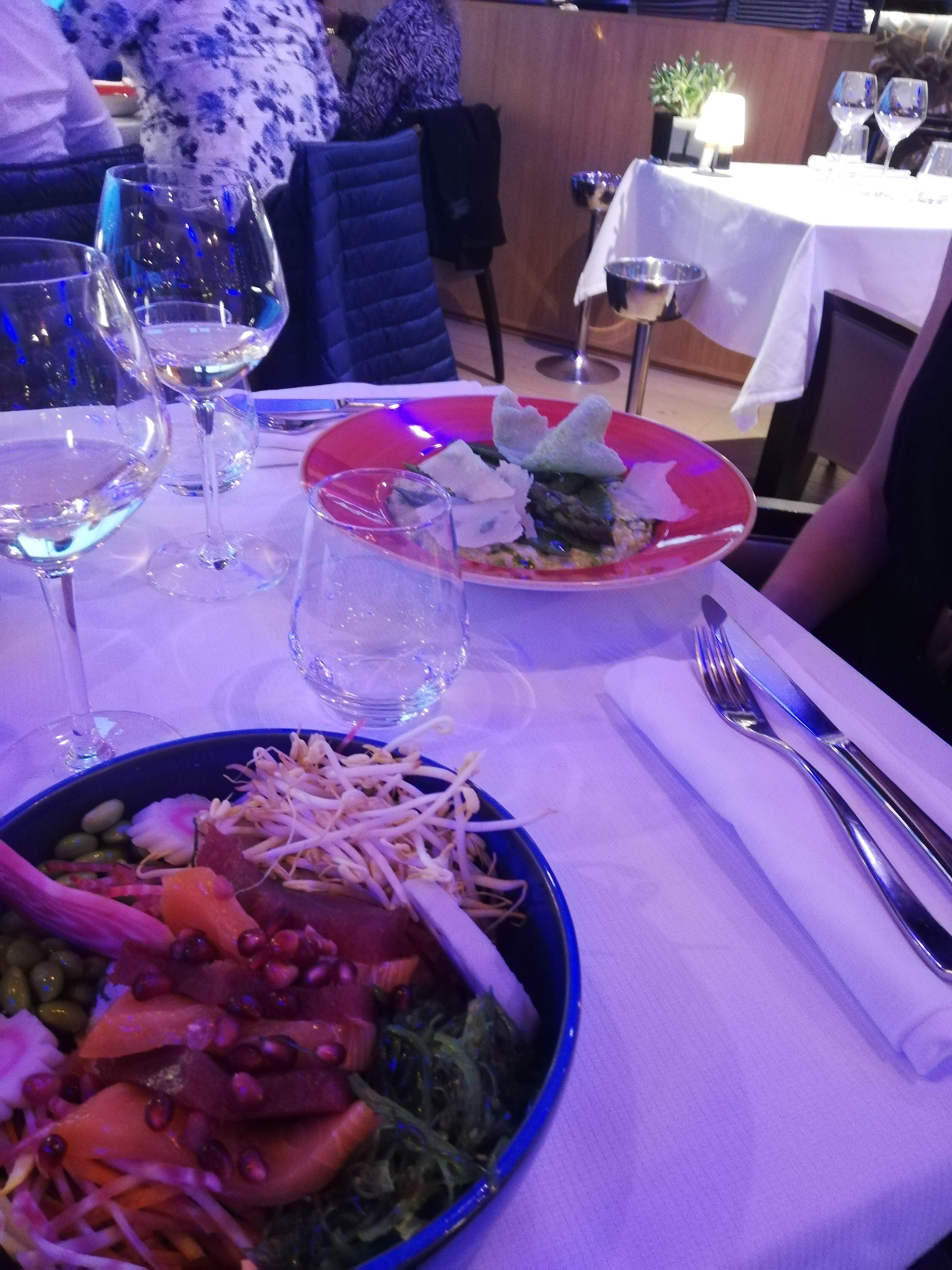 le serveur était sympathique malgré la demande lors de la réservation d'avoir une table prés des fenêtres donnant sur le port et l'accord du restaurant lors de la confirmation ,nous nous sommes retrouver dans un coin très sombre a l’arrière de restaurant ,cela aurais pu nous être signifié (nombreux sms pour confirmer la réservation). musique très forte a partir de 21h un peu tôt pour commencer . ne recommande pas en WE.