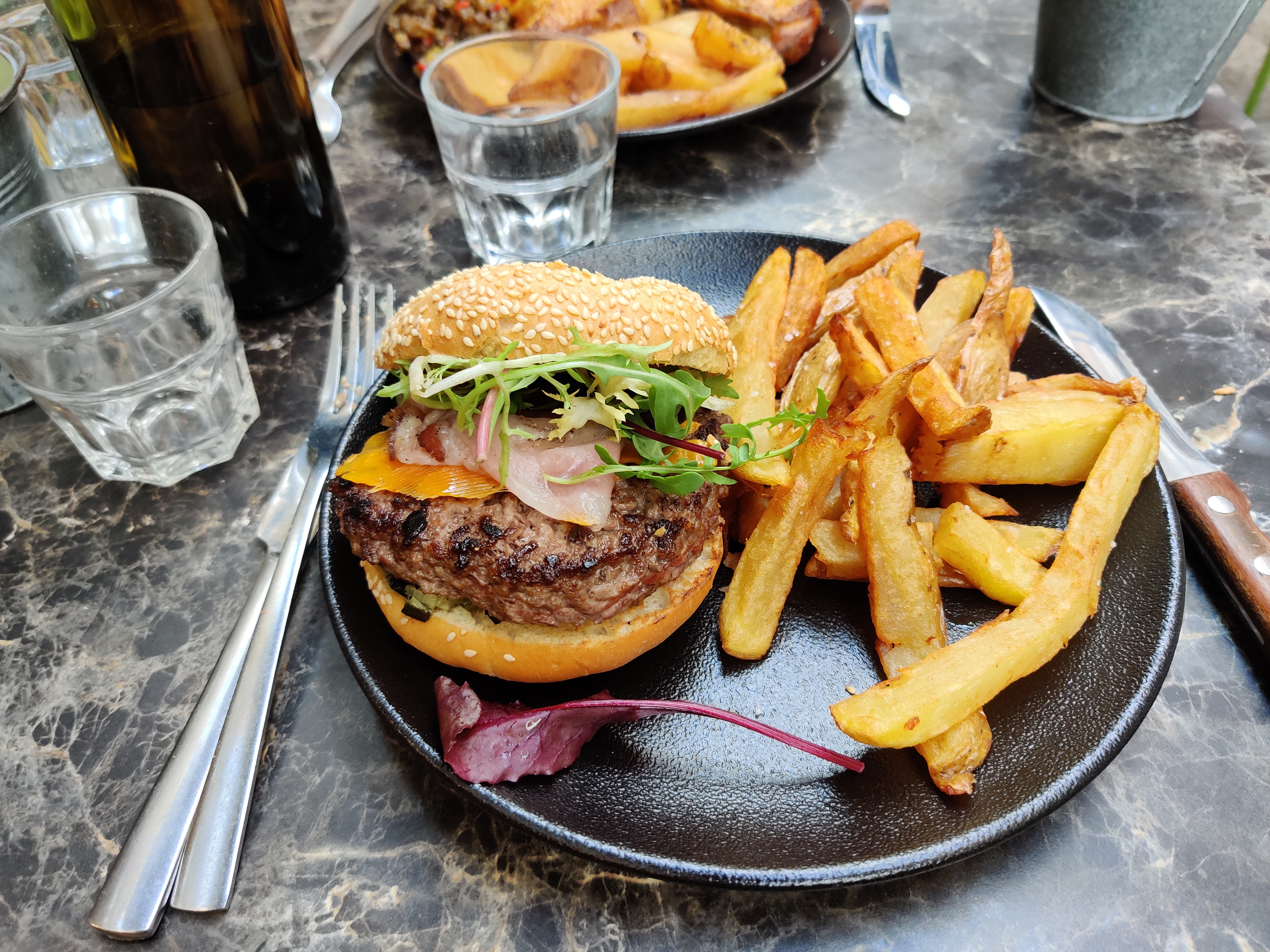 J’ai pris un plat du jour, un hamburger avec une sauce au truffe avec du bacon. Le pain était de la baguette alors que j’ai vu les clients d’avant avoir un hamburger avec du pain à hamburger. Je l’ai fais remarqué à la serveuse celle ci m’a répondu que c’était un hamburger français. Alors que j’ai vu de mes propres yeux les clients d’avant avoir un hamburger avec du pain brioché. De plus les frites suintaient l’huile.