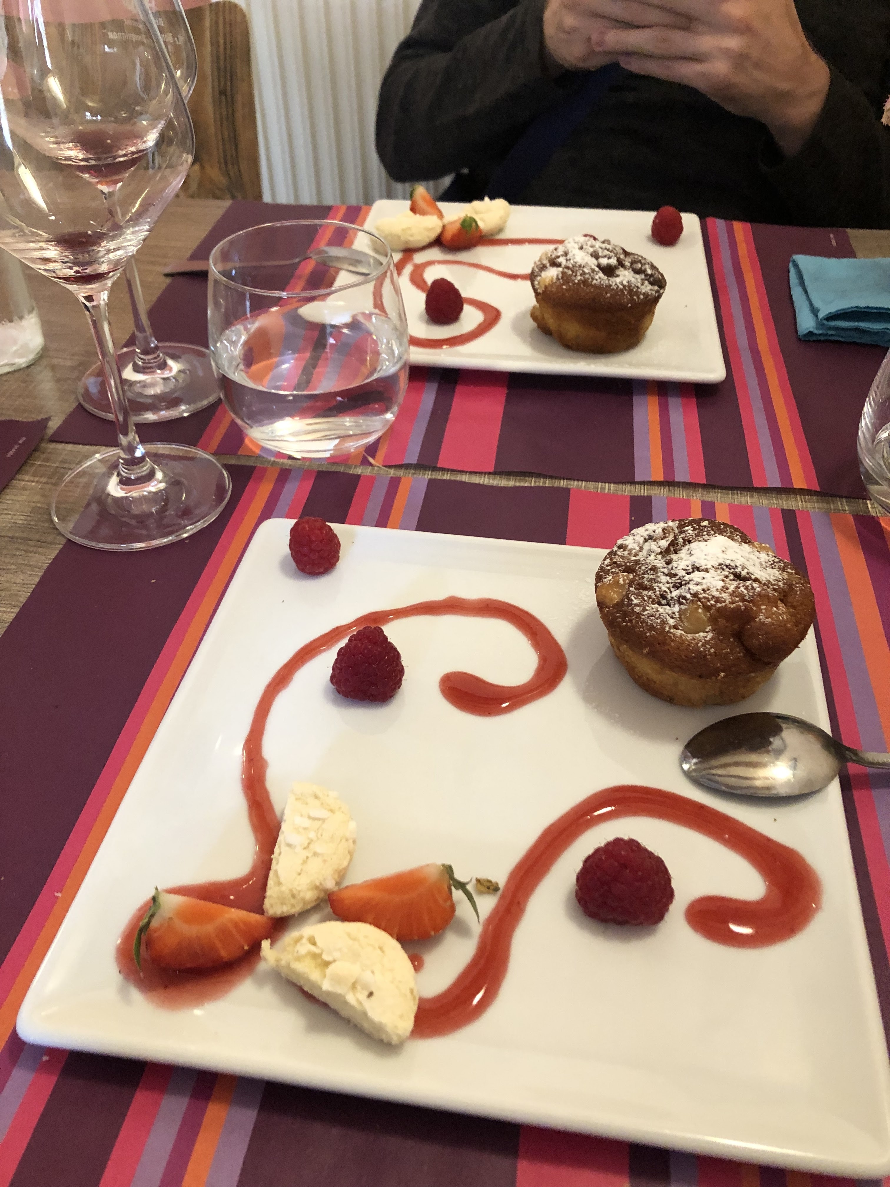 Bonne promotion de la cuisine et des produits bourguignons ! Pour les journées du Patrimoine, il y avait bcp de monde, du coup l'apéritif maison, accompagné de gougères, s'est fait attendre. Je serai indulgente pour le sauté de lapin à la moutarde à l'ancienne qui était un peu dur car ce jour là il y avait successivement des coupures de courant qui n'ont pas dû faciliter la tâche au cuisinier. La carte des desserts met dans l'embarras du choix : mon amie a pris une généreuse coupe bourguignonne et moi, un Vincenot. C'est un très bon moelleux aux pommes avec noix et noisettes sous un coulis de framboise. Le tout à 1 tarif raisonnable. La présentation est belle, les serveuses et le patron sont sympatiques, le restaurant est bien situé, à proximité du château.