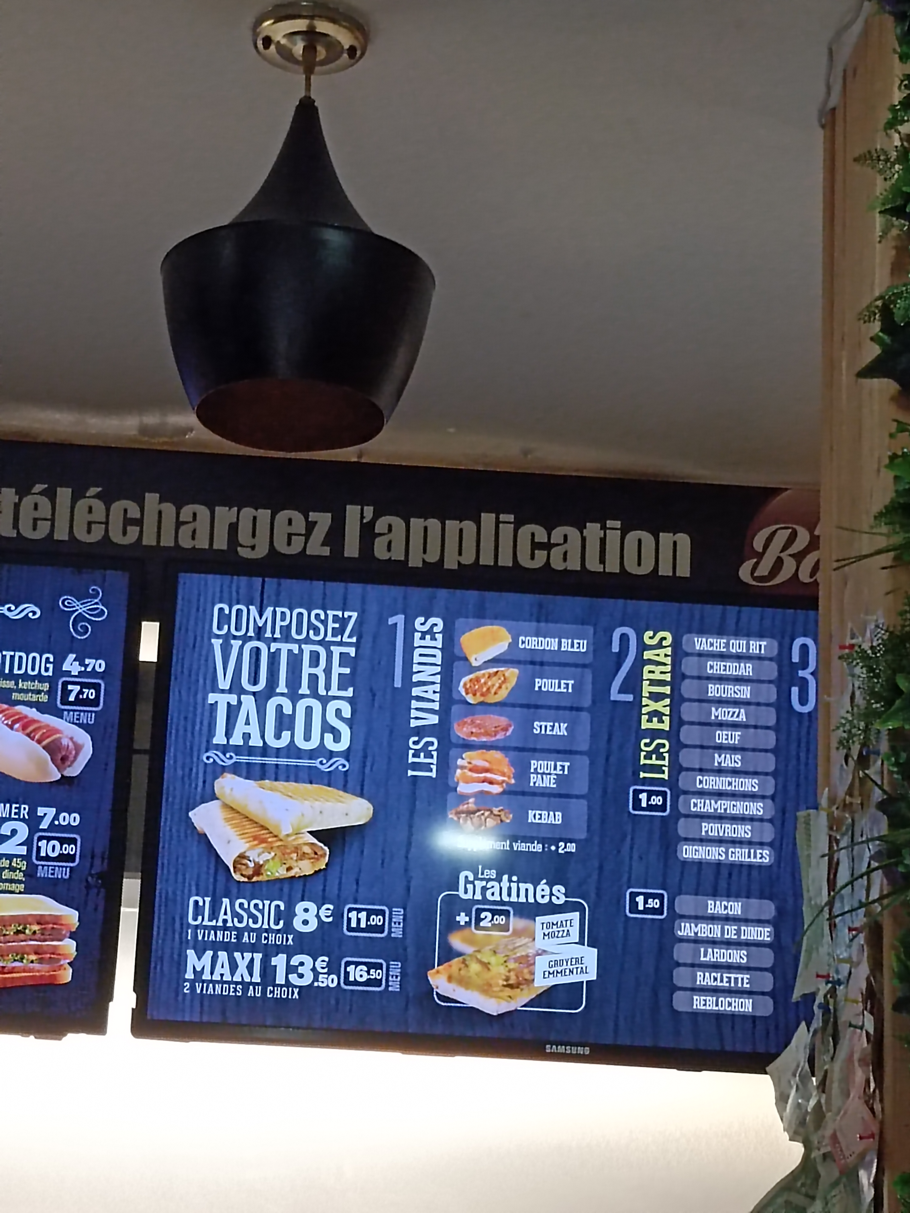 Établissement correct, personnel accueillant, mais tacos un peu chère en menu sachant qu'il n'y a pas de frites et qu'il n'est pas excessivement grand.