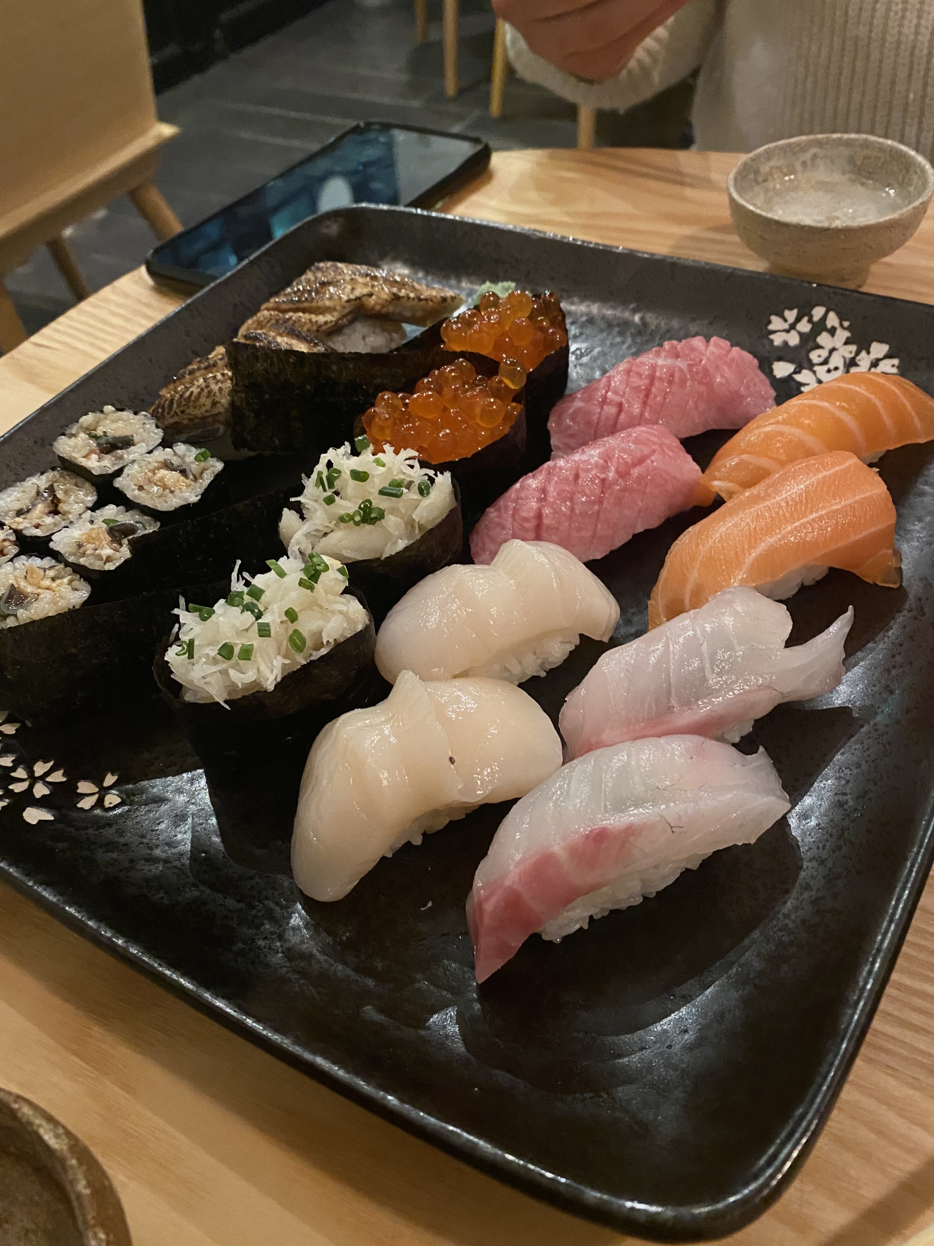 Restaurant japonais avec un vrai maitre sushi. C'était un délice et j'ai pu tester pour la 1ere fois l'oursin (j'ai pris sous forme de temaki et gunkan). Le thon rouge gras est à tomber par terre ♡ oui c'est cher la pièce de temaki et gunkan (9e en moyenne) mais ca en valait le coup lol