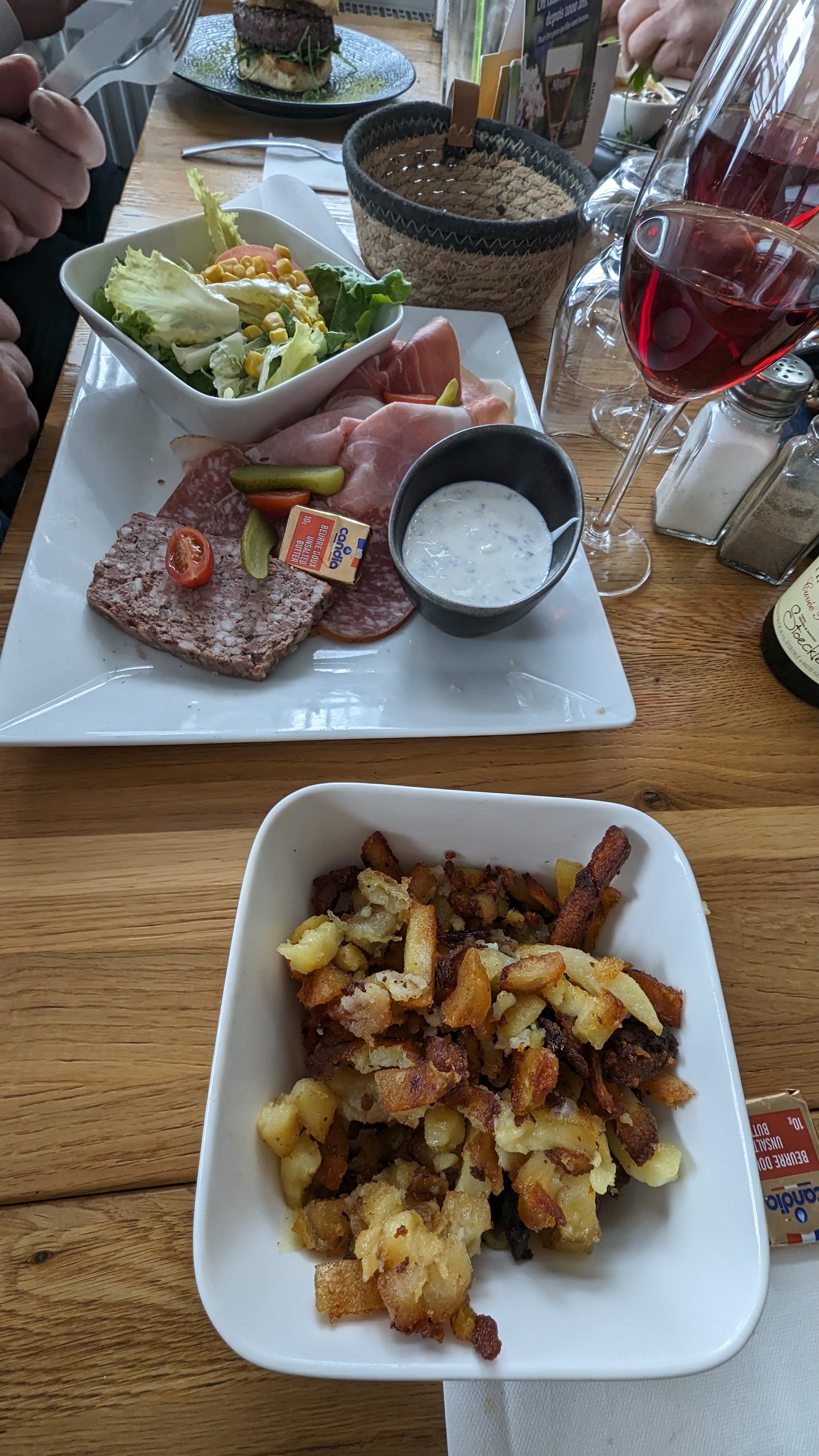 Miam! J'ai vite pris une photo de mon carpaccio avant qu'il ne soit englouti. On peut voir le tartare de 350gr juste derrière en train de se faire dévorer. Pour manger tranquillement en semaine des produits de qualités au bord de la moselle. Pas de circulation autour. Un vrai havre de paix. J'aime le soin particulier apporté aux produits locaux. Le vin blanc de Sontag 🤪🍷. Serveuse très sympathique.