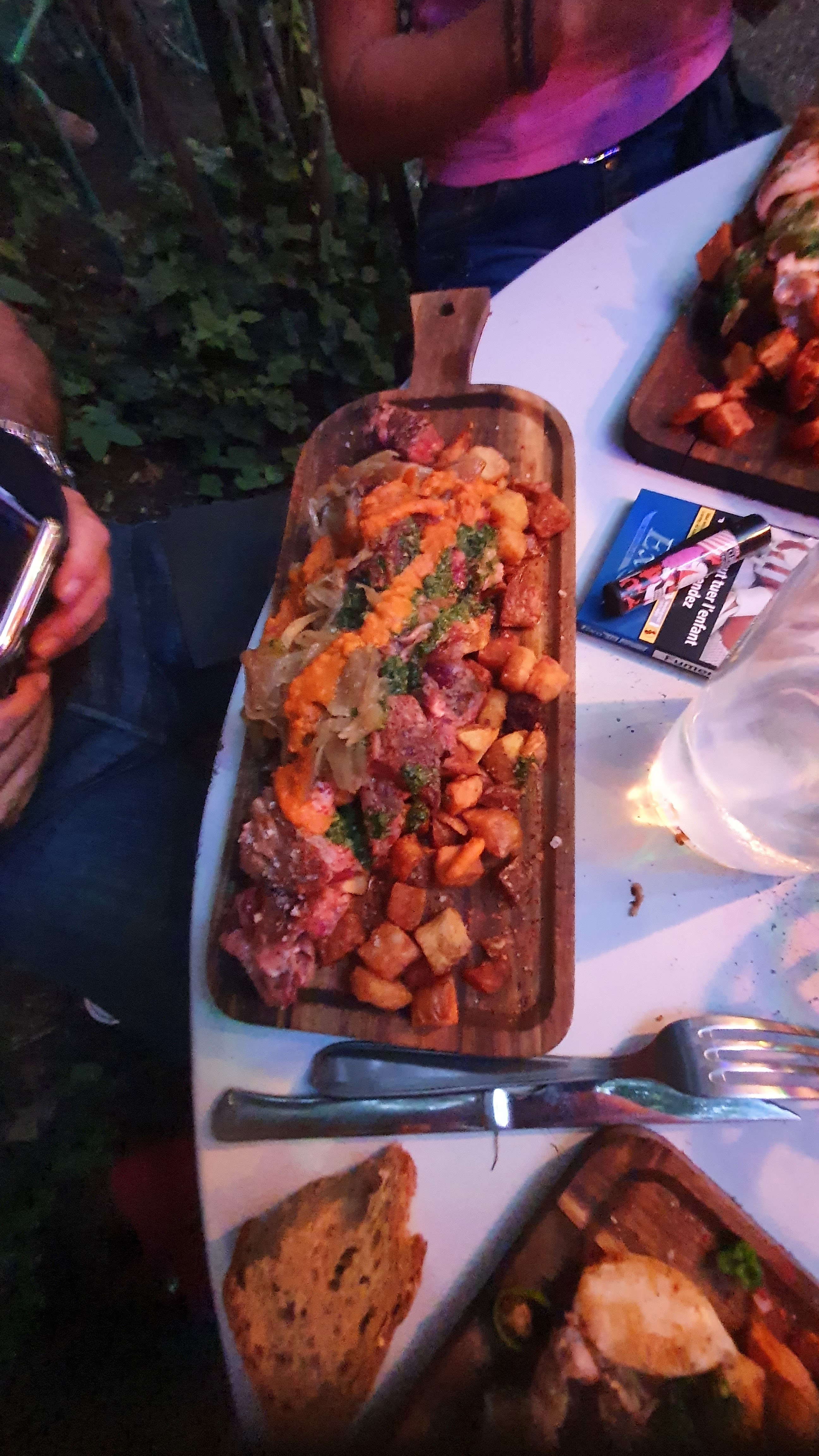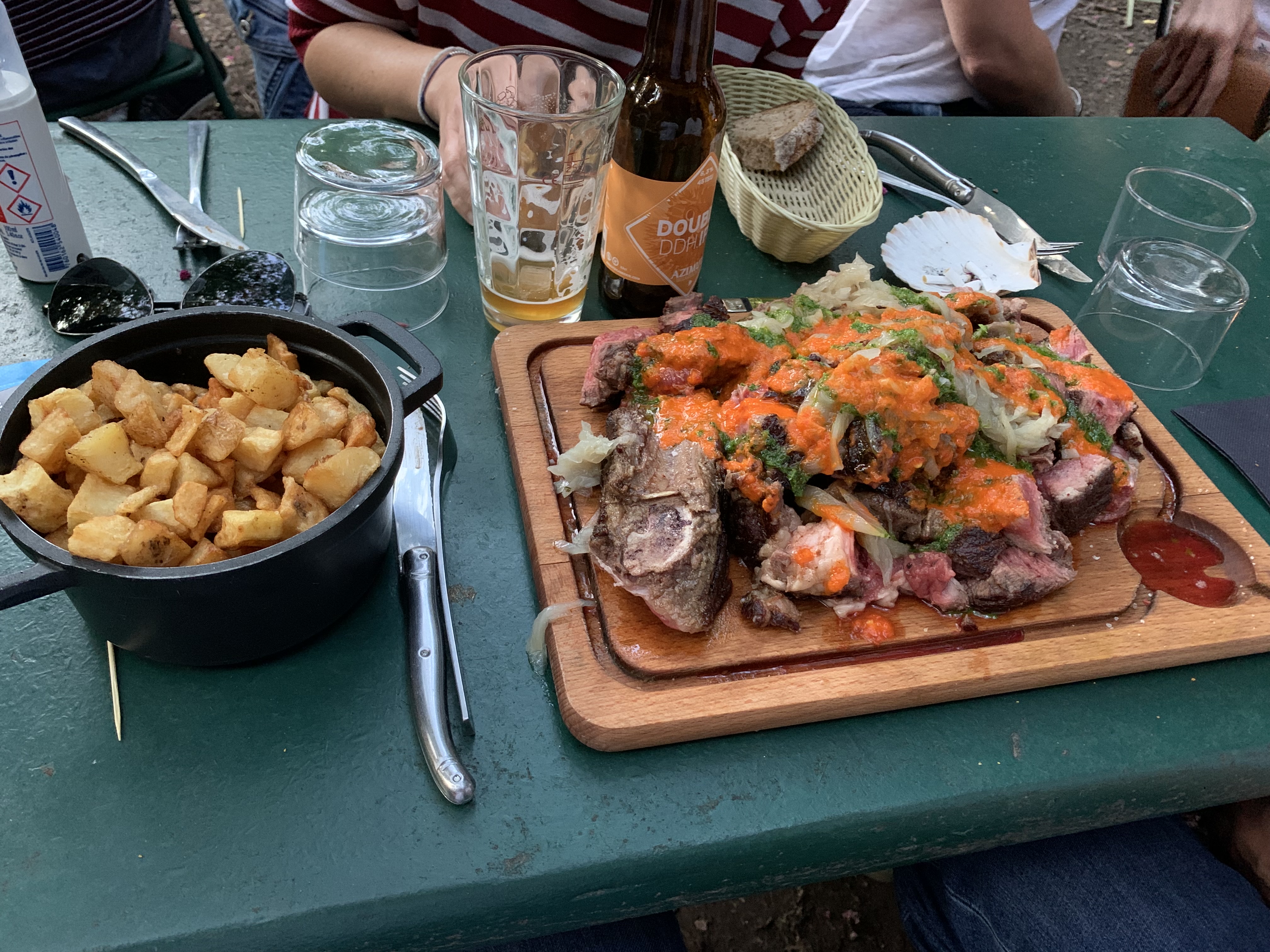 Dès l’accueil, vous êtes plongés dans une ambiance conviviale et très champêtre, le personnel avec leurs teeshirt marin aux lignes bleues vous accompagne durant le dîner avec courtoisie et efficacité. Le mobilier du restaurant est disparate comme dans nos jardins, on se croirait à la maison… Ambiance guinguette, chansons françaises diffusées par des enceintes, guirlandes d’ampoules de couleurs. Avant d’être placé à votre table, une bonne odeur de viande grillé vous mets en appétit, un barbecue est en plein travail.. la viande côtoie le magret de canard et les chiperons, on voit plus loin les pommes de terre taillées en cubes attendant d’être mis sur la planche de bois. Les personnes qui sont là et qui dînent autour de nous sont joyeuses et détendues, pas mal de grandes tablées de jeunes gens, de femmes entres elles, de couples et de familles. Pour commencer, nous prenons une planche mixte pour trois, composées de charcuteries, de fromages, de salades, de cornichons, de piments aigres doux. Puis trois planches, (car nous sommes trois), entrecôte, magret de canard et chiperons,. Très très copieux !! Doggybag assuré… Succulent !! Viande bien assaisonnée avec cette petite persillade ail et persil . Le bordeaux rosé convient bien à ces mets goûteux Malheureusement pas assez de place pour le dessert qui je sais viens d’une très bonne boulangerie de Bacalan . Une première qui je pense ne sera pas la dernière. Attention il faut réserver car c’est un endroit prisé et je pense connu