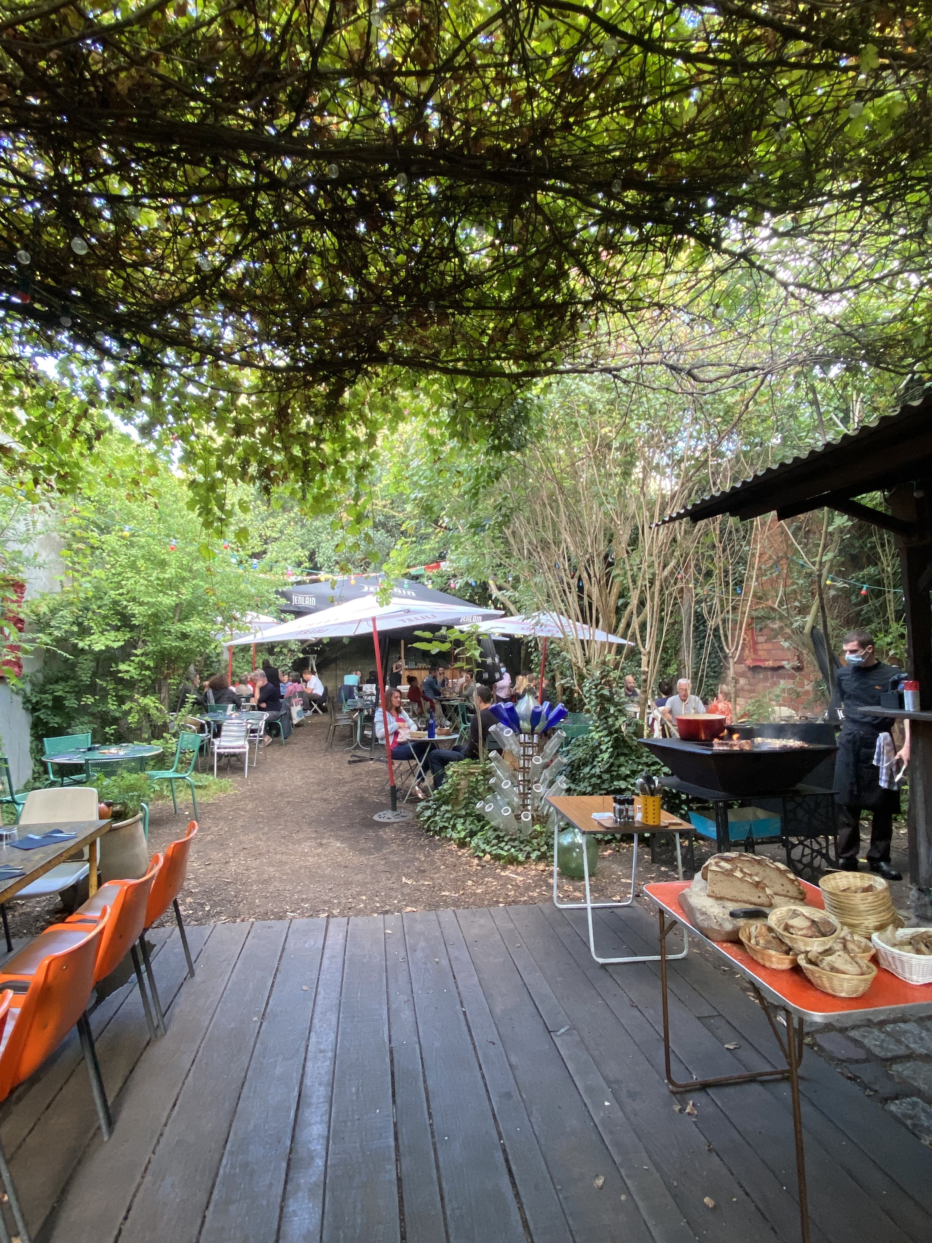 Très belle adresse dans un cadre bucolique et enchanteur. Ce jardin invite à des soirées entre amis autour de belles bouteilles et d’une belle côte de bœuf. La carte propose une sélection de produits à partager et cuites sur brasero, Belle carte des vins , Attention ça peut monter vite sur l’addition car autant le prix des bouteilles de vin est très raisonnable, autant celui des gin to est un peu élevé !! Une suggestion : proposer des légumes grillé avec la côte de bœuf On reviendra