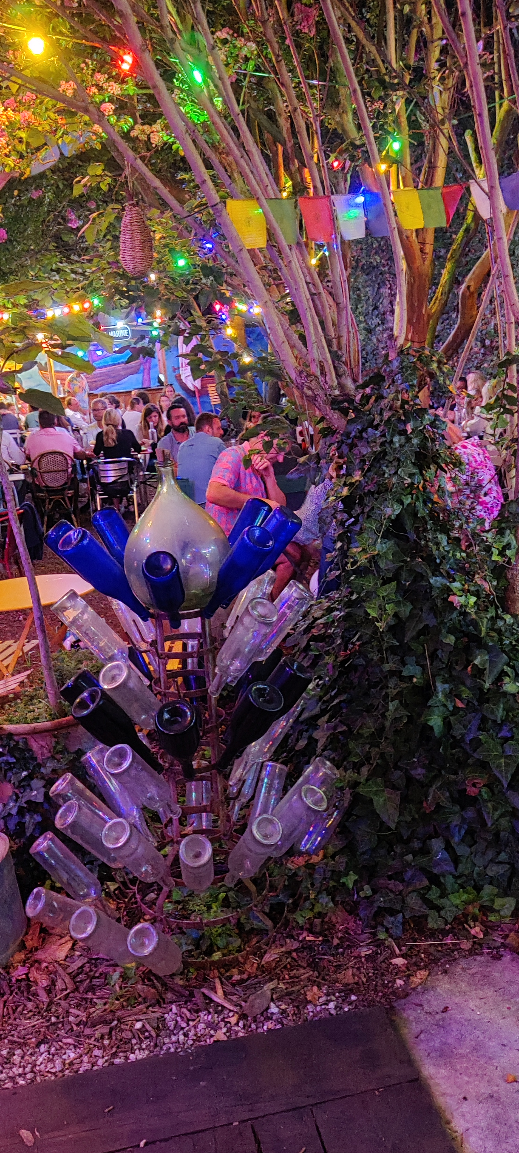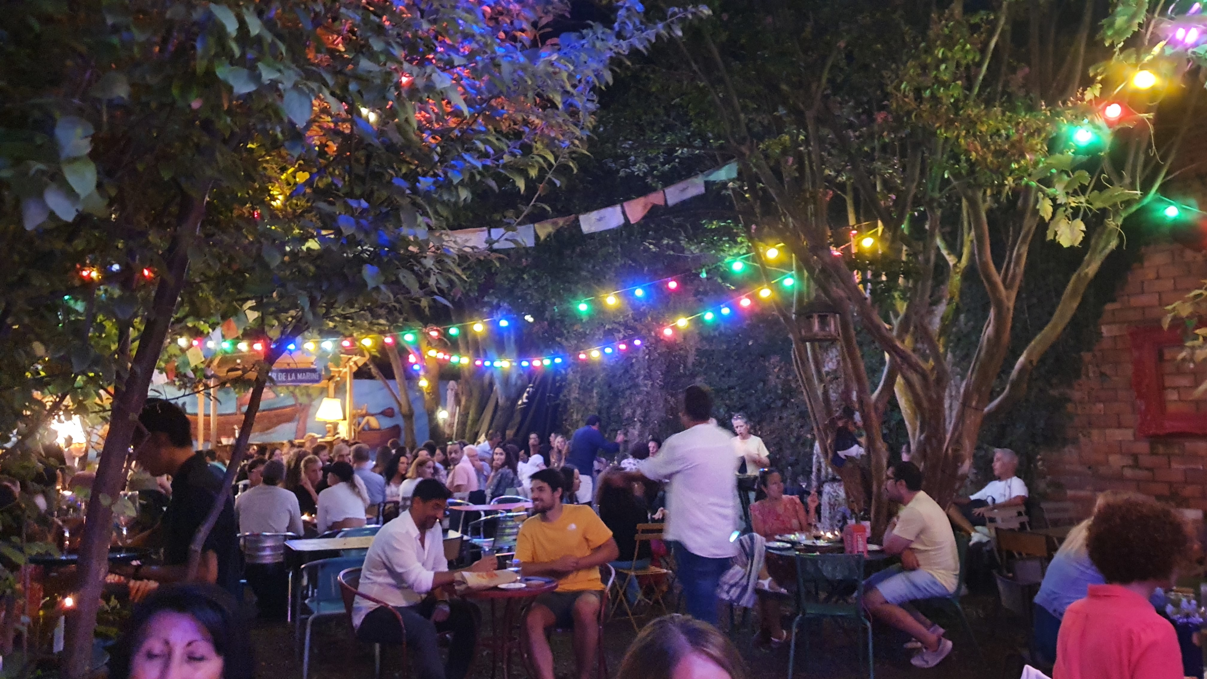 Les mots me manquent (et c'est assez rare pour être souligné) pour parler du Bar de la Marine. J'en reviens, là, à l'instant et je n'arrive pas à redescendre sur Terre. Pour commencer, l'endroit… C'est une machine à voyager dans nos plus doux souvenirs d'enfance, c'est une guinguette sans âge, c'est une madeleine de Proust où rien d'autre que l'instant présent ne compte car le temps s'y arrête. La végétation fait ce qu'elle veut, les fleurs roses viennent couronner votre chevelure, les lampions rendent le jardin intimiste, les bougies sur les tables offrent du romantisme. Ici il y a une touche de magie… Ensuite les membre du personnel, ils sont tous si chaleureux, aux petits soins, souriants, aimables Ils ont l'air heureux de travailler ici, ils ont l'air de s'aimer, on est reçus par une famille. Tous tellement choux qu'on voudrait leur faire la bise en partant et surtout leur dire à bientôt car cet endroit rend accro dès la première visite. L'ambiance y est réconfortante, les tracas de la vie restent dans la rue. L'ambiance musicale y est discrète mais géniale, elle fait remonter les jolies moments enfouis dans nos mémoires. Les voisins de table rient, chantent, s'amusent et semblent passer un aussi beau moment que vous. Et l'essentiel dans un restaurant, faudrait pas l'oublier quand même, le repas… La cuisine est sans chichis, c'est une cuisine du cœur, comme celle que nos grand-mères nous concoctaient le dimanche. Les cuissons plancha sont faites dans le jardin sur un brasero qui distille une fabuleuse odeur. Les portions sont ultra généreuses, les plats aussi beaux que bons, la cuisson de la viande est parfaite, les chipirons sont à tomber par terre, les dés de pommes de terre caramélisés à souhait, On en lècherait son assiette!!! Pour conclure, ce restaurant est comme la boite à secret de notre enfance que l'on ouvrirait une fois adultes. Il fait remonter des émotions oubliées qui font chaud au cœur. Cet endroit a une âme et elle est sublime.