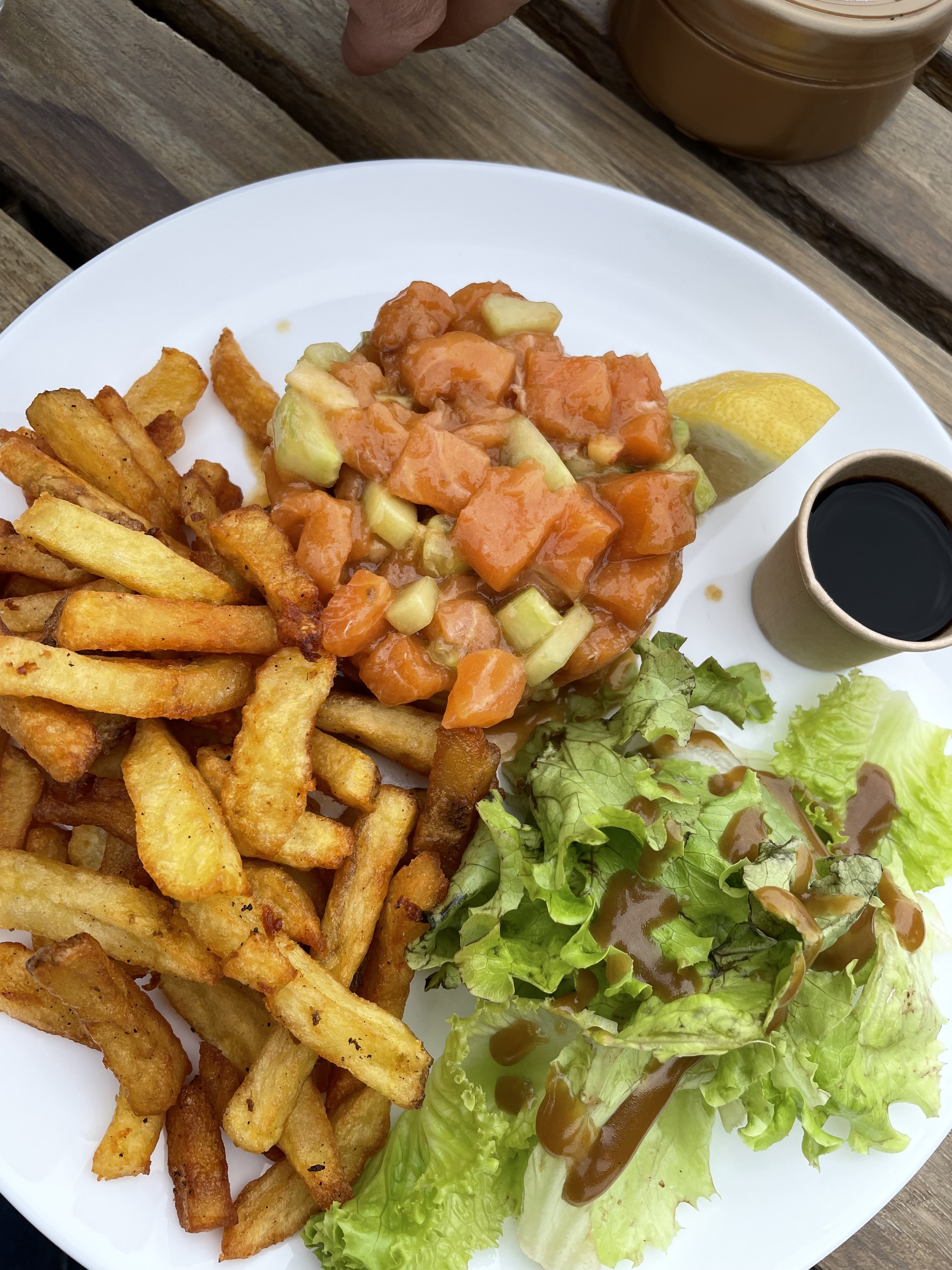 Bonjour. Je pense que les avis son plus que douteux. Nous avons voulu faire confiance et essayer ce snack très déçu. Ouverture note midi mais c l'horaire à la quelle arrive le personnel. Prise de commande 12h15 prêt servie a 13h pour la première commande. Hygiène douteuse (gobelets avec trace de sirop table en bois collantes). Le fish and chips bon mais la cuisson des frites pas maîtrisé (calibrage des frites). Manque d'ombre. Tarif un peu onéreux pour le service. Le point fort personnel agréable et professionnel.