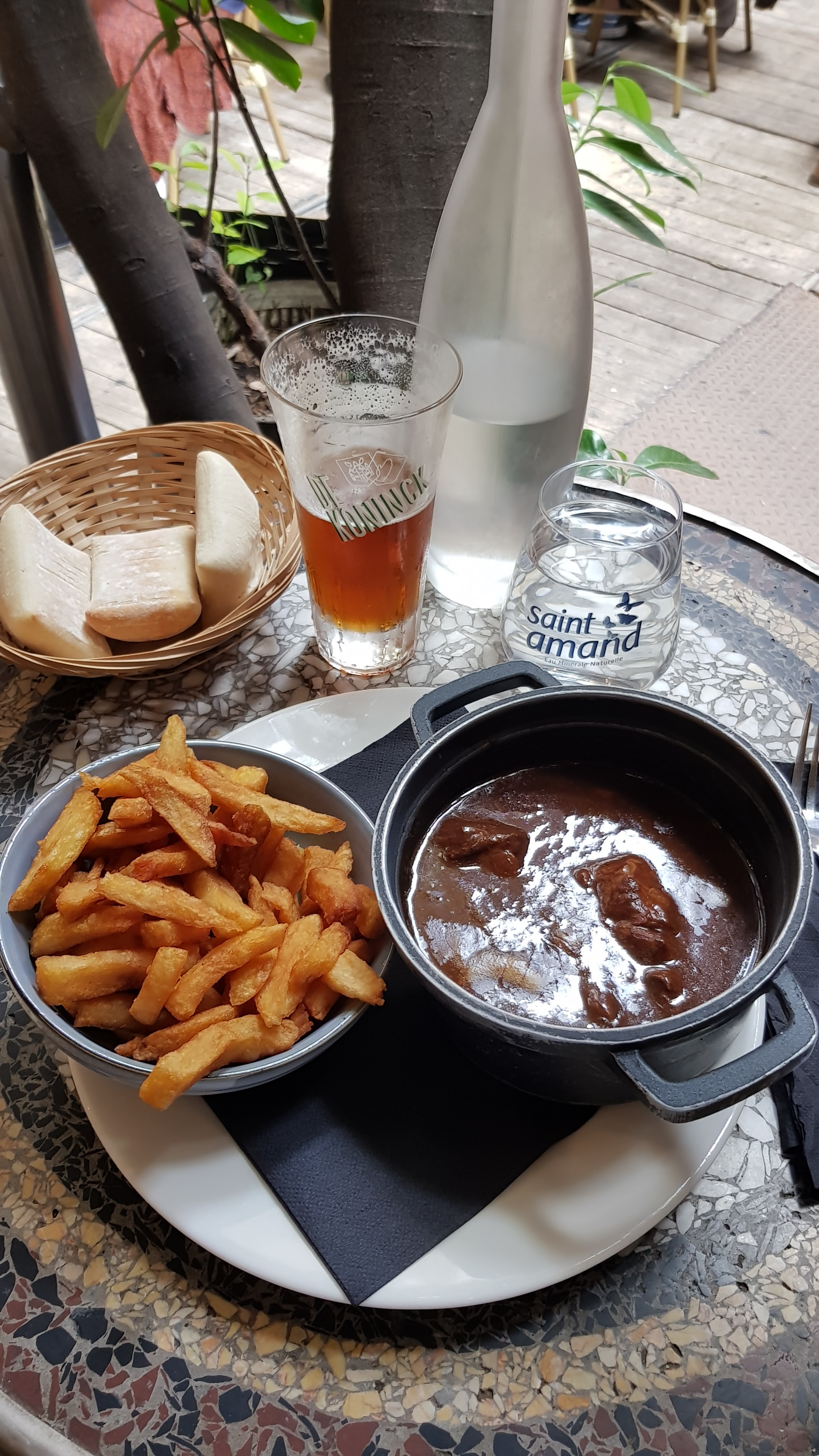 1ere et dernière fois. Carbonnade flamande banale avec des frites surgelées molles et sans goût (pour un restaurant typique des frites fraîches ce serait la moindre des choses). Le pain est décongelé et sans goût et par chance je suis d'abord tombée sur 2 morceaux de pain dur, impossible de croquer dedans. Enfin la crème brûlée à la chicorée, je cherche toujours le goût de la chicorée par contre j'ai bien trouvé une énorme dose de sucre.... pas fini le dessert. A éviter !