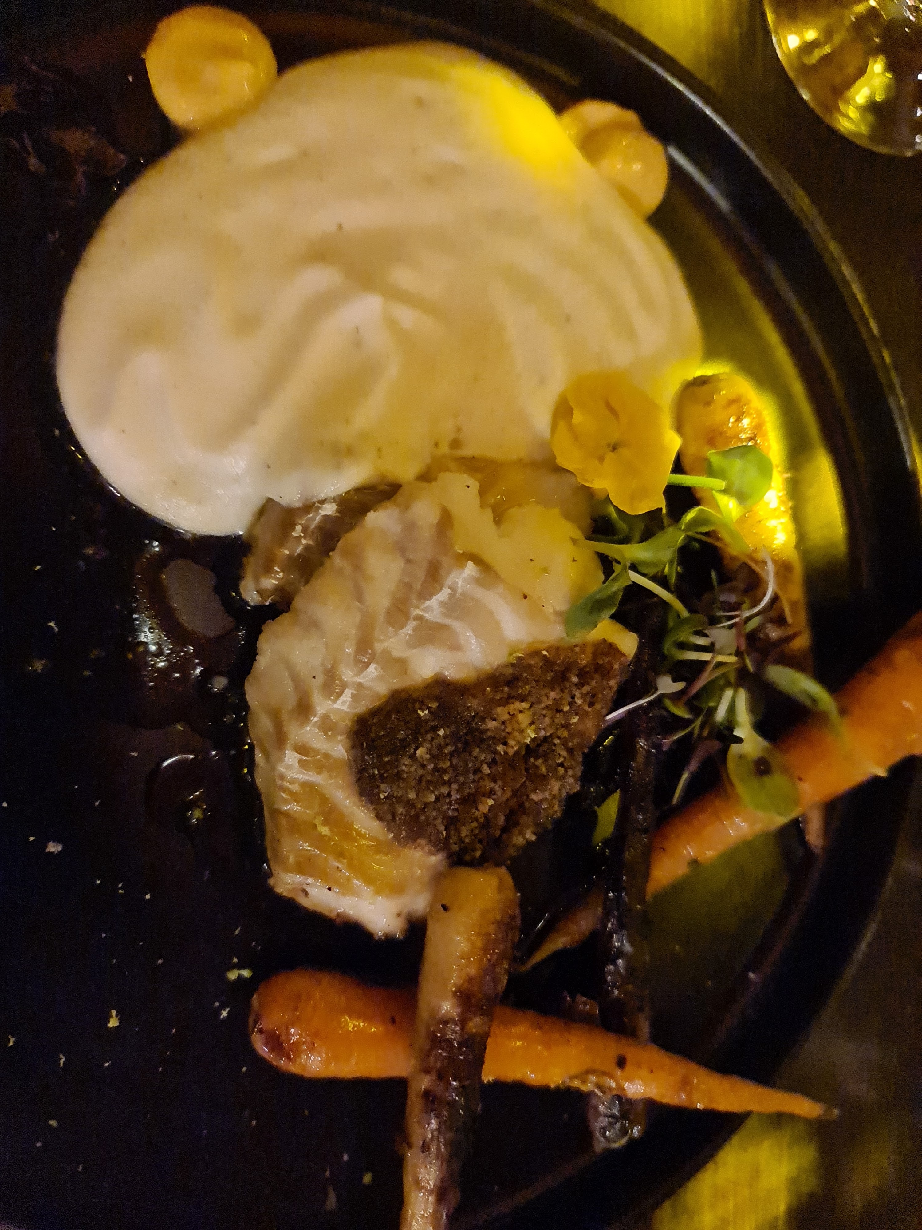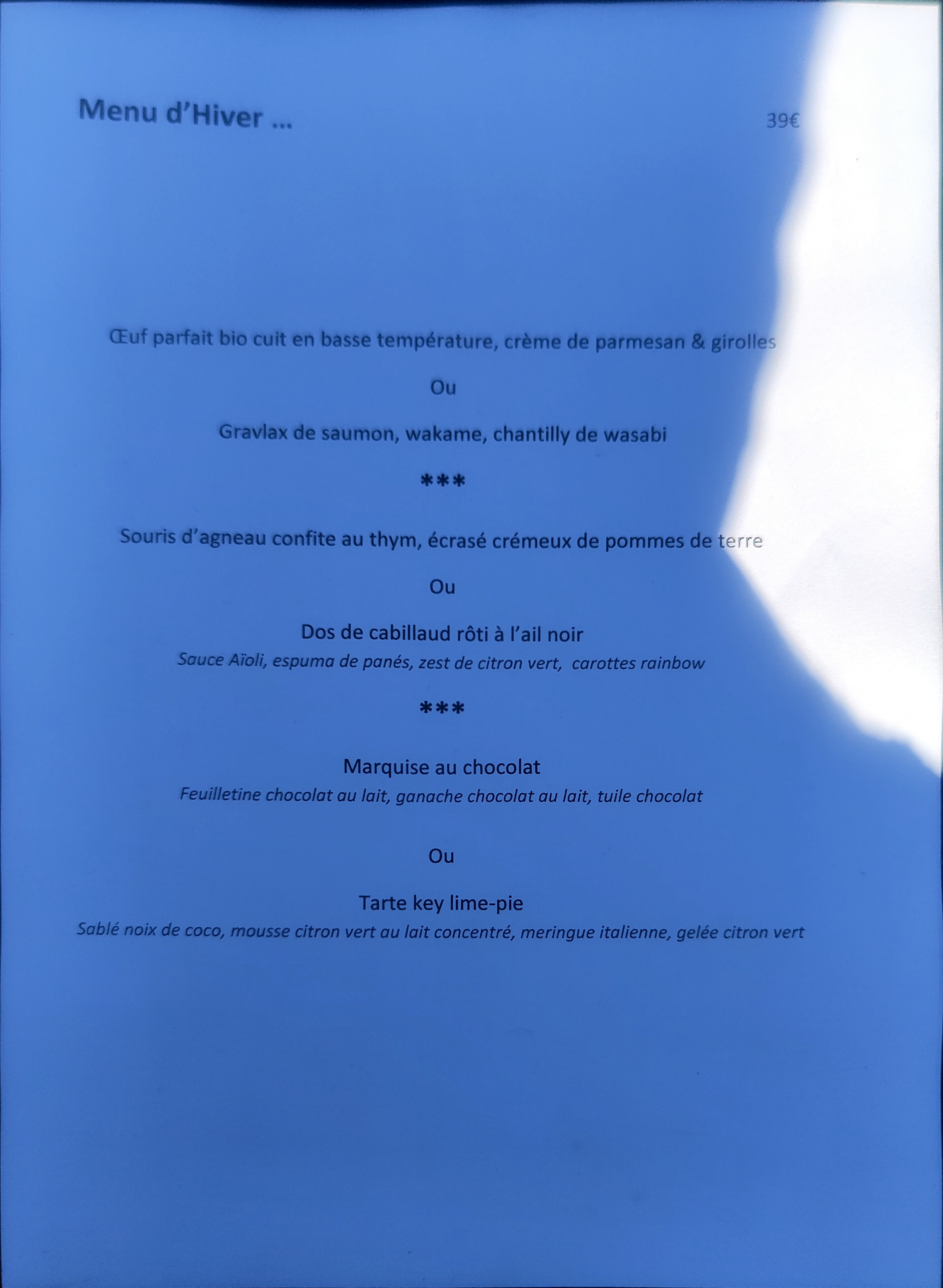 Je ne vous conseille pas ce restaurant car menu imposée , quand on ne mange pas de viande , ni de poisson et que le serveur , me répond vous avez qu’à prendre du saumon ? C’est faire exprès ? On m’as servit donc des coquillettes à la « truffe « je la cherche encore , c’était des pâtes au beurre plutôt … Dommage en tout cas si vous ne voulez pas manger dans le noir avec le flash de votre téléphone et vous entendre parler , n’allez pas las bas , dommage le cadre est jolie mais le reste ne suis pas …