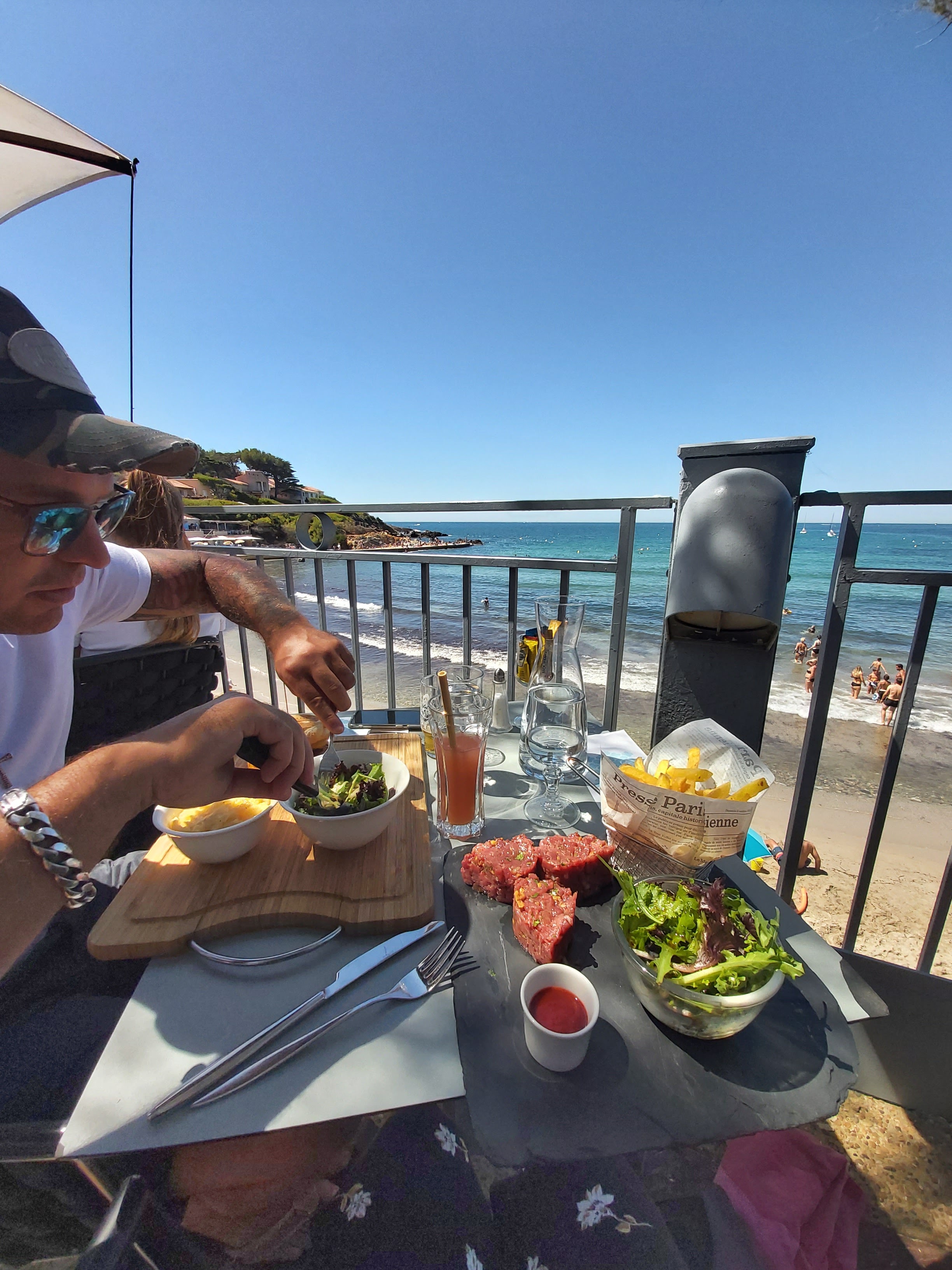 Une telle promiscuité en pleine période de pandémie, 4 ème vague, me dissuade d'être cliente, c'est sûr le restaurateur ne prend pas toutes les mesures pour protéger ses clients..👎Cela se vérifie aussi malheureusement envers les plagistes situés en contrebas du restaurant. Il y a quelques jours, lors de la mise en place du service de midi, un employé a malencontreusement laissé tomber de la table un verre qui est venu s'éclater dans sa course sur le parapet de plusieurs mètres de hauteur et terminer sa course en une multitude de morceaux tranchants sur ma serviette. Je me suis coupée en voulant les enlever, un employé est descendu avec un seau à champagne 5 minutes plus tard, en déclarant être désolé à deux trois reprises. Je ne pense pas qu'il ait mesuré la gravité de ce qui venait de se produire, si je n'avais pas tourné le dos au mur et avais été couchée j'aurais pu être blessée la figure, aux yeux.. cela semblait tellement naturel aux autres plagistes et moi même, qu'un geste soit fait, un café, une boisson... Rien !! Ce manque de discernement et de savoir vivre n'a pas poussé le restaurant à prendre des mesures pour éviter de tels incidents, les barreaux n'ont pas été recouverts par une protection La prochaine fois ce sera un papa qui viendra hausser le ton et faire un scandale au restaurant,ou cela finira aux urgences et là peut être que ça bougera. Ah, au fait, j'ai oublié de mentionner la sono trop forte qui gêne les plagistes.. bcp de choses à améliorer..