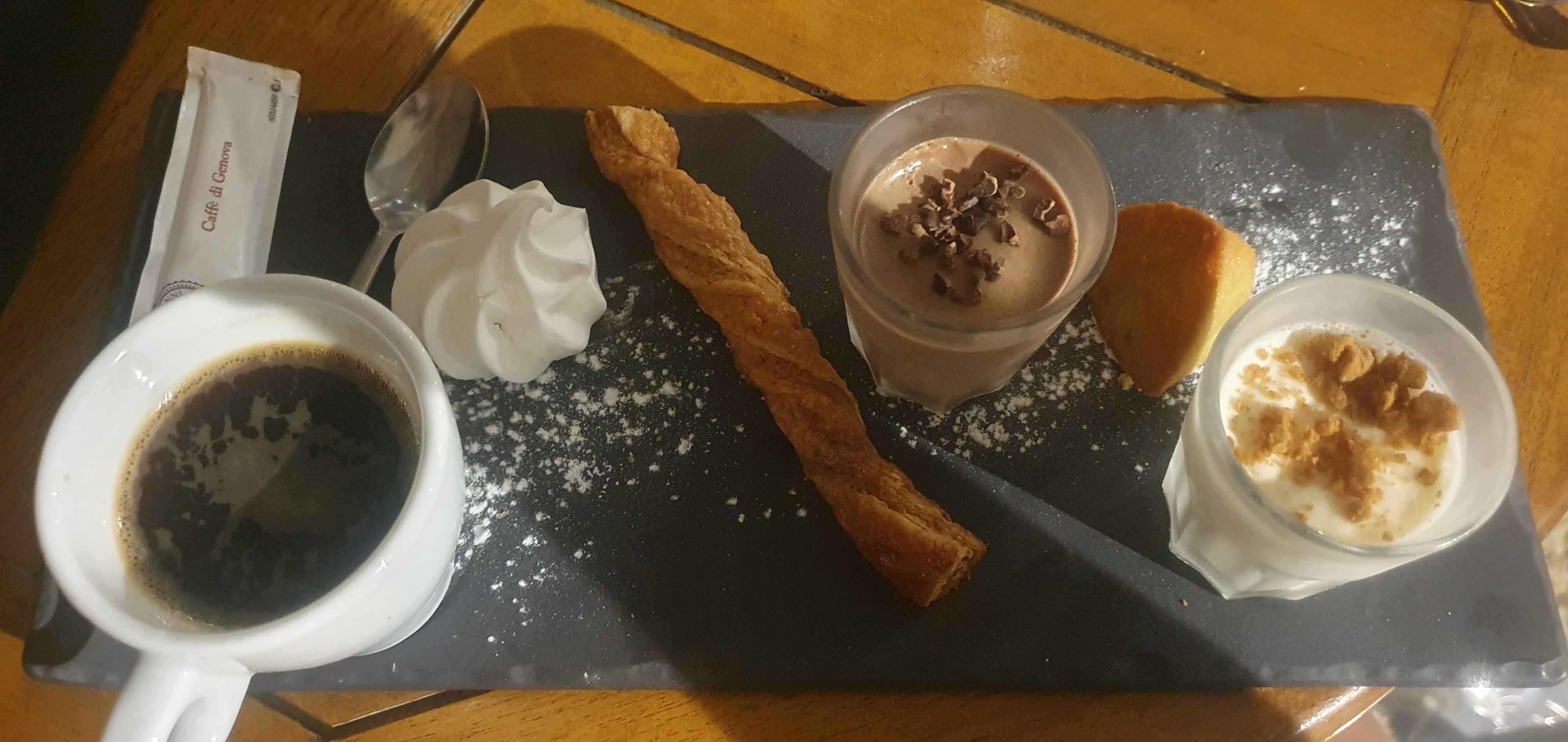 Service déplorable, seiche pas cuite, tartare plus que moyen, et un café gourmand à 13eu avec 2 pauvres verrines contenant 1 cuillère à café chacune(voir photo). Note à 300eu et même pas un digestif offert.