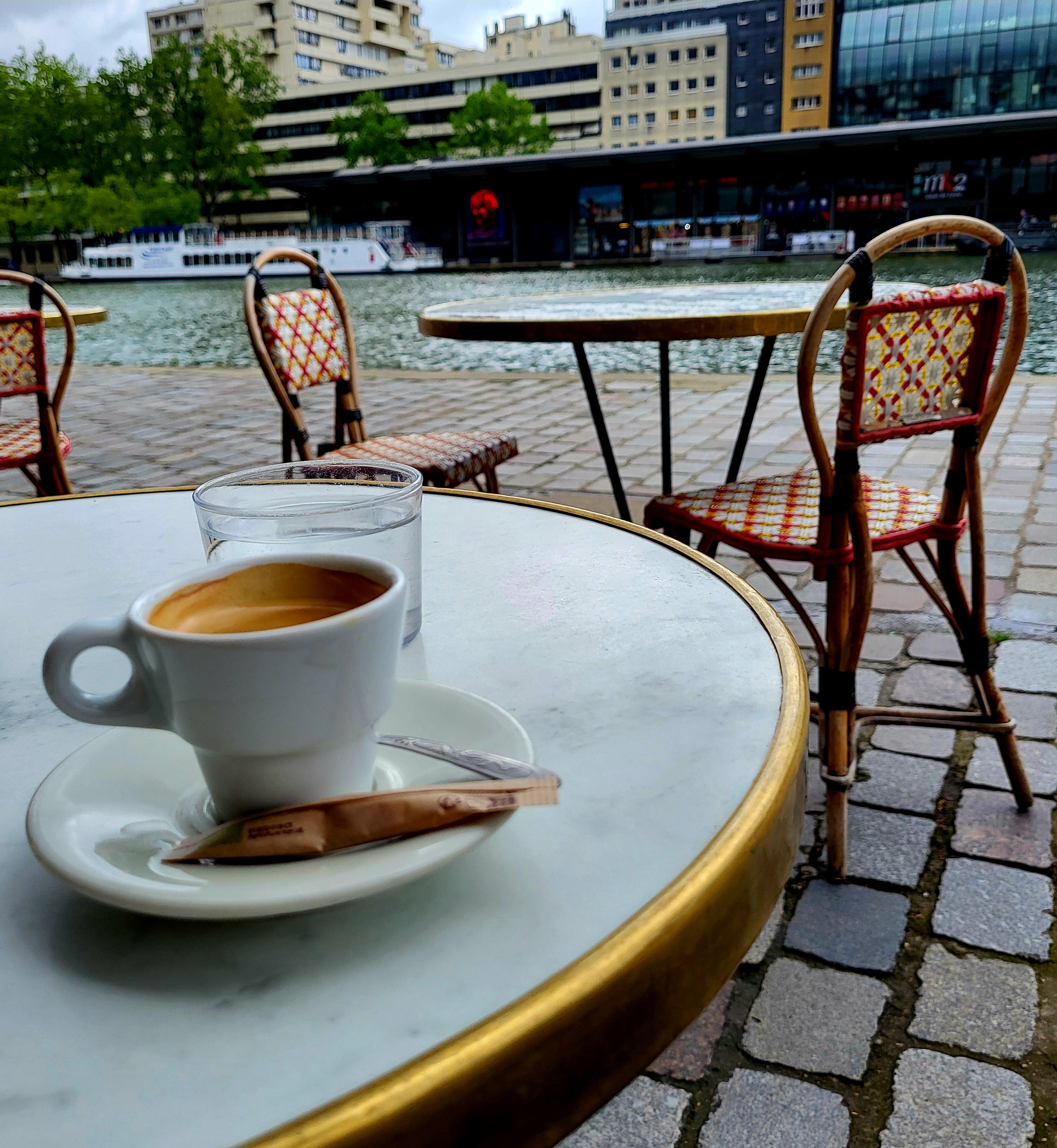 2€80 pour un café ? On se croirait à Venise ou à Cannes. Mais non, c'est juste le Bassin de la Villette. Un peu partout dans le même quartier on peut boire un bon café ailleurs en terrasse, toujours à côté du bassin, à presque la moitié du prix.