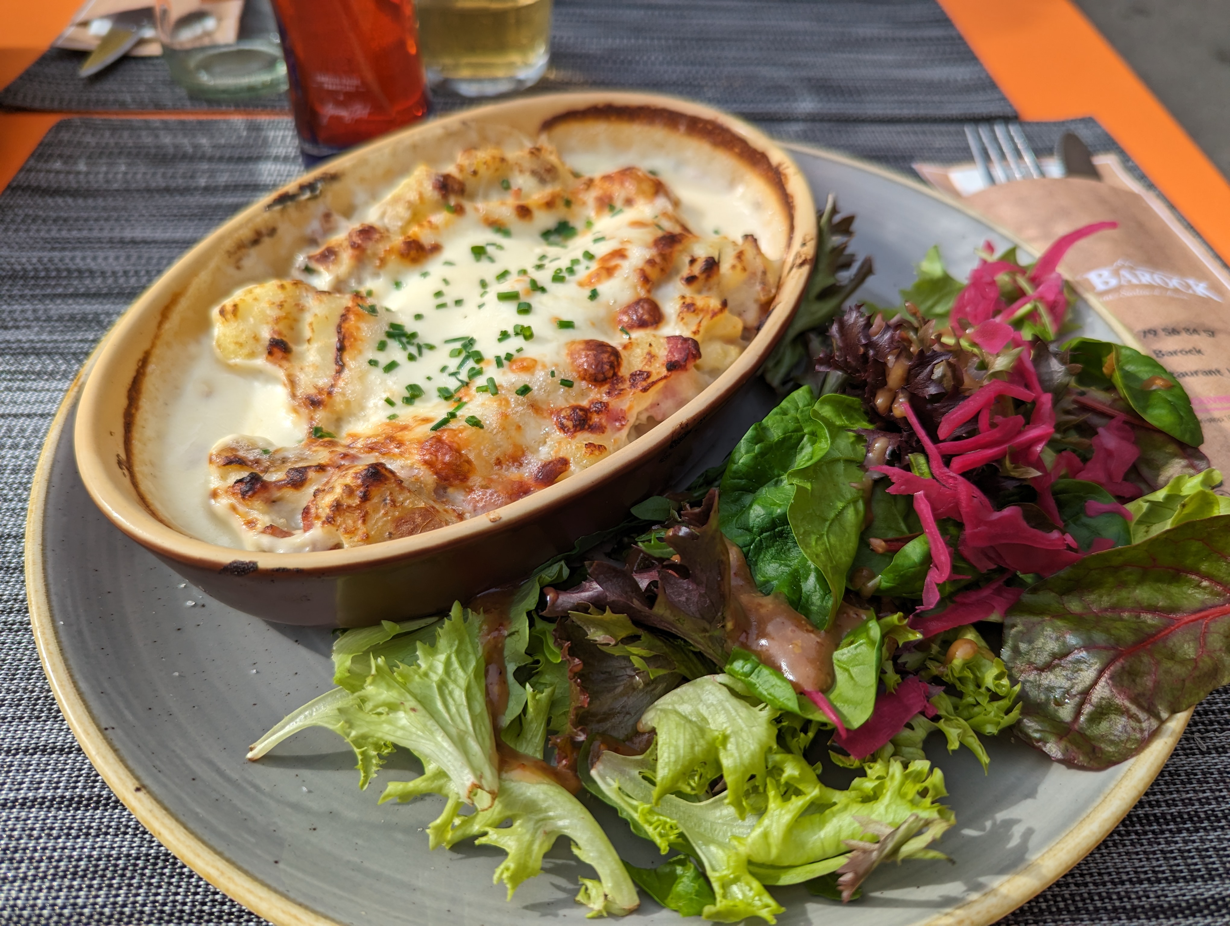 Bonnes fondue et tartiflette, et copieuses. Bonnes bières belge comme la chouffe. En plus au Barock c'est possible de commander une fondue pour une seule personne. Et les pizzas sont bonnes et généreuses .