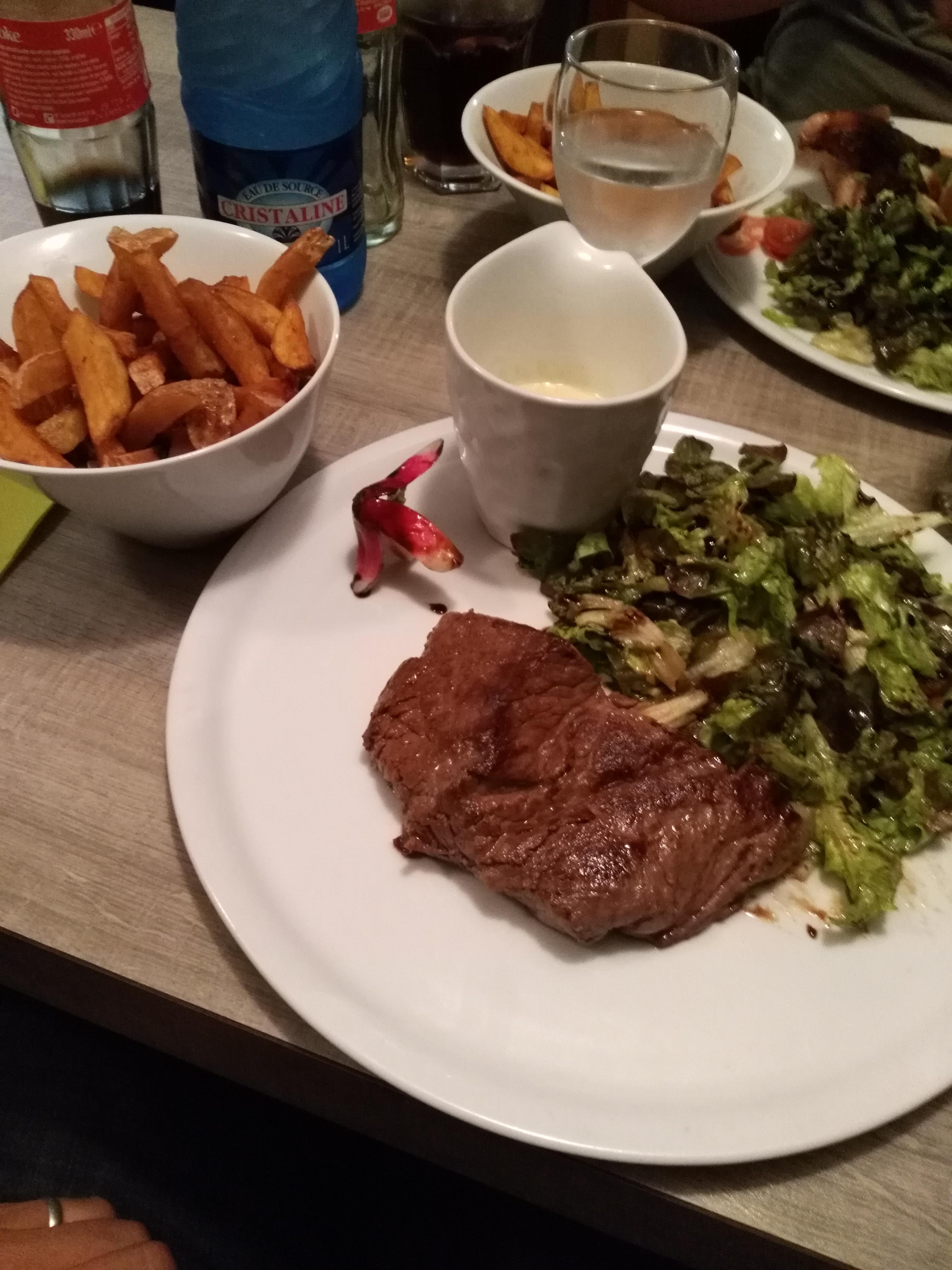 Menu du jour, une brochette de bœuf (tendre comme rarement dégusté) accompagné d’un gratin de pdt, légume et sauce au poivre. C’était succulent, je me suis régalé 😁