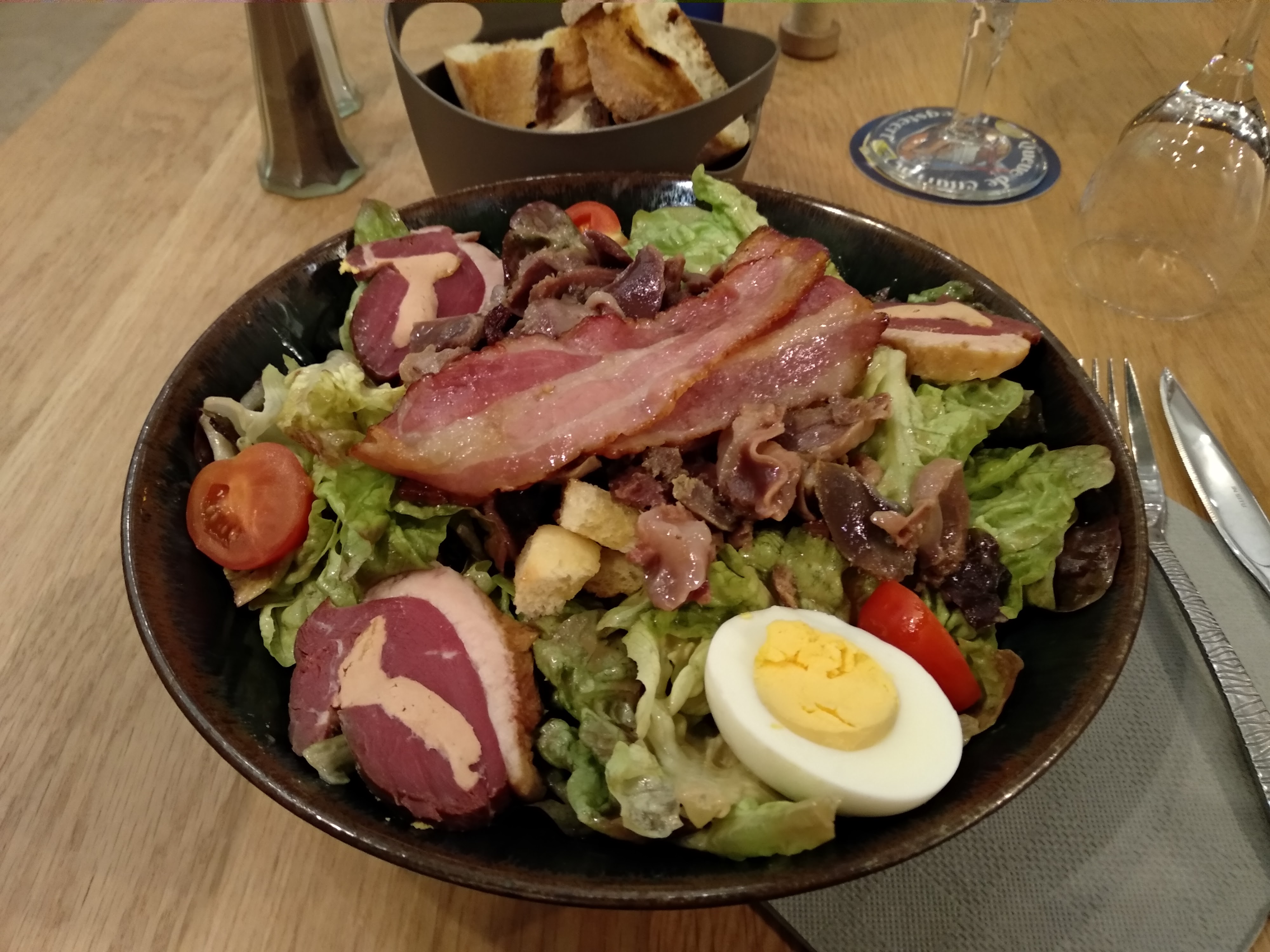 Le duo pizza salade ( pour moi salade de seiche et pizza lozerienne) très agréable et très copieux Un tout petit reproche la mise en bouche OFFERTE ( je le precise avec honneté)avec l apero est identique que vous soyez solo ou duo Le prix est très correct et la qualité des produits est au rdv