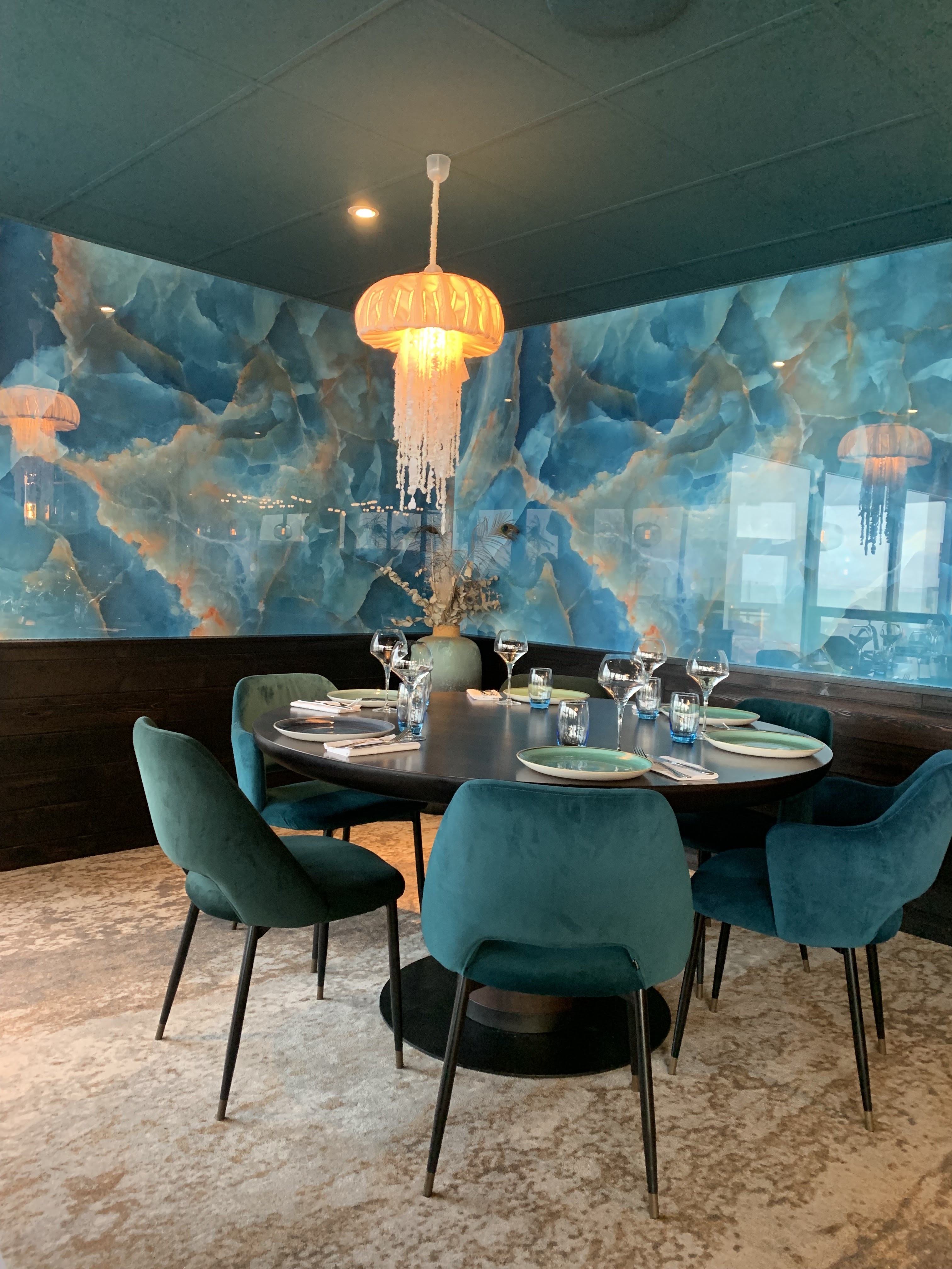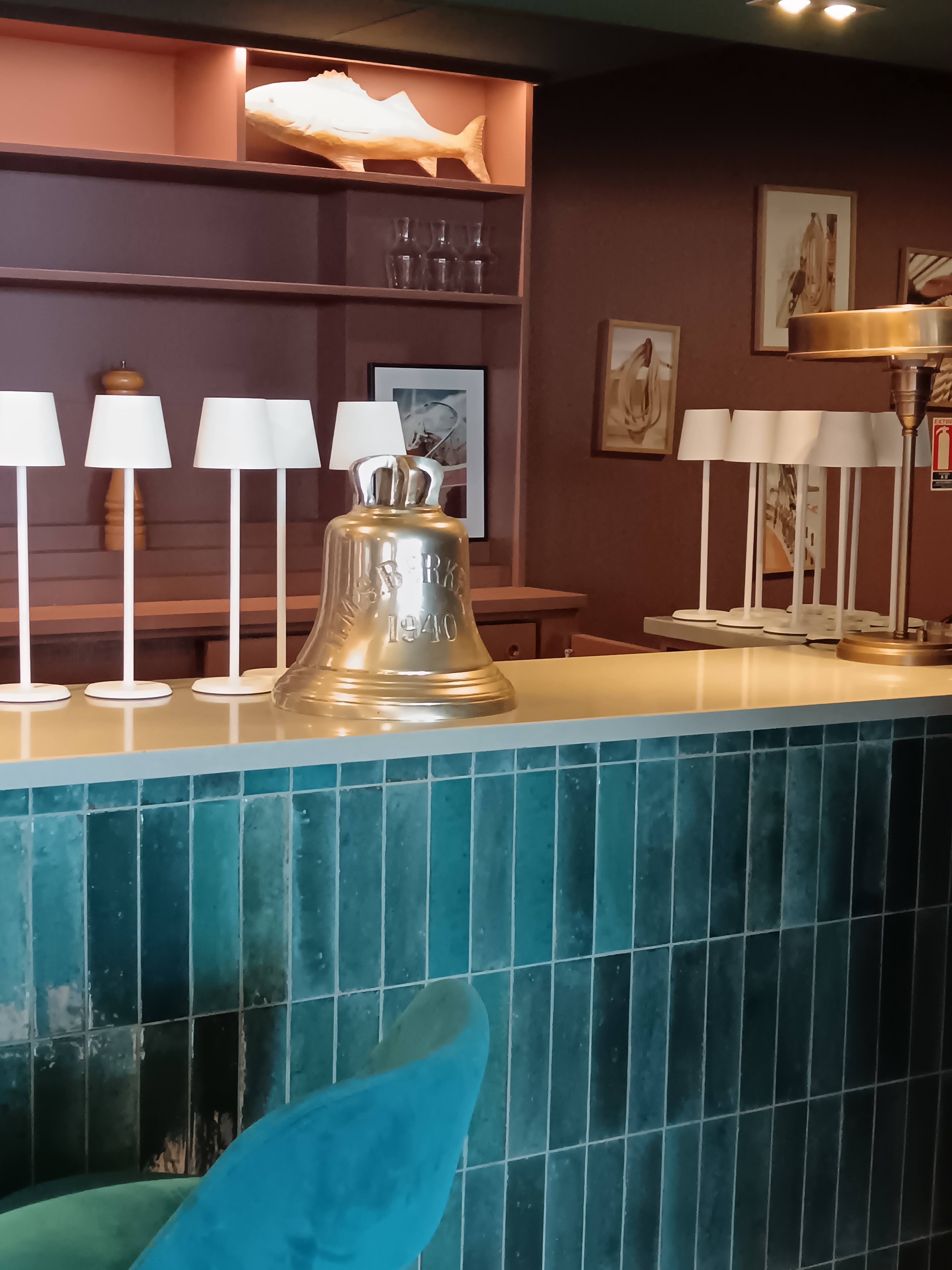 Un lieu dont j’ai toujours entendu parlé, mais sans ne pas avoir eu l’occasion d’y aller! C’était l’occasion lors de mon retour dans ma ville Natale ! Nous étions trois personnes. Un menu à 19€90, une petite mise en bouche charcuterie melon, très bien présentée, un risotto aux gambas, excellent ! Et le dessert imposé par le menu ou bien au choix pour un supplément de 2€, très bien! Petite tarte au chocolat sur un biscuit un peu lourd mais très bon! (Avec ou sans coulis fruits rouges/crème anglaise au choix) Deux moules à la crème, le prix est légèrement supérieur environ 3€ plus chère mais en revanche la gamelle était bien garnie et les moules de qualité ! Concernant le café, c’était un café ! La décoration est magnifique, le choix des matériaux et des couleurs est vraiment réussi ! Les accessoires, un lustre qui ressemble à une pieuvre, Des abat-jour qui ressemble à des méduses il me semble avoir vu une raie sur un mur, je vous laisse le découvrir en photo.
