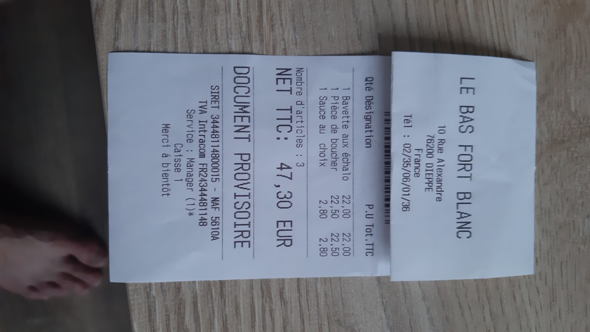 Pour commencer : comment un local guide peut-il attribuer cette note de 5?!!? Bref... En tant que bon Normand, bon mangeur.. je décide de prendre une pièce de boucher.. malheur !!! J'ai eu 150gramme voir 200 grammes de viande pour être gentil!! (Photo a l'appui.. la bavette est bien plus imposante..) Outre le prix de 22€ vient s'ajouter 2.80€ pour une sauce au poivre! accompagné de frite.. surgelé !!! Ma compagne prend une bavette à 22 euro, viande plutôt bonne en goût oui, mais 47euro à 2 pour une viande avec des frites, surgelé en plus.. du coup j'ai cherché un point positif, les nappes sont en papier, serviettes également alors ce n'est pas la dessus que le prix est justifié, il y a la vue sur la mer oui, sauf que ce sont seulement les tables côté fenêtres qui en bénéficie, impossibilité de manger à l'extérieur malgré les tables à disposition.. je vous laisse quelques photos et vous rappel le prix : 47 € pour ses 2 assiettes (sans entrée, sans apéritif, sans dessert.. bref ses 2 assiettes) je n'y remettrait plus un pied !! Jattendai la fin du repas et le paiement avec la fameuse question de la serveuse: ça c'est bien passé Monsieur ? Pour vider un peu mon sac, finalement elle n'a pas eu lieux.. (peut-être qu'elle se douter vu mon visage) Sortie le ventre vide, je me suis vengée sur une baraque à frites..