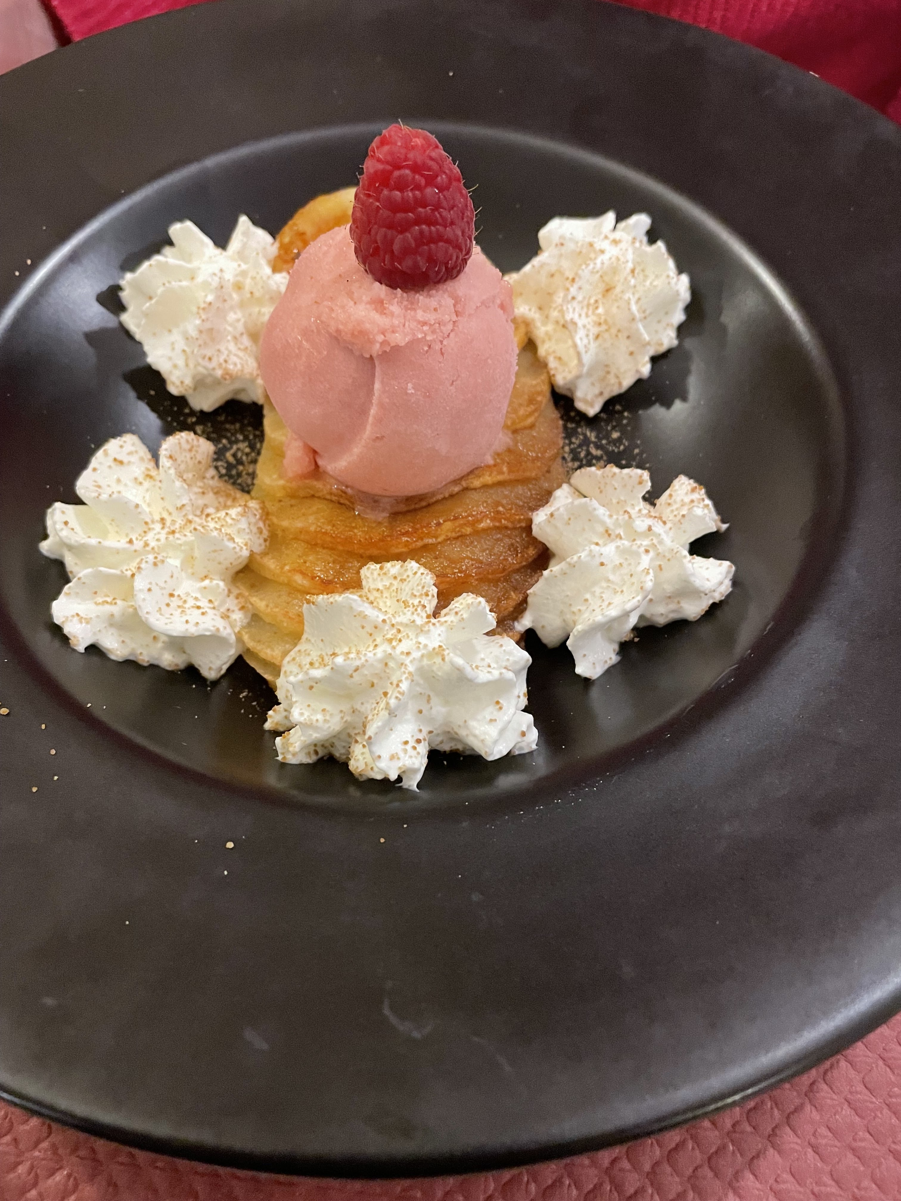 Très bonne soirée dans ce restaurant Avec un dessert original une poire au gel 27 C’est un couple qui tient le restaurant l’homme a fait des remarques à sa femme tout le monde a entendu … petit malaise dans la salle alors que la femme est adorable J’espère que tout ira bien pour eux