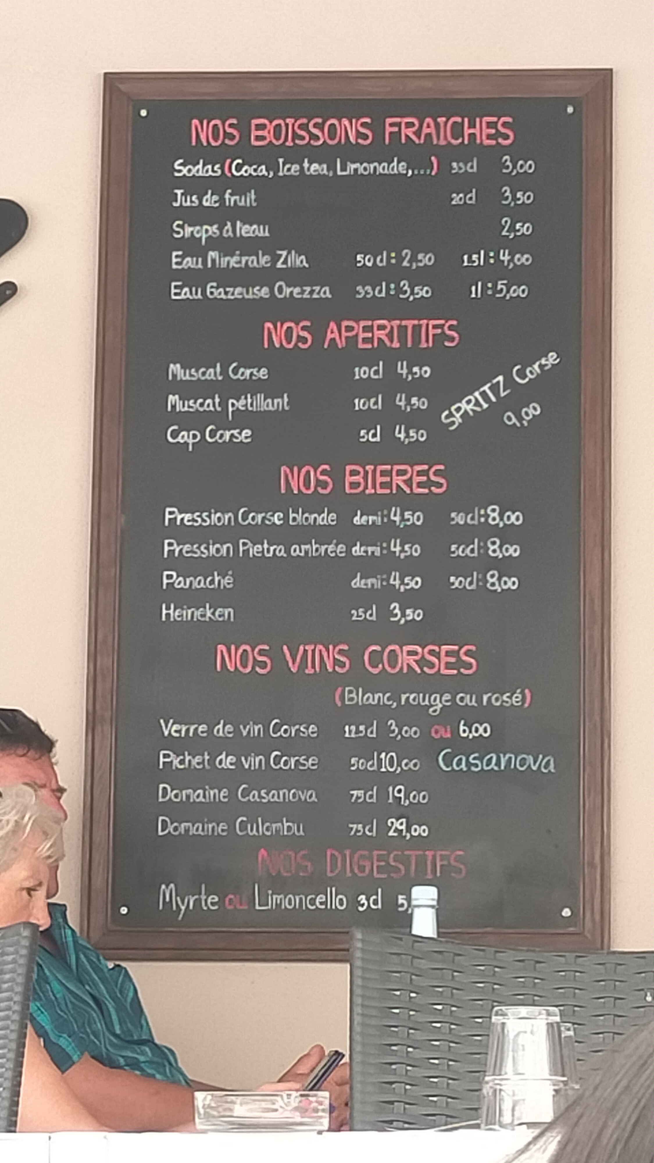 Beaucoup (trop) de restaurants à Bonifacio mais celui-ci a bien sa place dans la ville. Merci pour cet accueil tellement différent de ceux qui racolent comme des dealers plus loin...! Gentils, le patron en salle et son épouse en cuisine donnent de la vie à ce lieu et nous font apprécier plus encore leur cuisine. Prix plus qu'honnêtes. Plats copieux. L'assiette de charcuterie : miam total! Le burger : super top! L'espadon : j'en ai piqué la moitié à la femme... qui m'avait piqué une bonne partie de mon burger ! Le dessert : juste comme il fallait ! Pour le patron : merci de nous avoir bien placé pour que je puisse dessiner. Romain