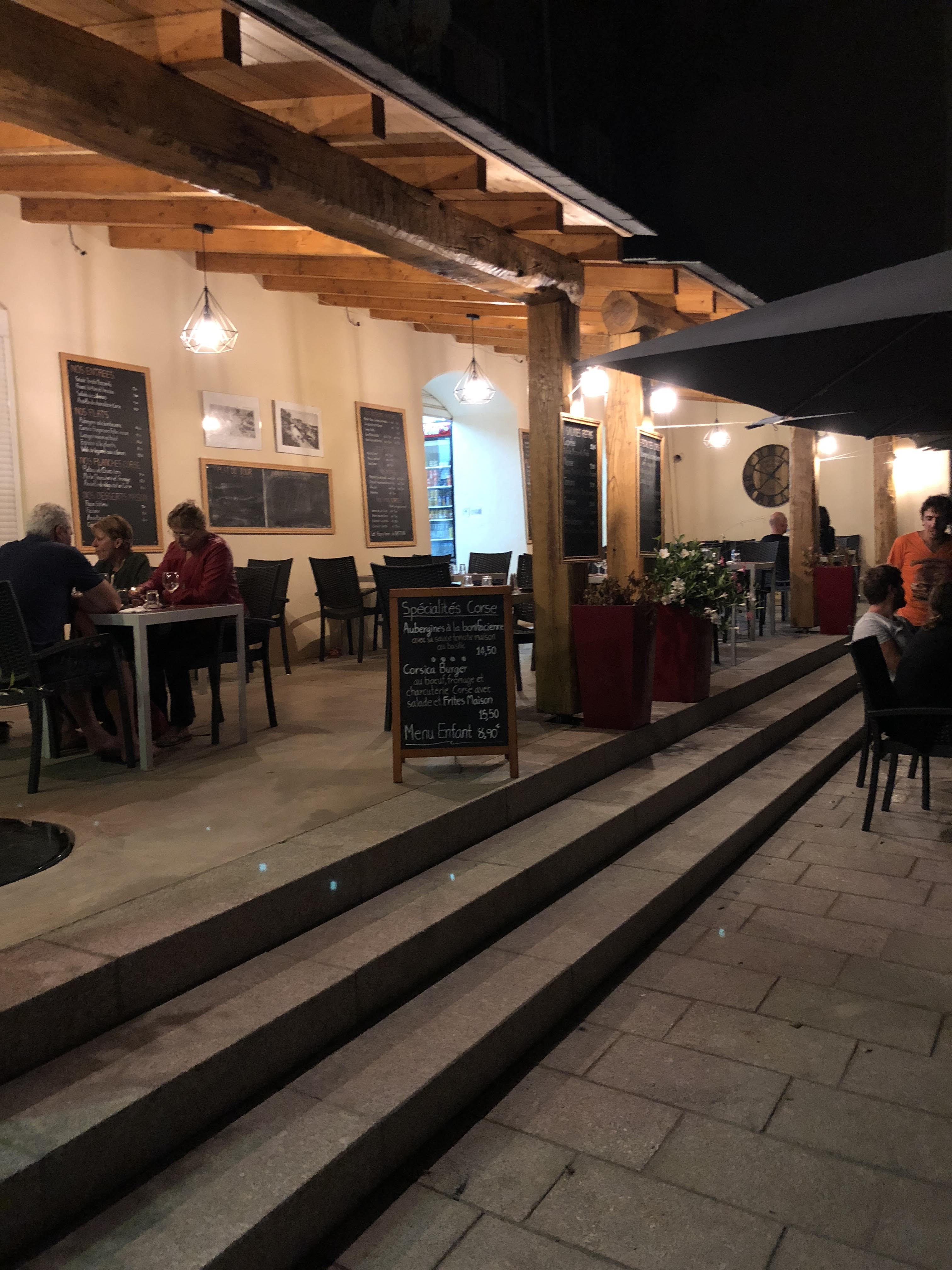Place paisible un peu à l’écart, nourriture très correcte, bonne présentation des plats, prix dans la même fourchette que ses concurrents,… mais surtout un patron espiègle et loquace (si vous aimez échanger). Un burger corse et une liqueur de myrte en digestif, pour rester sur du basic, ont ravis ma soirée de touriste.