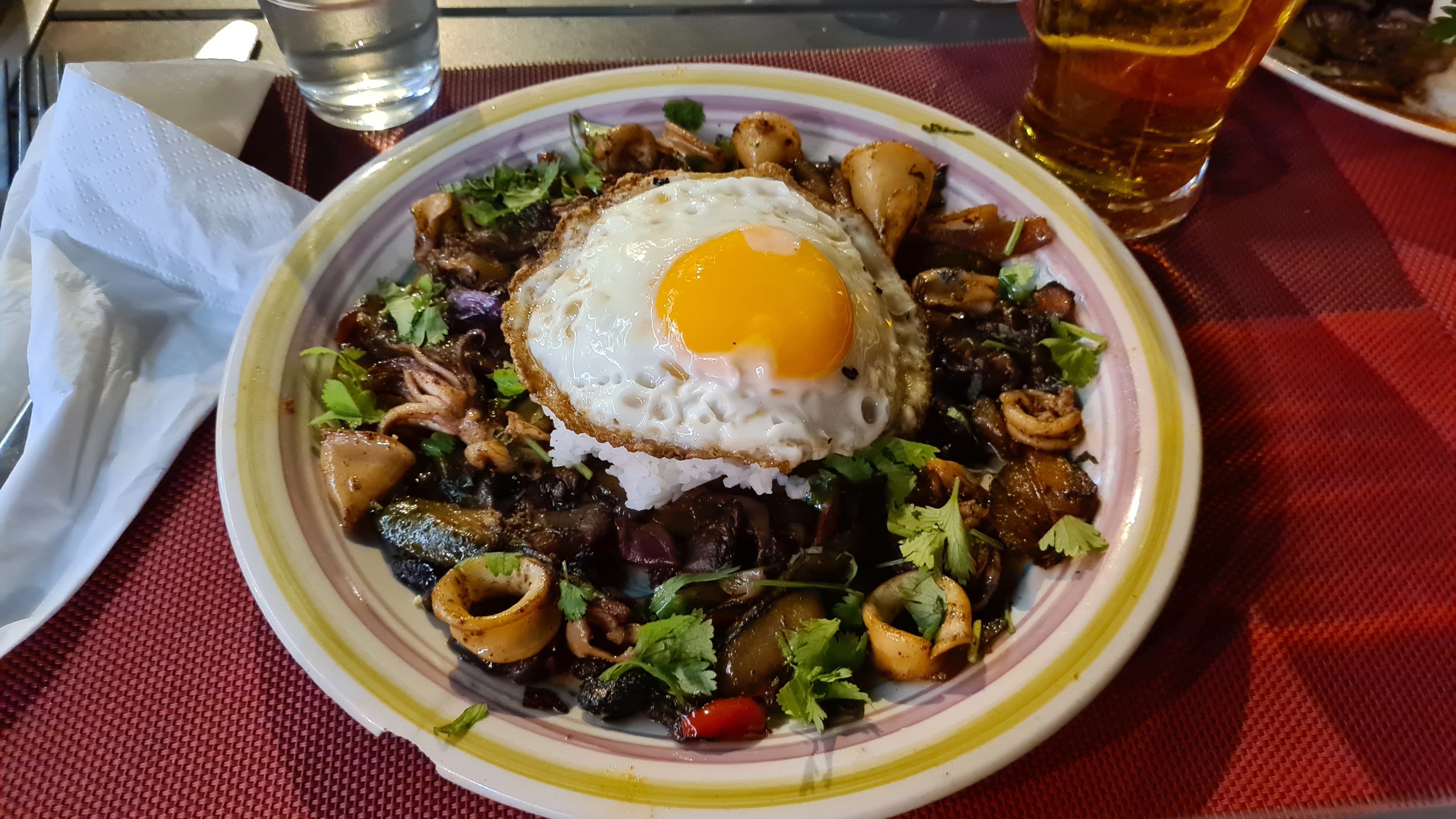 J'étais fan de moules corses pour trouver le meilleur endroit… la bonne musique m'a rattrapé. Nous avons essayé la salade de calamars. Parfait, il y en avait très peu à l'intérieur. Ma femme avait un souhait d'épée dans le wok. C'était aussi très bien. Des trucs très sympathiques. Restaurant familial sympa