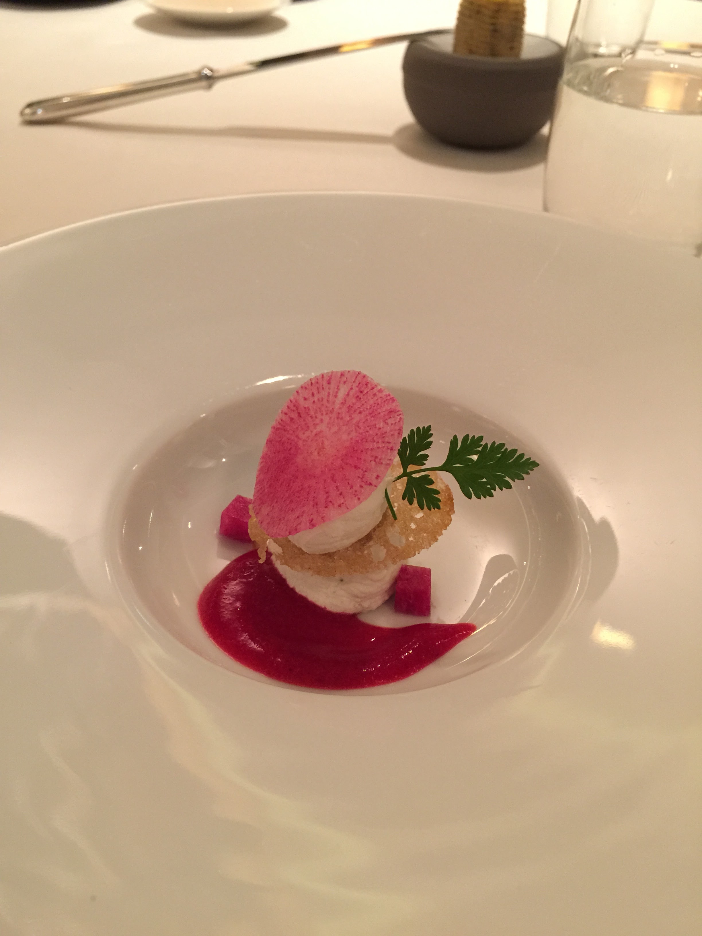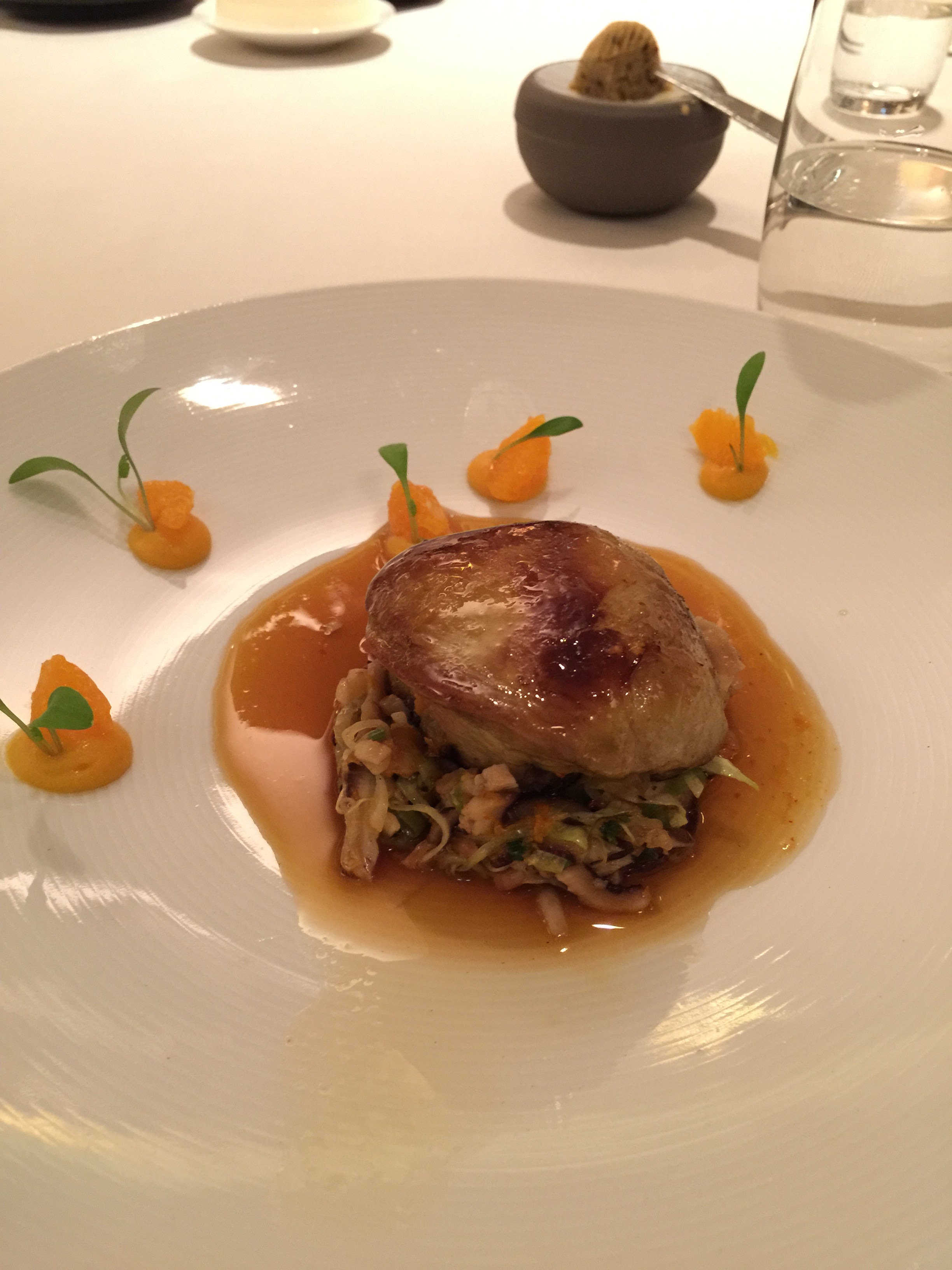 12 tables en hiver, un accueil parfait et un sommelier (venant du Jules Verne) au petit soin avec un choix de vins issus de petits terroirs magnifiquement choisis. La cuisine est divine, avec juste ce qu’il faut en présentation. Un symphonie de couleurs et de goûts. Ici on aime faire partager l’amour de la grande cuisine, sans chichi inutile et cela se sent. C’est fin, beau et bon. Pas de « trucs » incroyables pour l’esbrouffe, mais des produits merveilleusement bien travaillés. C’est bien le client qui est au centre de l’attention. Le Chef, formé chez Ducasse, et passé par Chantilly, est arrivé en Avril. Pourvu qu’il reste. Et que dire du dessert? Leger, tres fin, le chocolat est décliné en une palette de gouts aussi différents que belle. Normal, le pâtissier est une référence. Bravo à cette brigade pour ce beau dîner. L’étoile est largement mérité. Ps: le tableau Noir Blanc (Morel je crois) n’est pas d’une gaité absolue..Mais cela n’engage que moi.