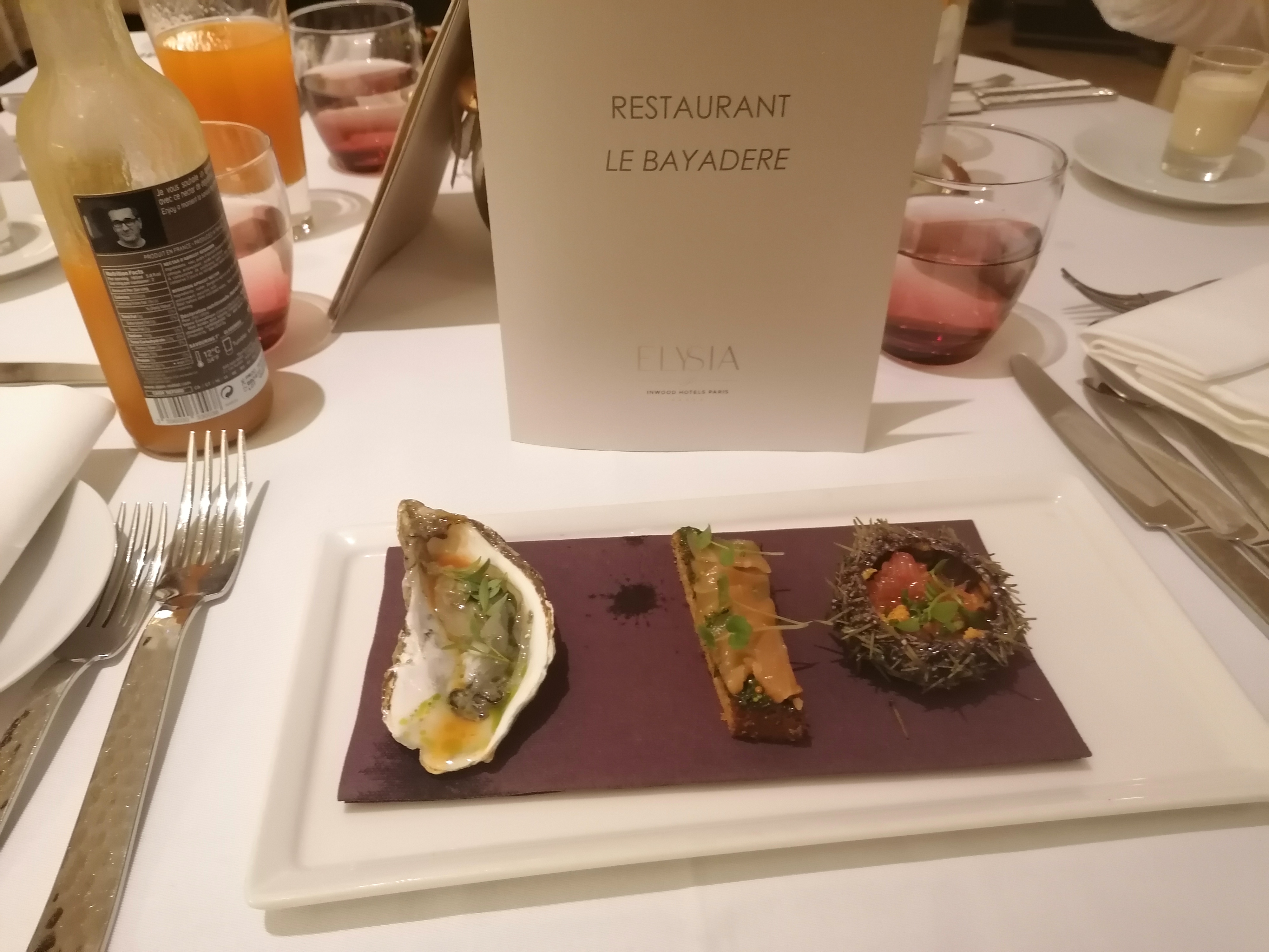 Nous avons dîner au Bayadère pour le réveillon du jour de l'an nous étions 4 l'accueil très chaleureux, le lieu magique, le service ni trop long ni trop court une ambiance feutrée un décor à rêver. Nous n'avons jamais mangé aussi bien tout était excellent, 7 plats que nous avons dégusté avec délice, avec bonheur même plus faim nous avons tout mangé Les serveurs discrets avec toujours un petit mot gentil. A la fin du repas un jeune chef est venu nous saluer, et franchement il mérite a être connu et étoilés. Je n'ai qu'un mot merci pour nous avoir fait passer ce dernier jour de l'année avec autant de bonheur. Merci à mon fils pour nous avoir fait découvrir ce lieu magique