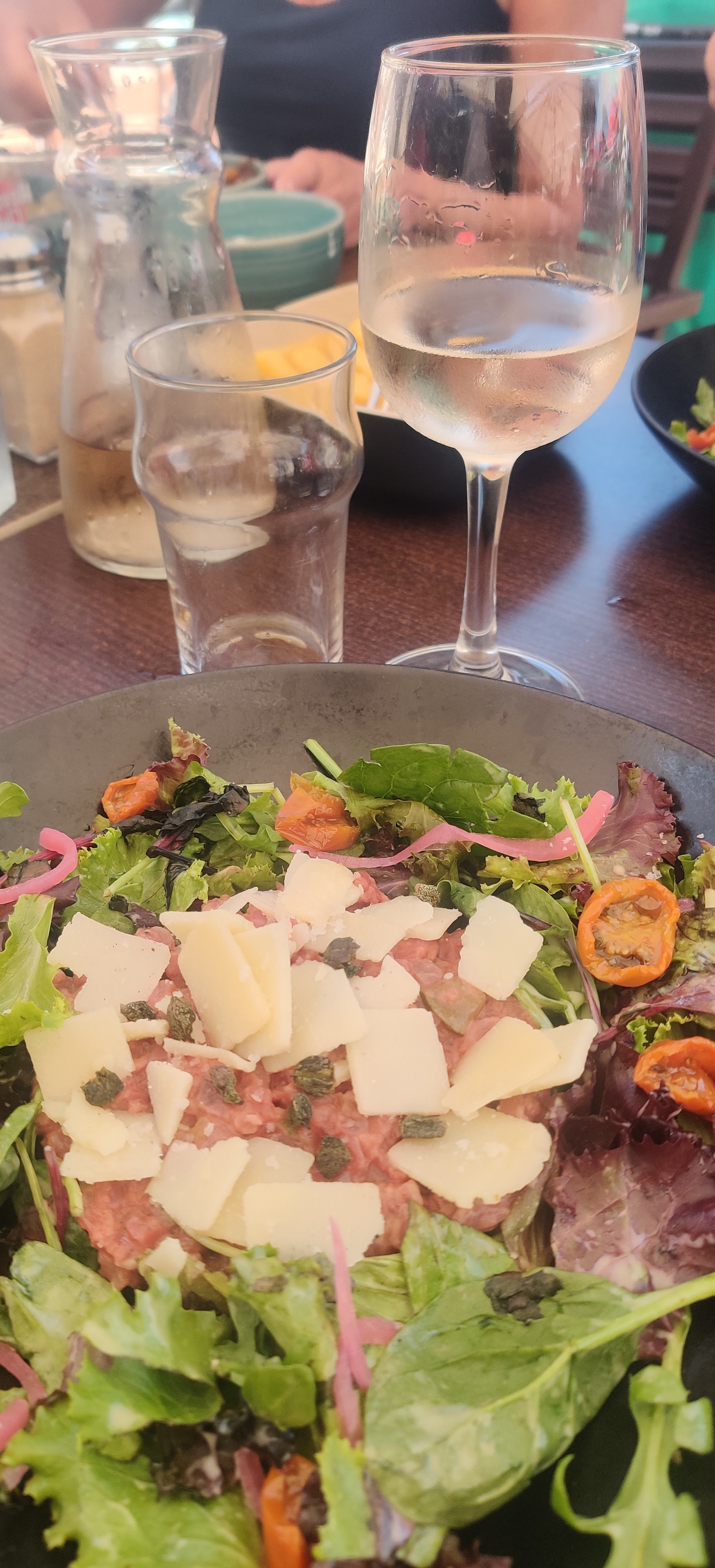 Le tartare de boeuf grillé avec son accompagnement est parfait,le service aussi malgré qu'on voit le personnel souffrir de la chaleur,car ce travail est très physique et il faut tjrs gardé le sourire chose qu'il font merveilleussement bien bravo aux personnels