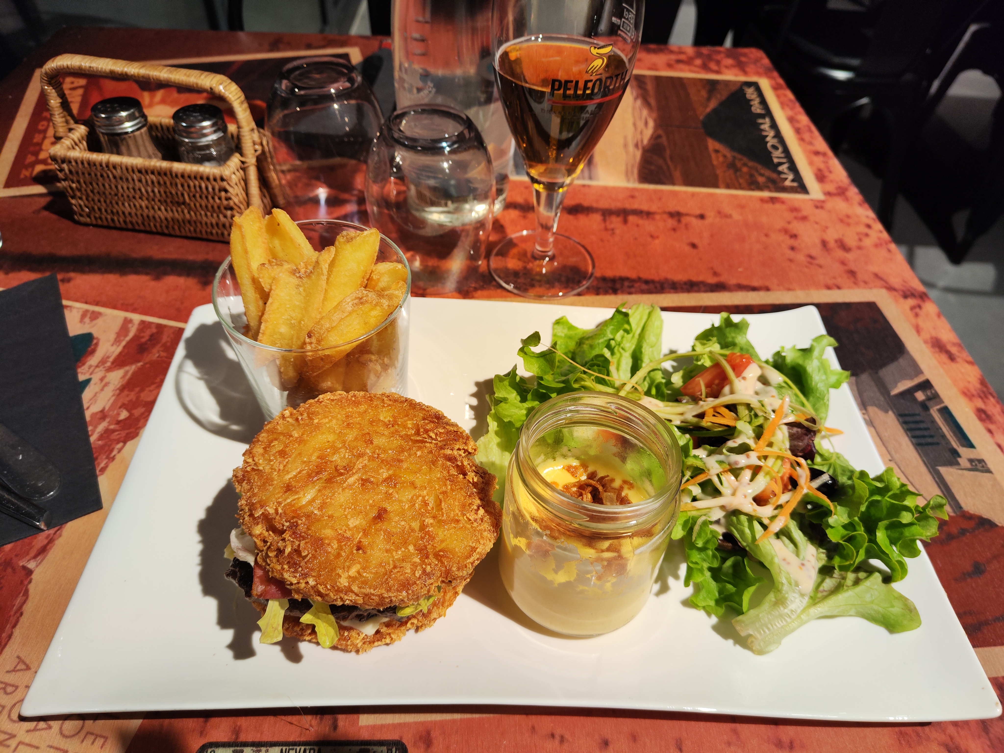 Correct, service a revoir: temps d'attente long, oubli de 4 accompagnements (la petite salade avec le burger), avertissement de l'oublie pour les 4 burgers gentillement et en amène 3 et donc un burger sans salade. On le signale, corrigé.. Au rappel dans le menu : le burger est servi avec frites et salade. De plus, nous avons dû aller chercher des carafes d'eau au comptoir puisque malgré les 2 demandes pour en avoir, elles ne sont jamais parvenu jusqu'à nous. Par la suite, on passe aux desserts, la serveuse amène tous les desserts sauf 2, on attend, puis on demande... ''Ah oui on vous a oublié''. Et puis la serveuse revient tout sourire '' et voilà les 2 desserts oubliés! '' Le tout avec un délai d'attente super long. Je ne recommande pas, c'est dommage puisque le cadre est sympa et pourrait être attractif. La nourriture est bonne. Mais si vous voulez attendre plus que de raison et quémander tous vos dû (boissons, plats, accompagnements, eau, dessert...) c'est l'endroit où il faut aller. Personnellement, je ne vais pas dans un endroit pour avoir a demandé tout ce qui doit être fait de base lors d'un service, des erreurs arrivent, des oublies également, mais là ça en fait beaucoup !