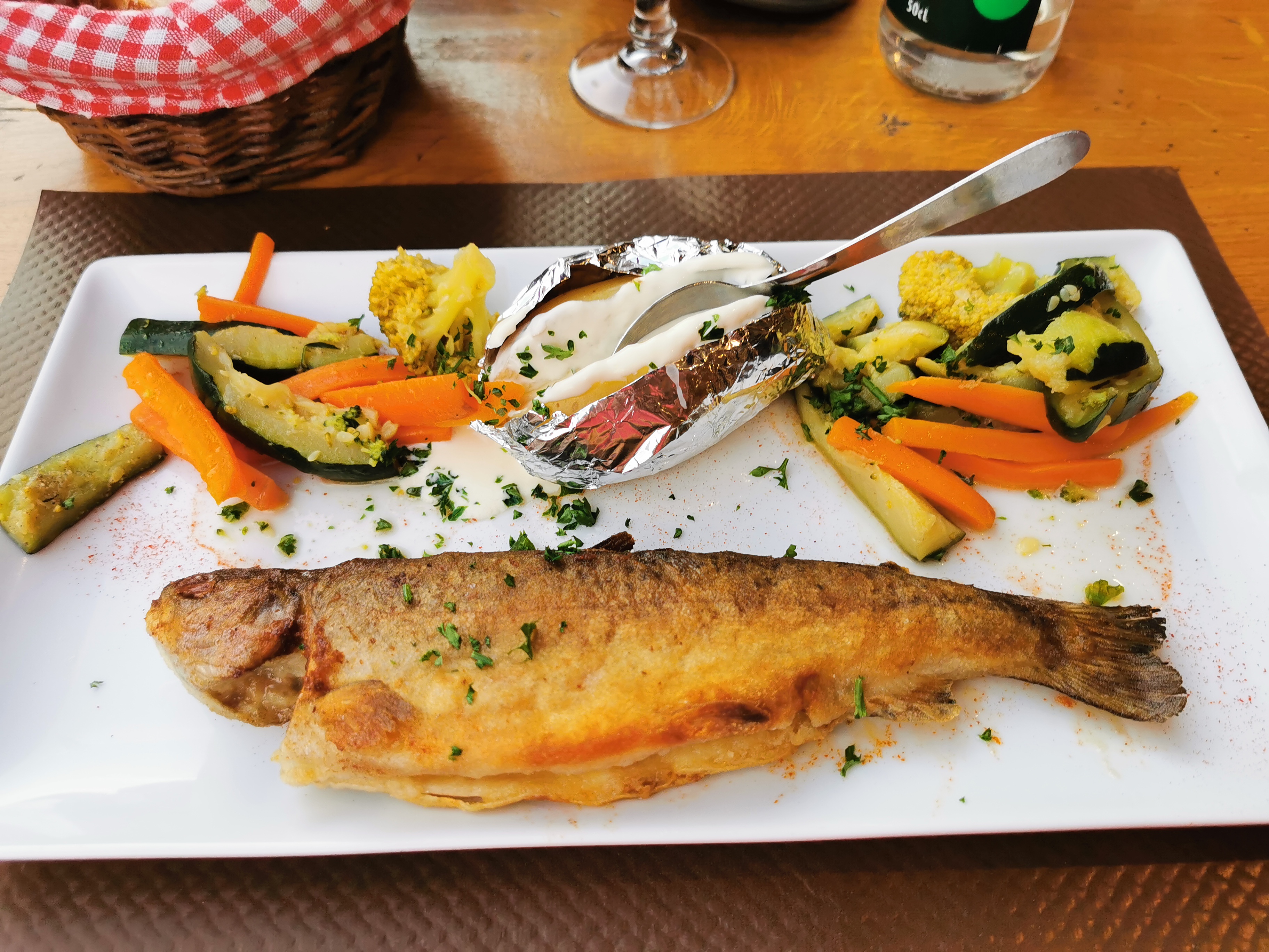 Je ne recommande pas. Nous étions de passage pour une journée. L’endroit nous a vraiment séduit, le lieu est vraiment beau. Cependant, la cuisine n’est vraiment pas terrible du tout. J’ai choisi une truite entière : le poisson n’était pas trop mauvais, les accompagnements haricots verts et carottes (je ne pense pas que c’était frais vu l’absence de goût …), le riz blanc sans aucune saveur. J’ai dû rajouter du sel pour que ce soit mangeable. Mon mari a choisi une pizza : très très moyenne, il n’a pas pu la terminer … Les enfants un menu enfant à 12€, un steak frite (pas de possibilité d’avoir un peu de légumes à côté des frites : c’est soit l’un, soit l’autre … ) + glace et sirop. Le steak était bon. Les frites maisons surcuites, mais pas trop mal. Le service moyen. En bref, un gros effort à faire au niveau de la cuisine. La qualité n’est pas au rendez-vous, à moins que les autres plats soient mieux? Sinon, On paye le décor.
