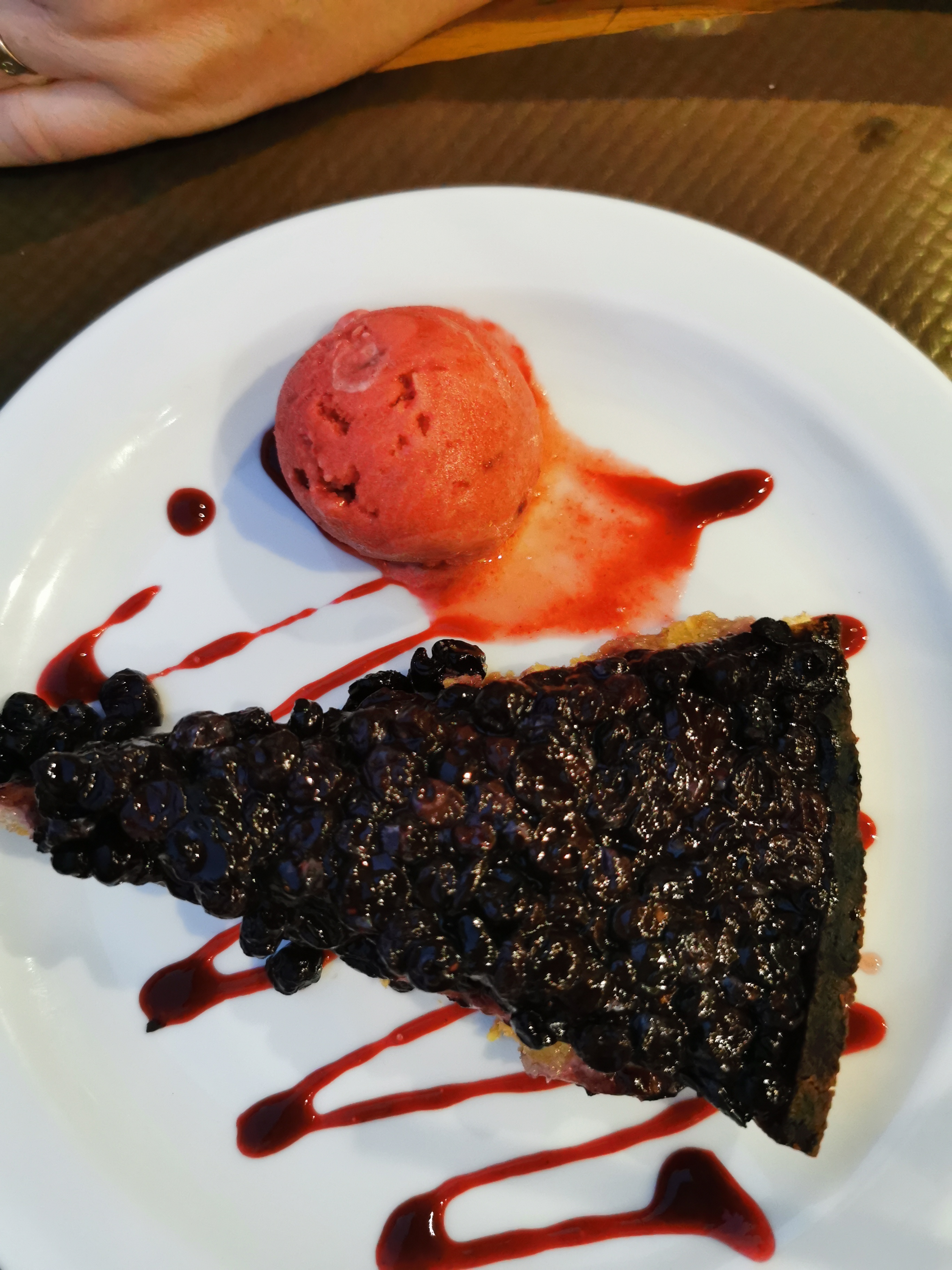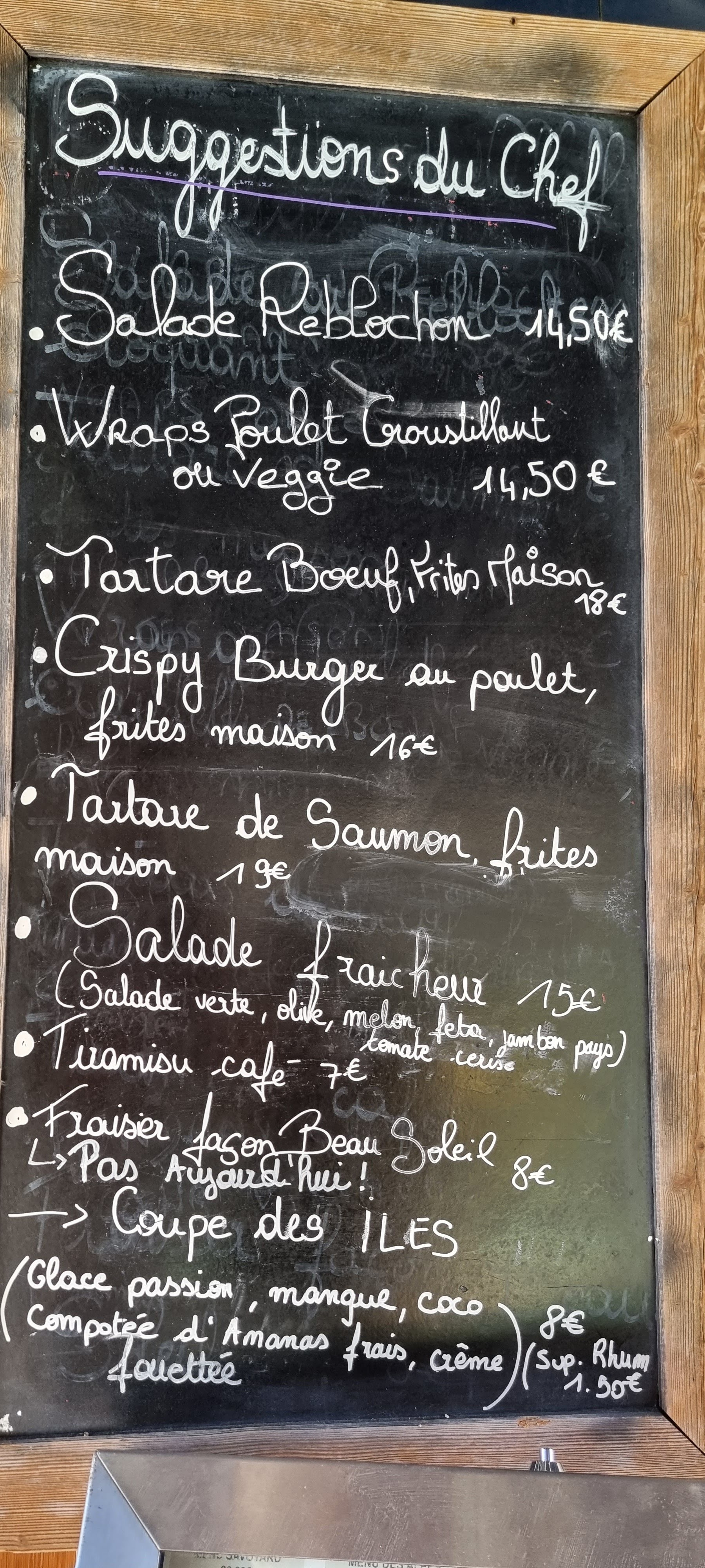 Belle découverte du suprême au reblochon. Les frites maison peu salées que vous assaisonnez selon votre goût. La tarte aux myrtilles une vraie tuerie: fraîche pas trop sucrée avec une présentation raffinée et accompagnée d'un sorbet framboise exquis par cette chaleur estivale. Personnel très accueillant. Nous conseillons vivement.