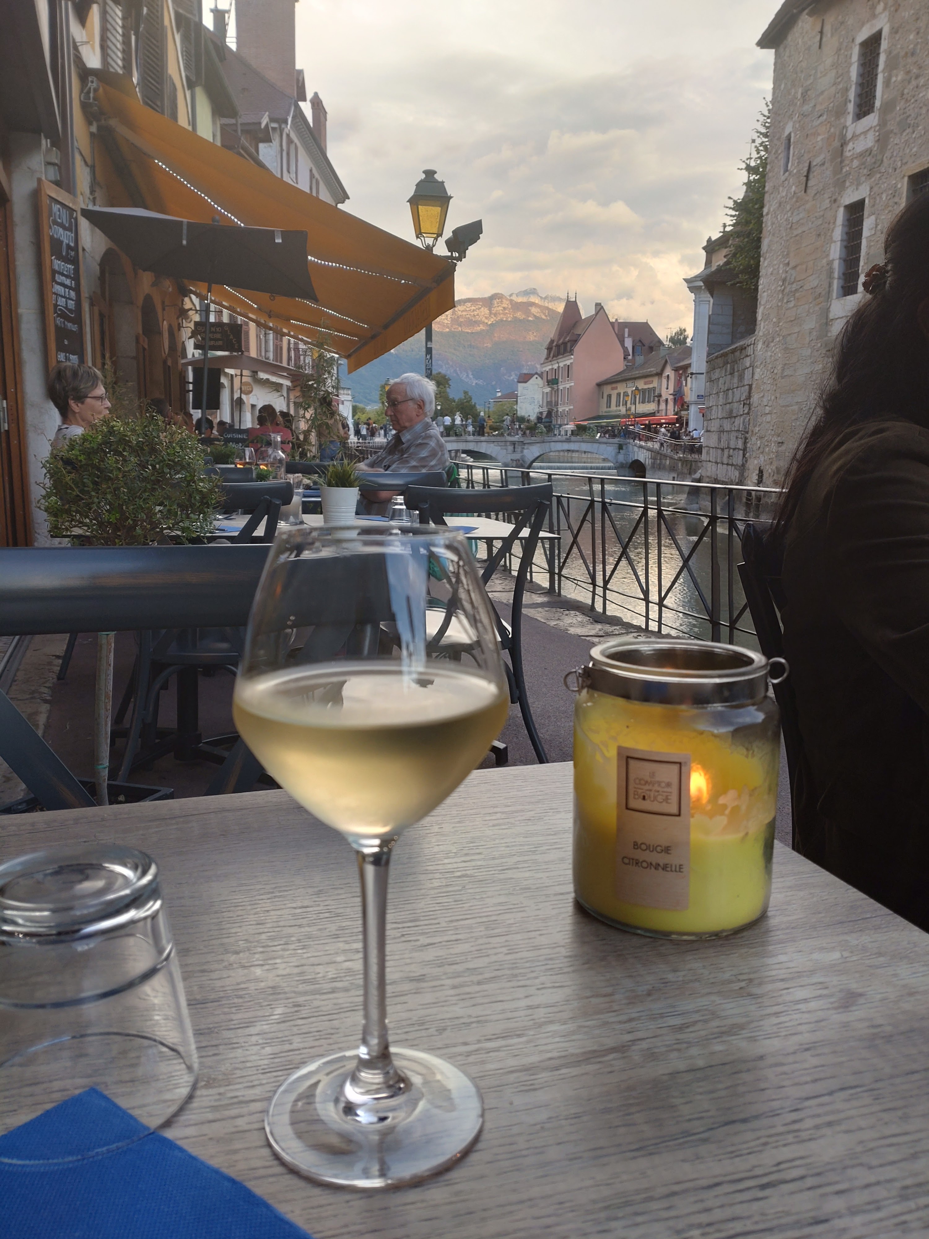 Magnifique endroit avec vue sur la prison monument historique de Annecy. J ai apprécié la terrasse donnant sur le canal du thiou. Le repas excellent et bon rapport qualité prix. Je regrette cependant la dynamique pressurisante du responsable de salle. Heureusement, je l ai indiqué au jeune serveur brun qui a repris la main et m a permis de passer un excellent moment.. Tranquille. Je recommande vivement cette adresse
