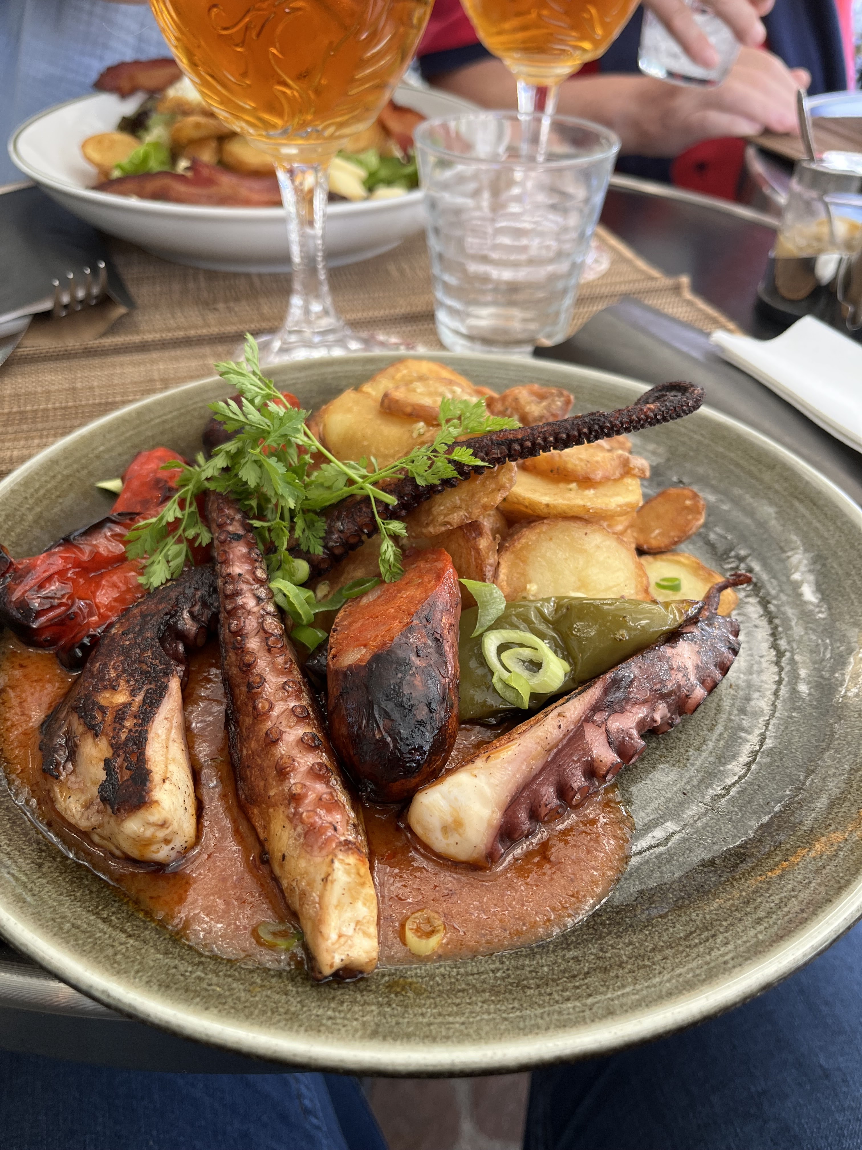 Vin chaud couleur thé léger, acide et très fort goût de cannelle...on nous explique que c'est du vin bio sans sulfite (surtout sans vin et beaucoup d'eau !)🥶... A fuir côté bar...les spritz servis à la table d'à côté sont de couleur très claire aussi... et nous sommes entassés sous la terrasse couverte. Table de 6 pour 9 personnes à côté de nous.