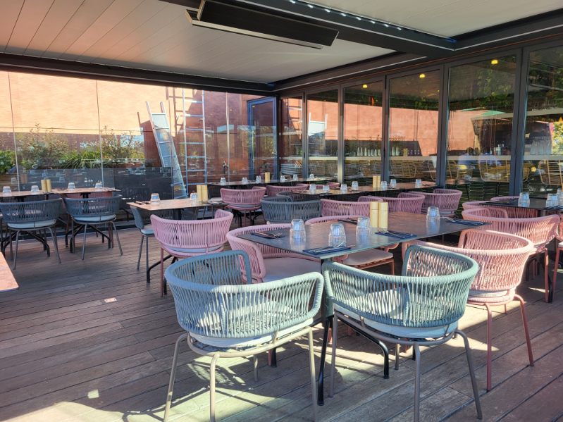 Restaurant en roof top un peu bruyant. Cuisine très goûteuse et assez inventive. Peu de choix, seulement 2 entrées 2 plats 2 desserts et quelques tapas. Quelques vins au verre mais un grand choix de bouteilles.