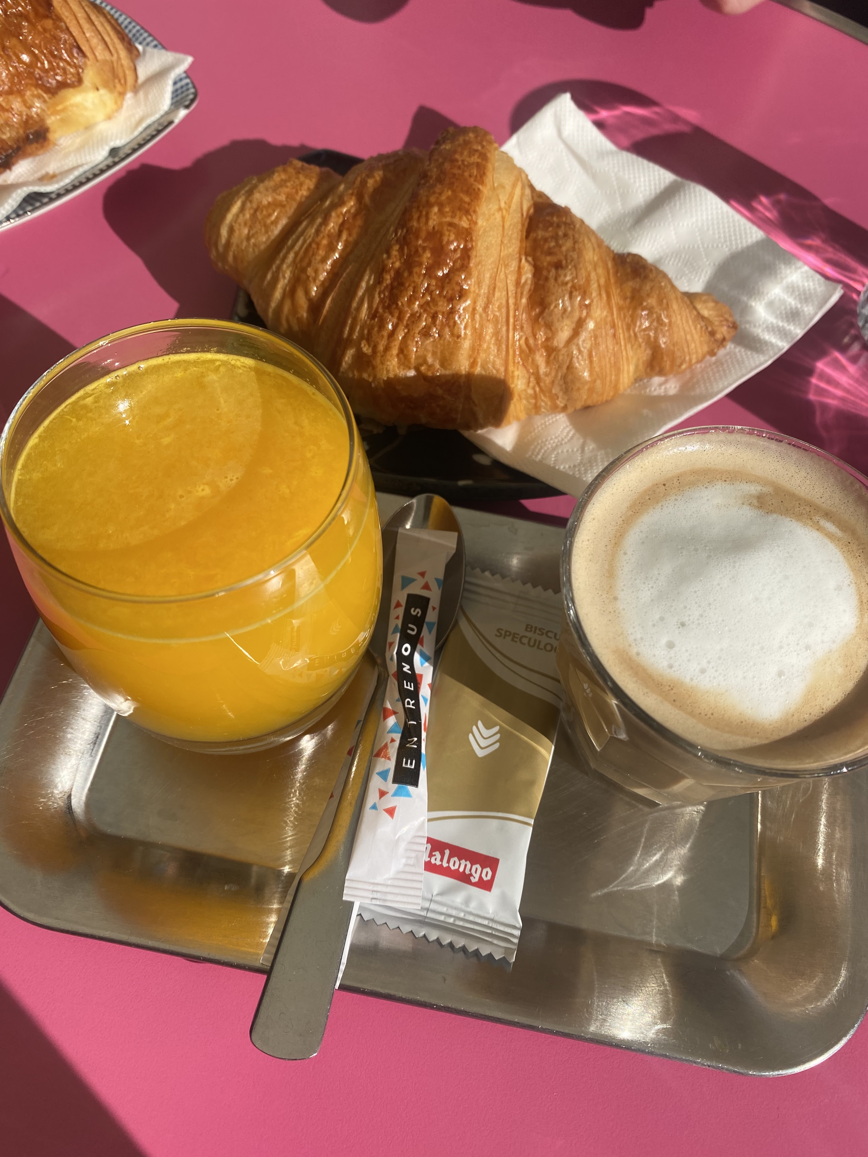 Terrasse ensoleillée les matins de printemps jusqu’à midi! Petit dej français à prix raisonnable.