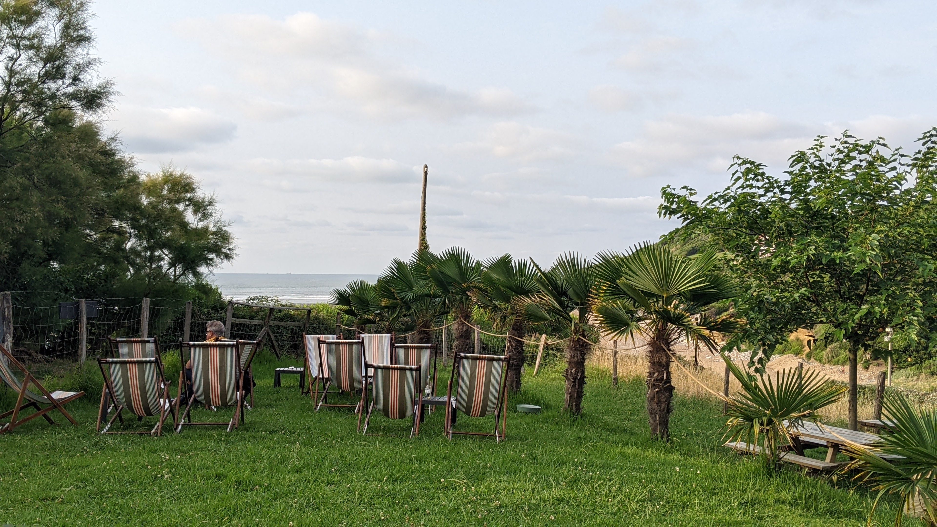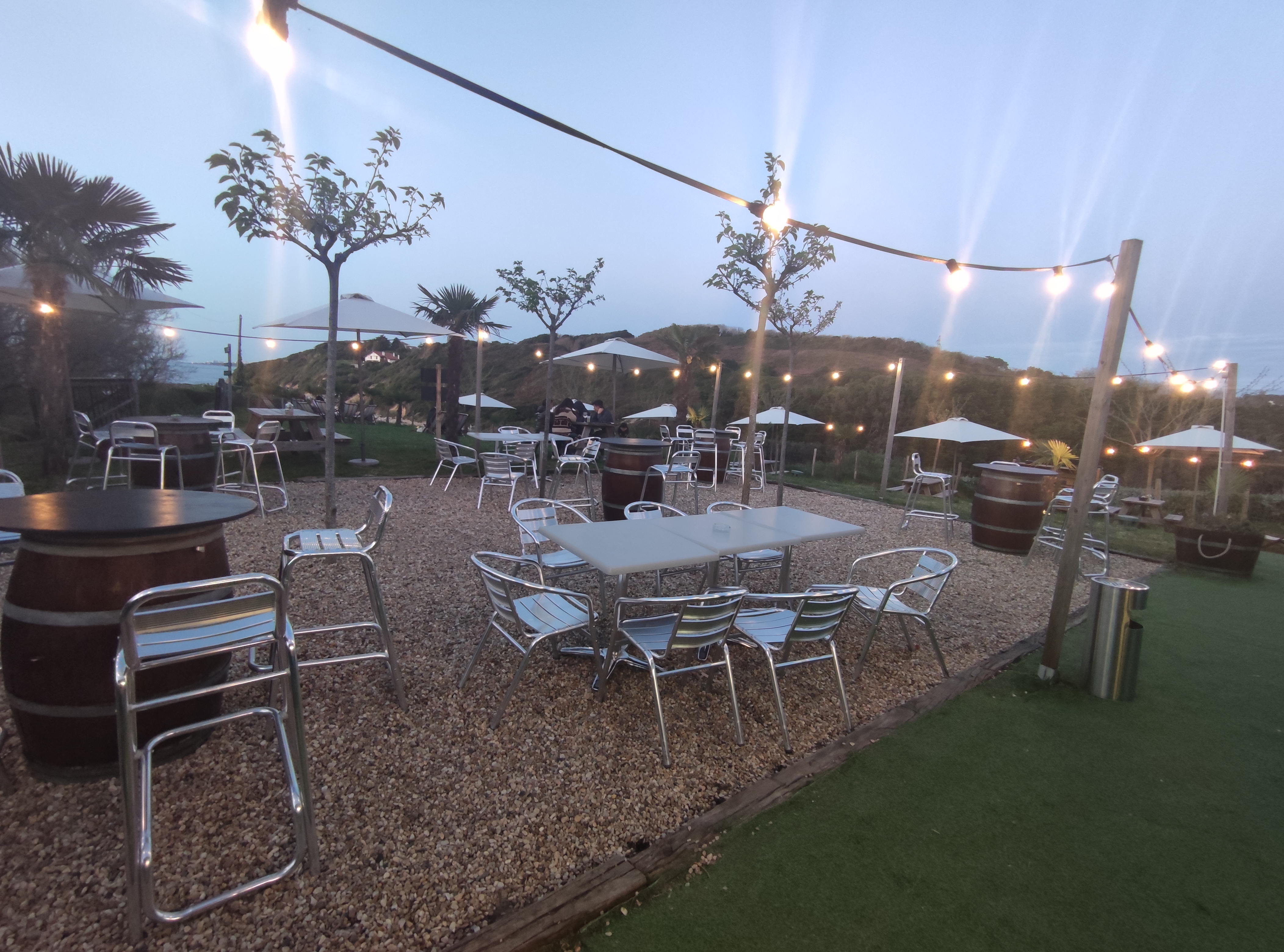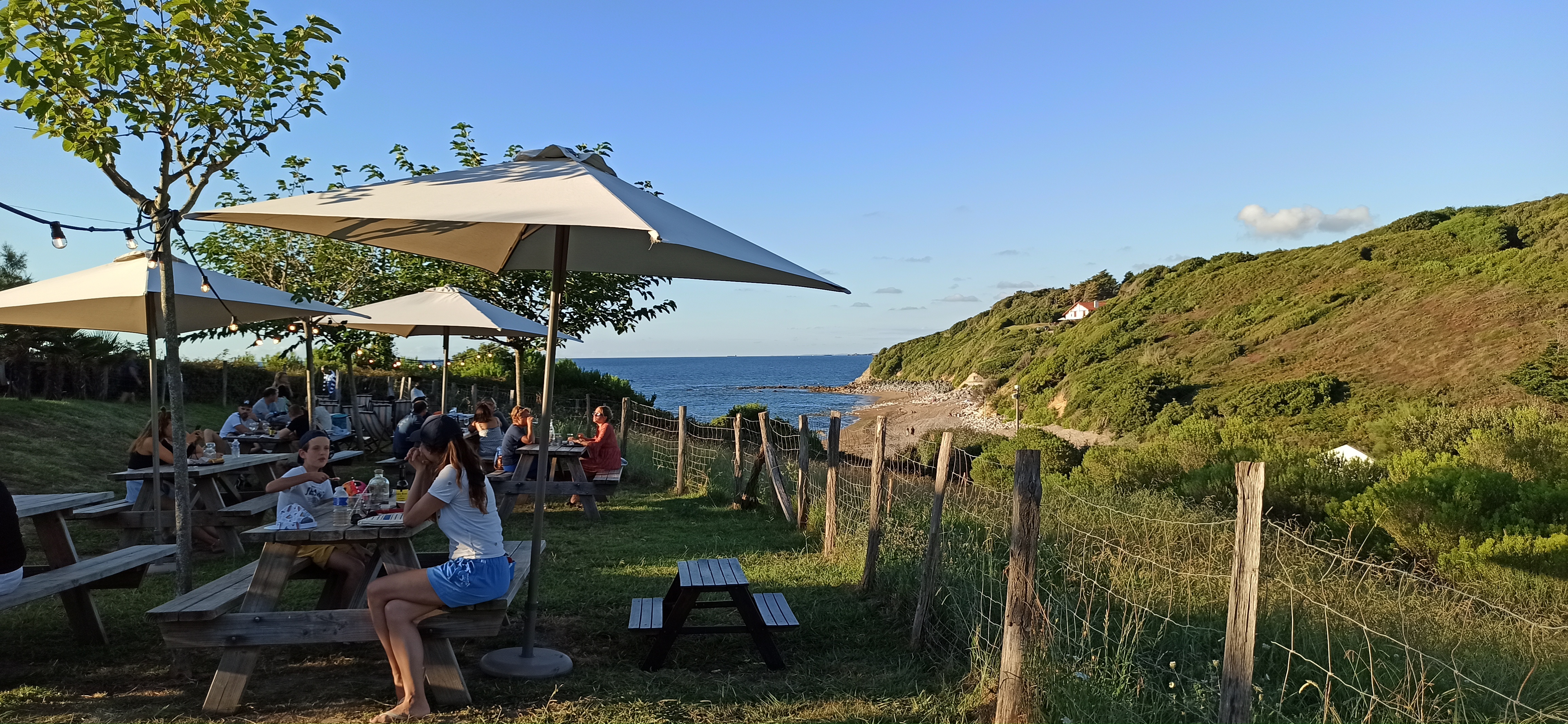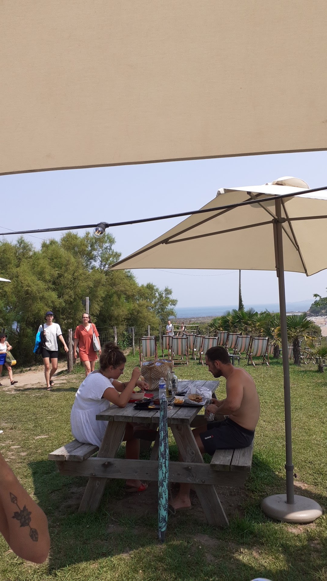 Vraiment un bel endroit ! Idéal pour manger un morceau et boire un coup en famille ou entre amis ! De rées bons produits, frais et préparés à la minute vous attendent dans un cadre de verdure avec vue sur l'océan ! A l'ombre comme au soleil, à une table, un tonneau ou sur un transat, on s'y sent bien !