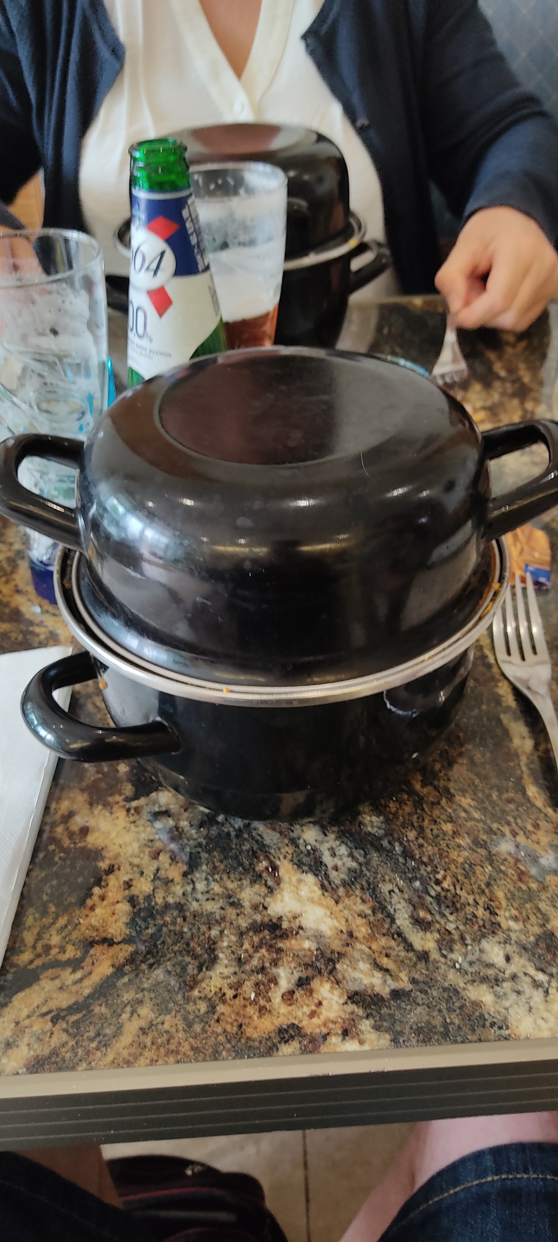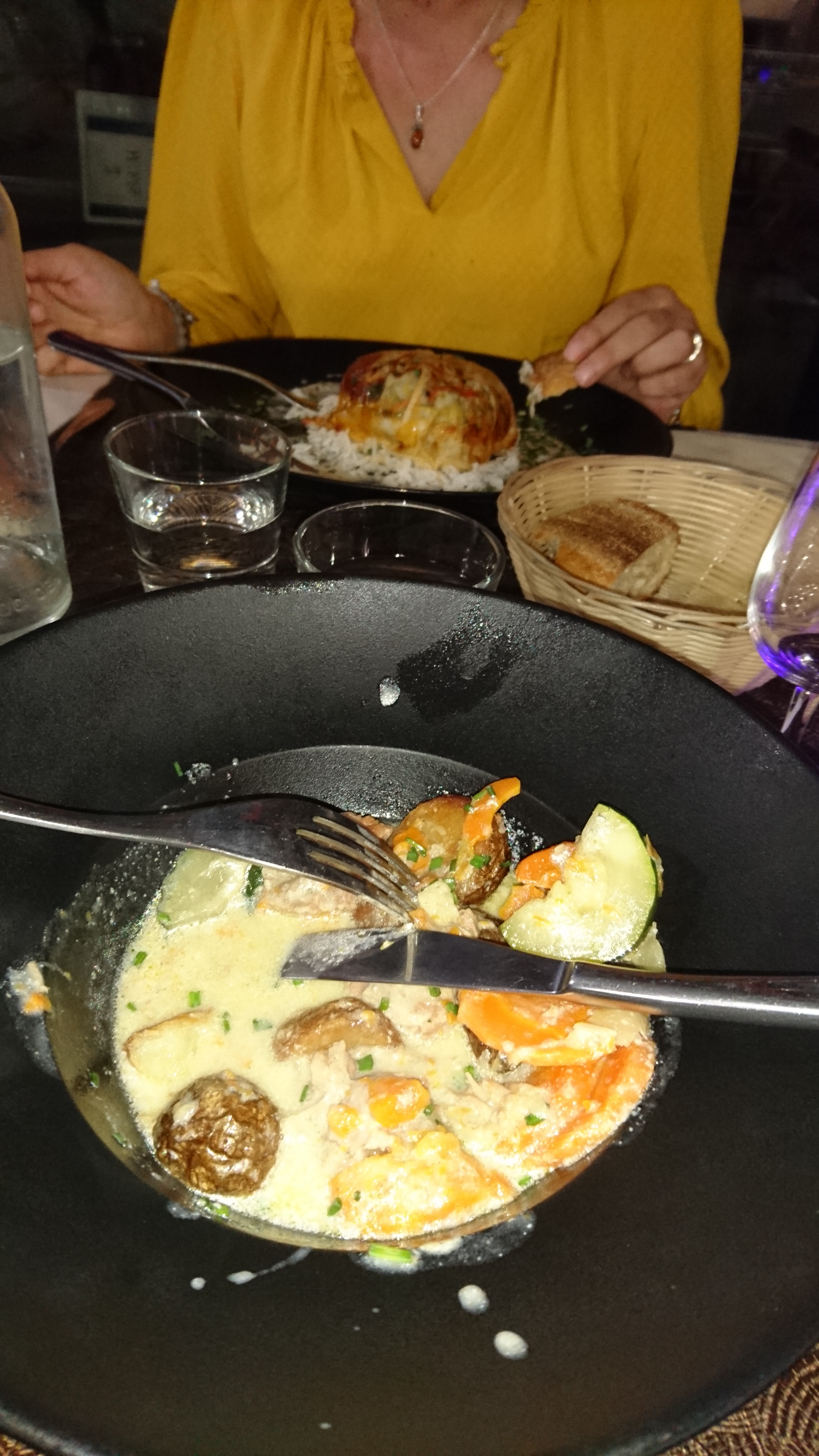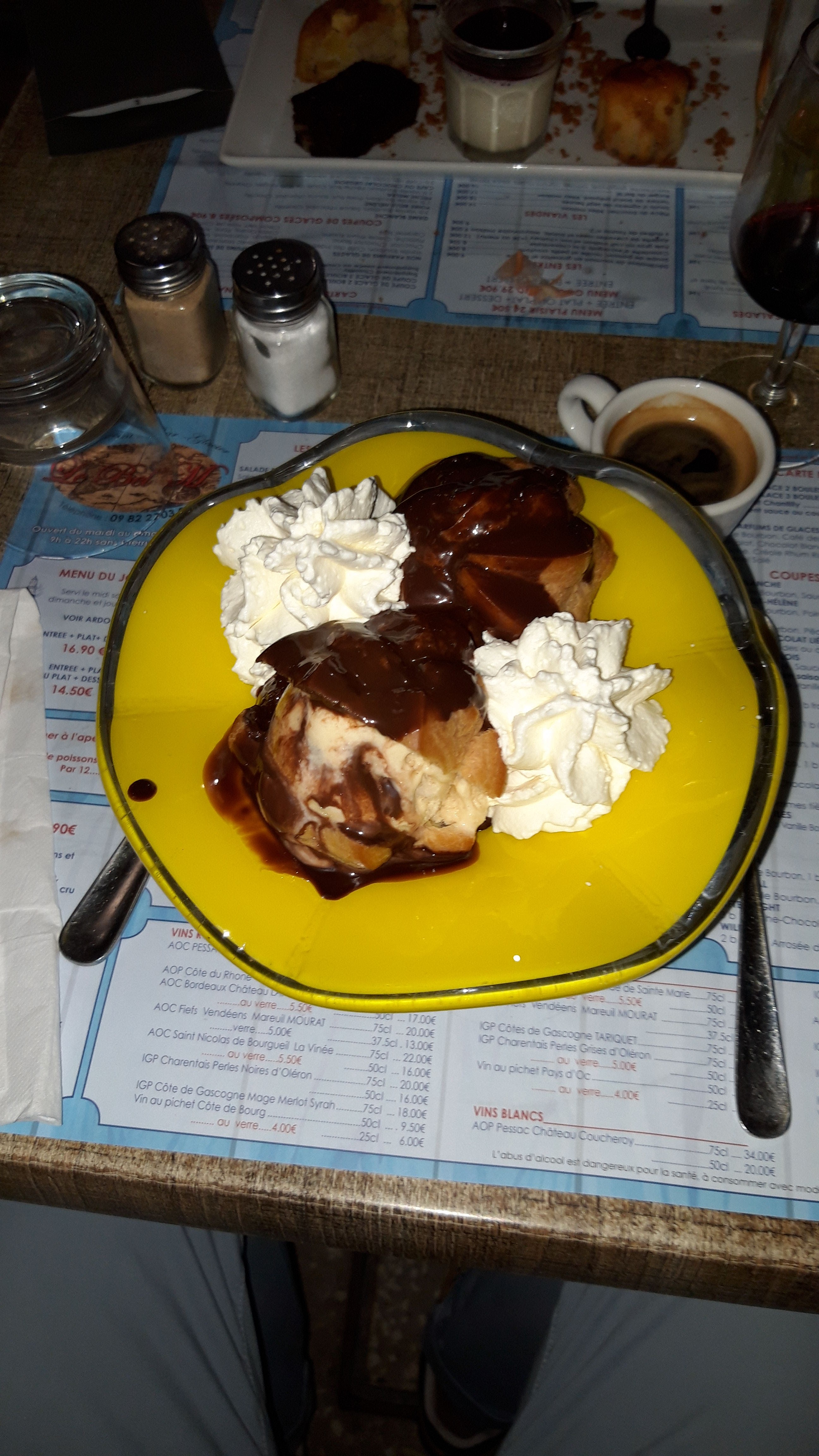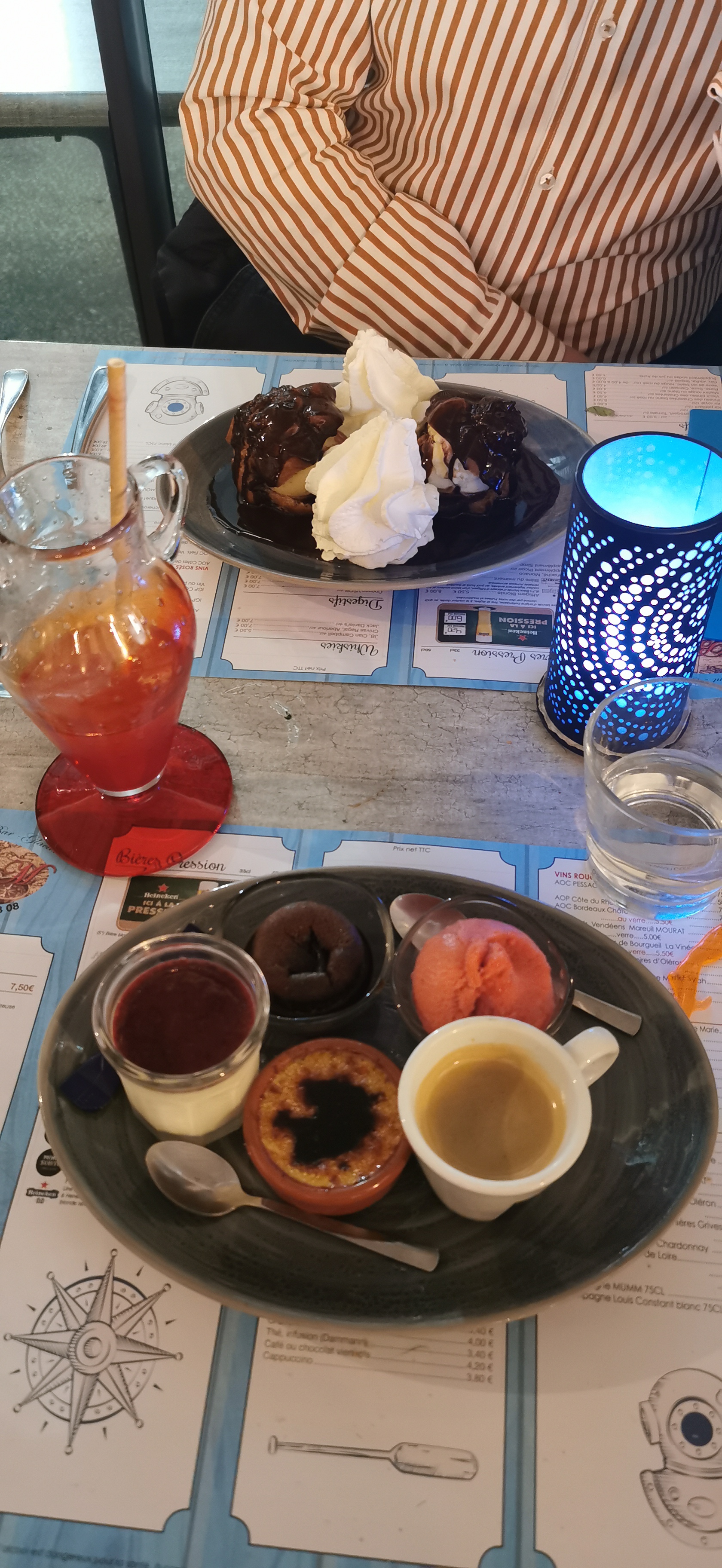 Malgré la tempête le restaurant était ouvert J'ai pris la potence avec plusieurs morceaux de poissons, gambas et légumes. Le thon était un peu trop cuit et sec et il manquait de sauce ( un petit ramequin) Le dessert chocolat liégeois était monstrueux, énorme. Bon accueil