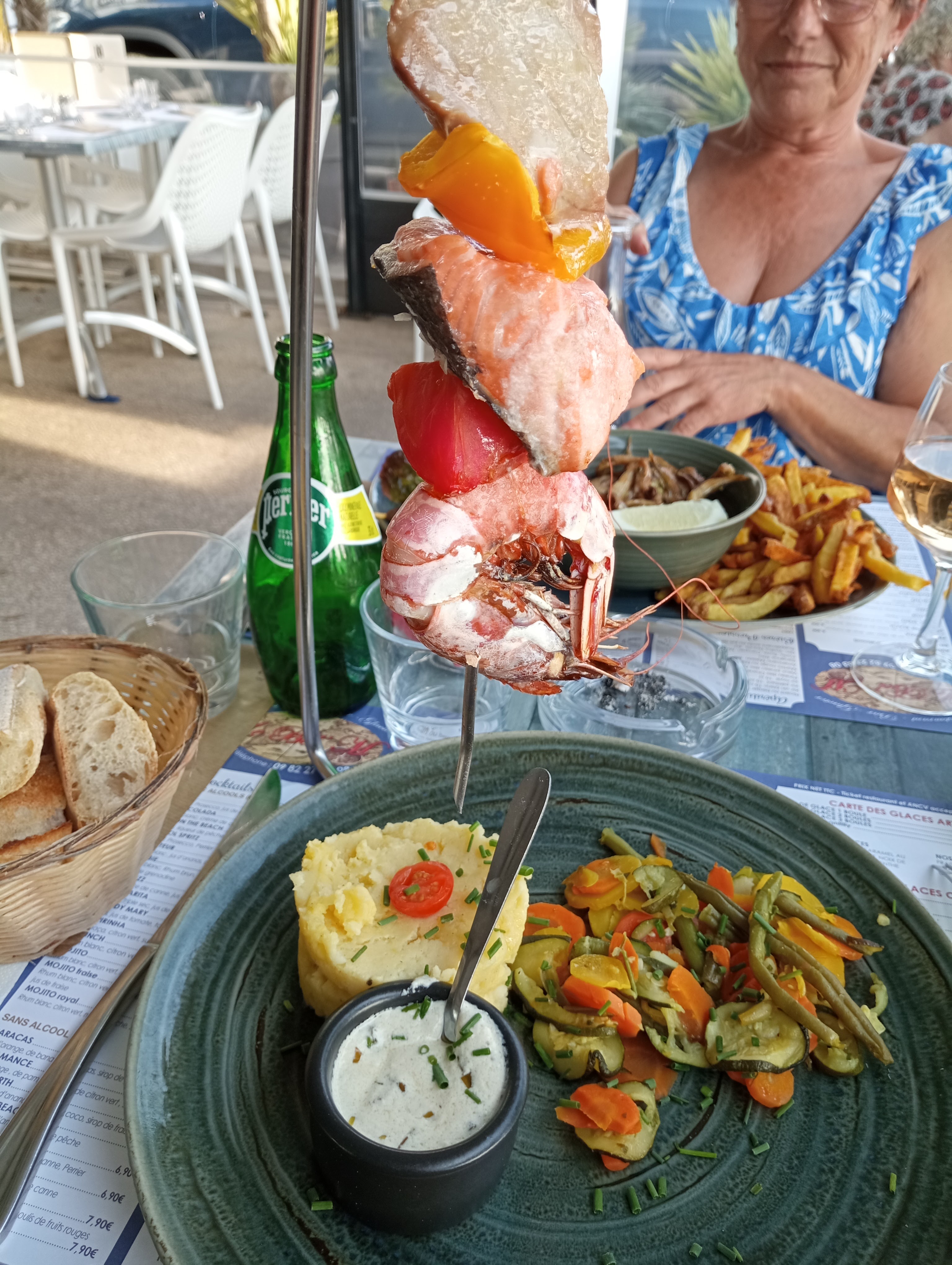 Nous avons fait deux essais dans la même journée ici, deux expériences positives. Tout d'abord, à notre arrivée à Fouras, nous nous sommes arrêtés pour nous désaltérer. Juste une bière chacun, mais regarder la baie et la mer était un délice. Nous sommes revenus plus tard pour notre repas du soir. Ma femme a reçu une sorte de brochette de poisson montée sur une sorte de potence. Cela fait un peu tourner les têtes, ce dont elle s'en fichait, mais la nourriture était très bonne. J'ai commencé avec de la soupe de poisson, j'ai tout mis dedans, croûtons, fromage et mayonnaise au curry, et j'ai tout apprécié. J'ai ensuite enchaîné avec la friture d'eperlans. Ils sont venus avec des frites, de la salade et un aïoli très robuste. Nous avons essayé une bouteille de blanc maison, ce qui était bon C'était une soirée chargée et les gens de service étaient très occupés. Ils ont bien réussi et ont tout fait avec bonne humeur et sourire. Nous avons apprécié notre séjour ici et j'y retournerais sans hésiter.