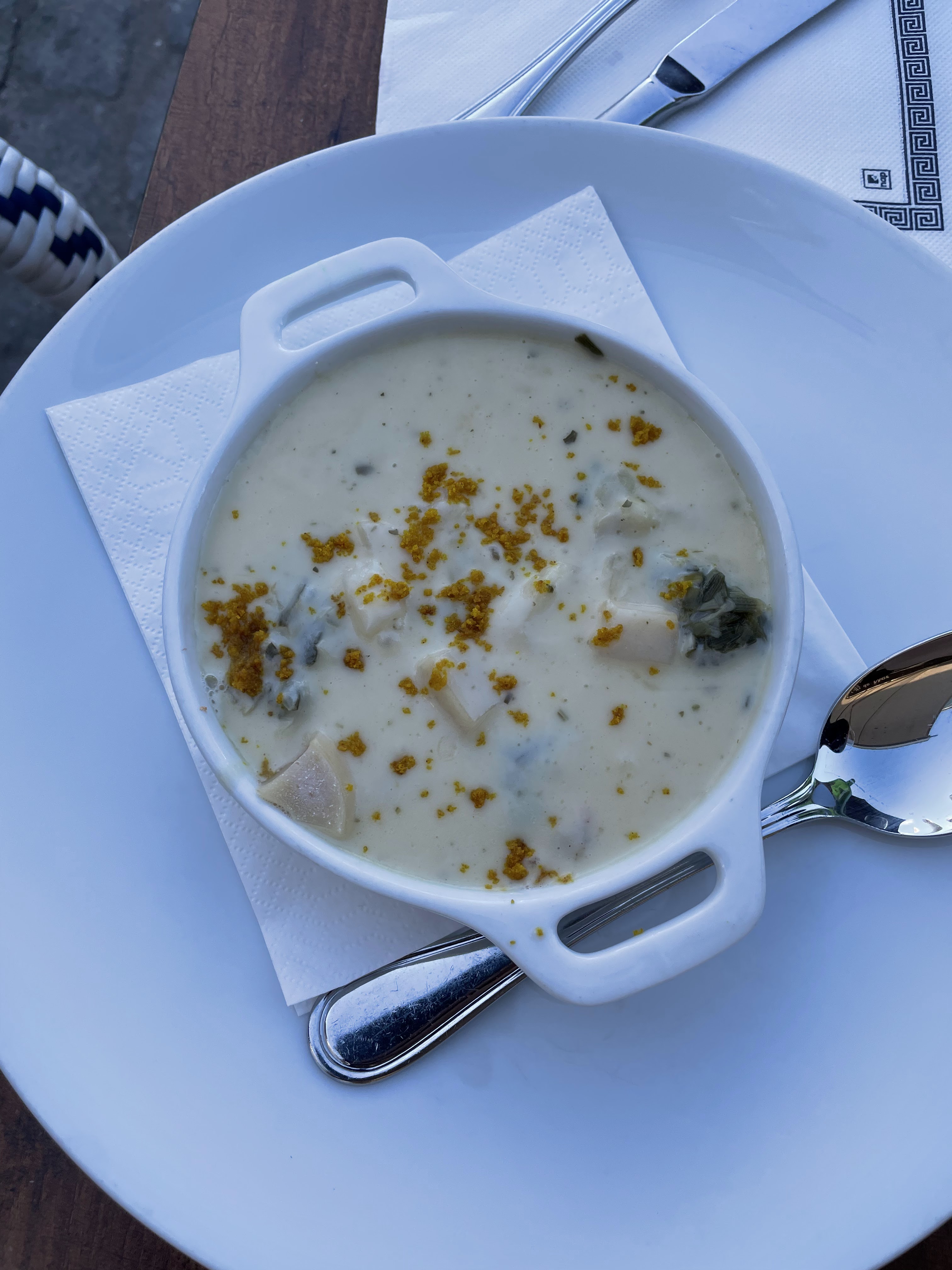 Nous avons déjeuné dehors sur la terrasse avec une vue magnifique sur le port et les passants. Le déjeuner était très bon : frais, fait maison et délicieux. Le personnel était très sympathique et serviable.