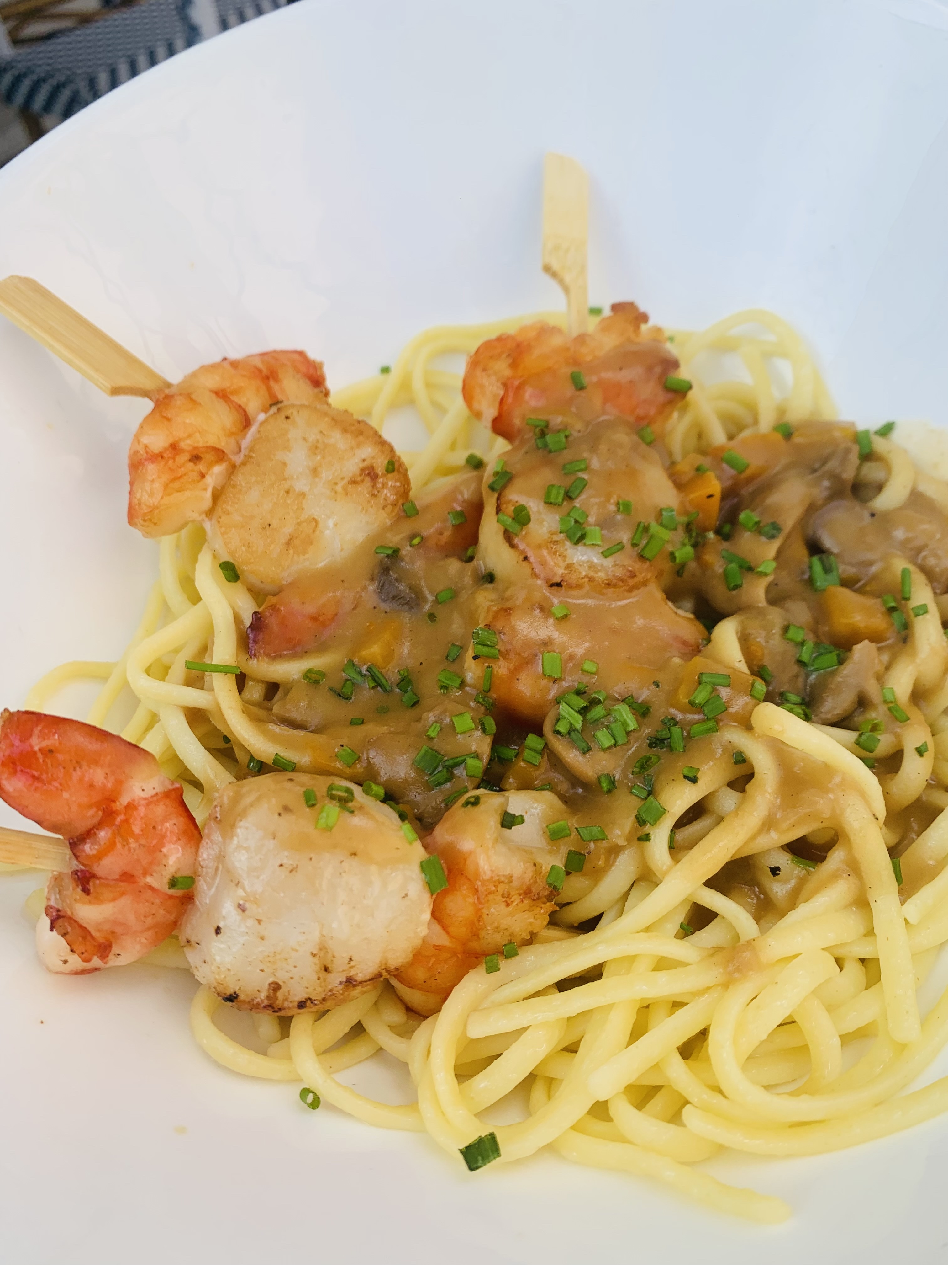 Cher pour ce que c’est 22 euro pour une brochette de saint Jacques avec 3 st jaques , et 6 crevettes , et spaghettis. Franchement changer de cuisinier, car c’est fade , deux grosses entrecôte , de la semelle immangeable . Personelle très agréable en revanche , service rapide .