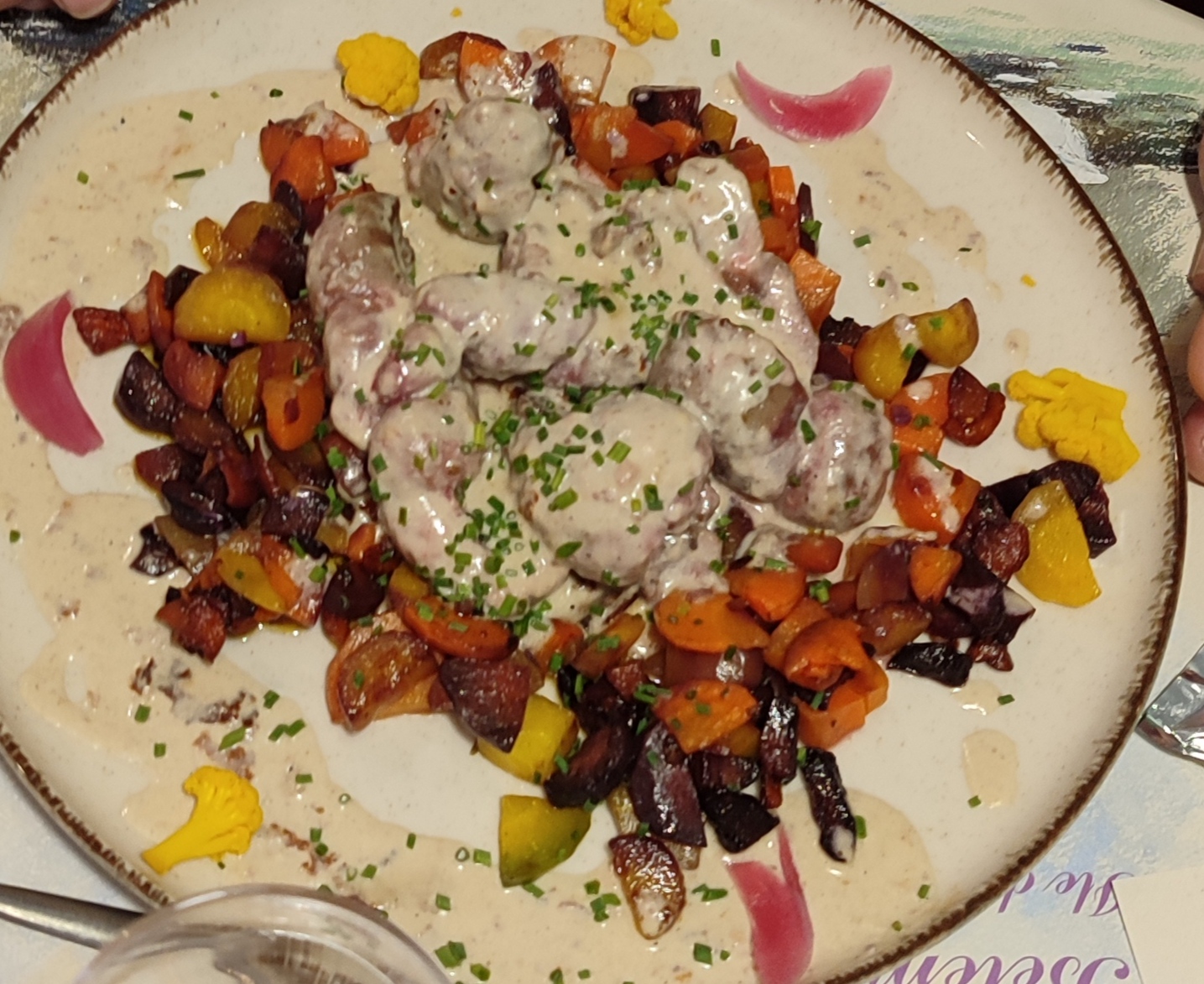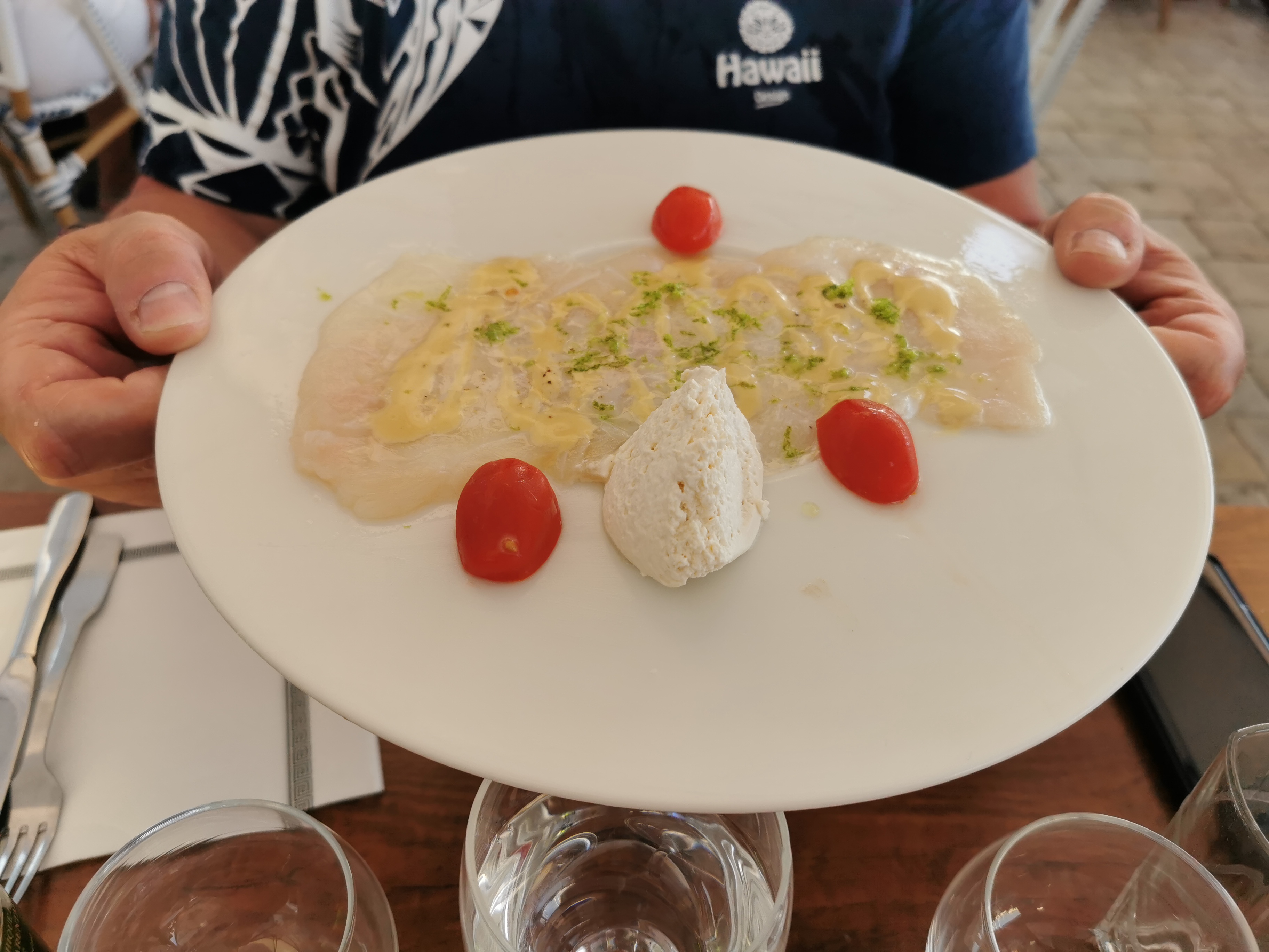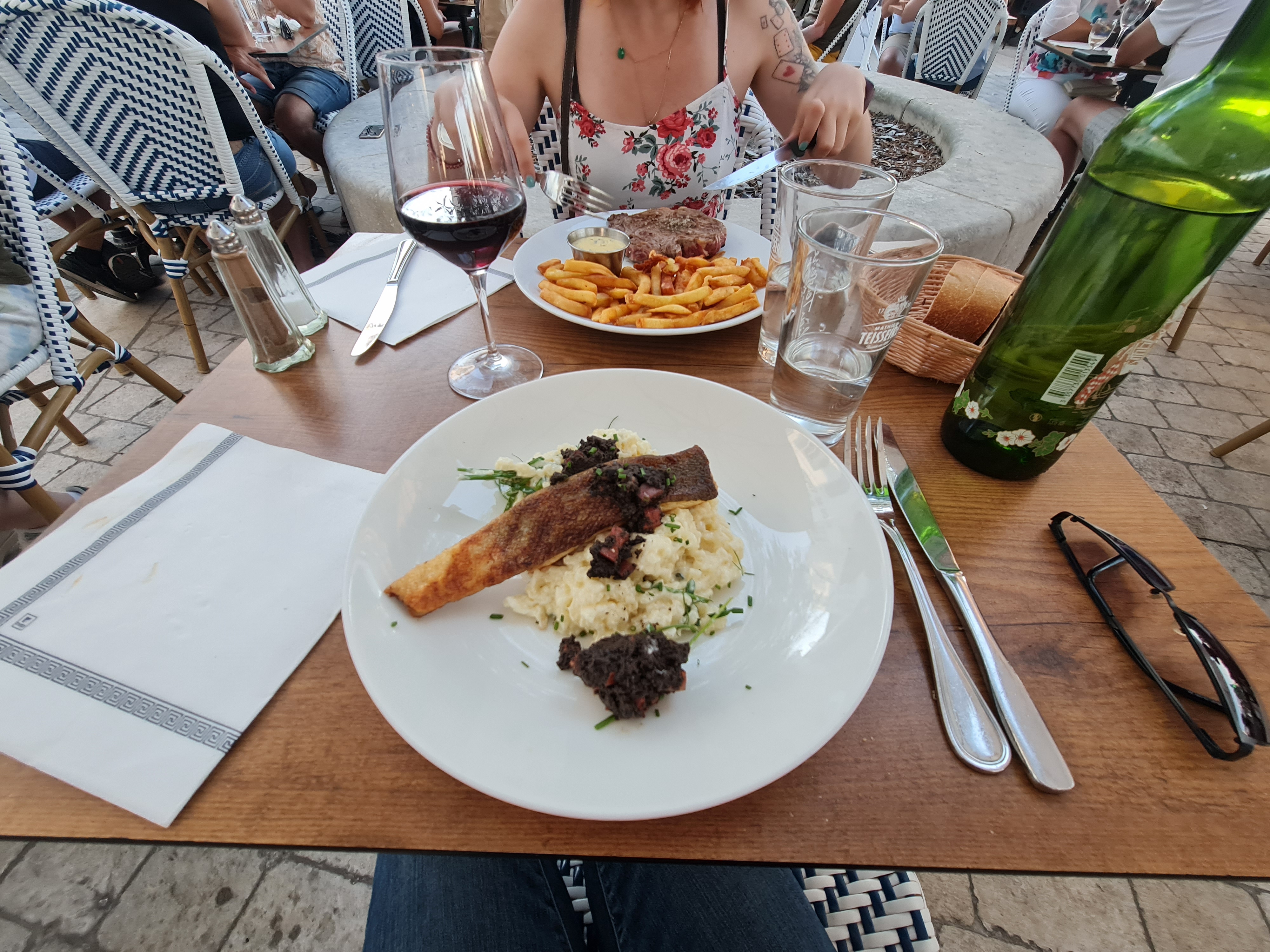 Soupe de poisson très bonne, bon carpaccio, ma copine a aimé le poisson. Parcontre la pièce de viande : du caoutchouc , 5 minutes à mâcher pour venir à bout d’un petit morceau, frites bof pas maison. Desserts sans plus. On s’attendait à mieux.