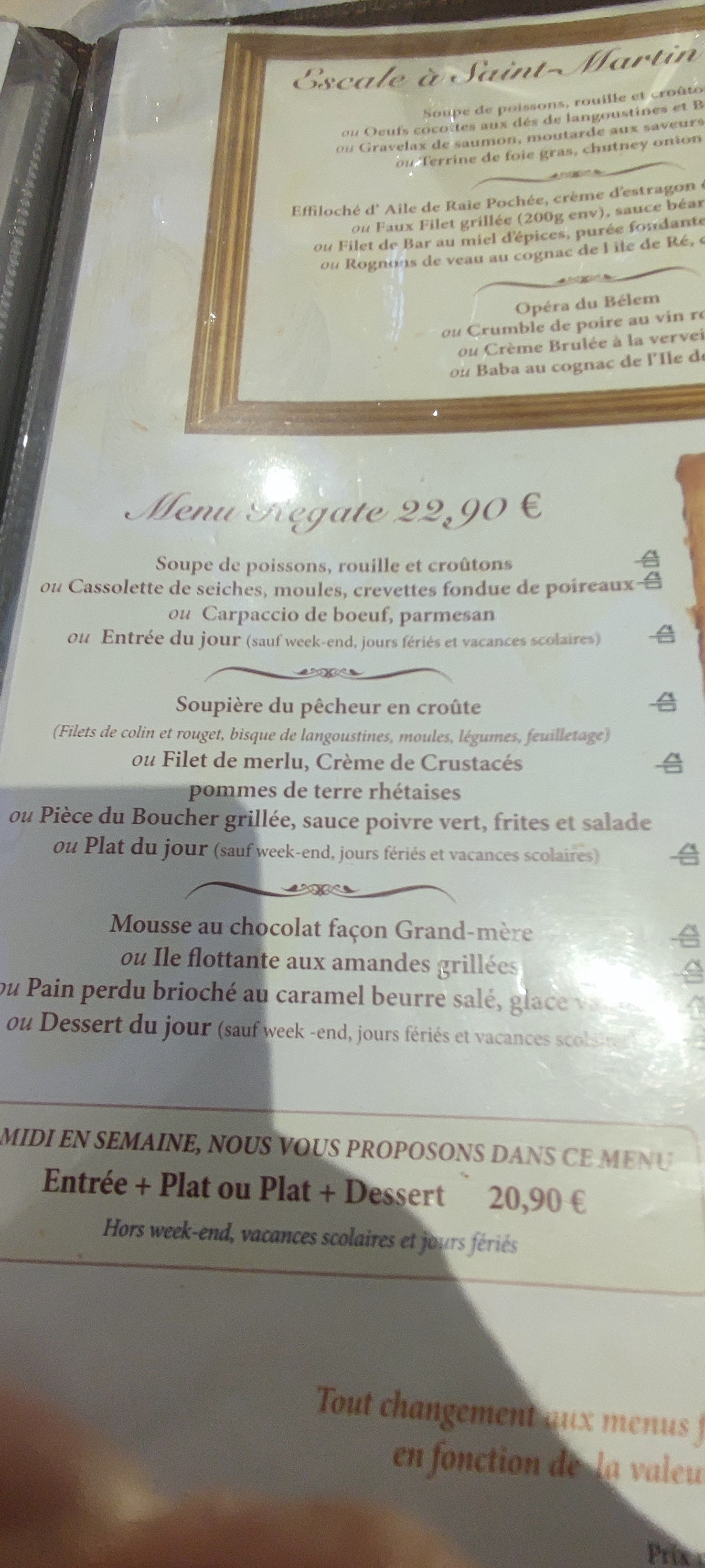 Un menu le soir à 22,90 e entree, plat, dessert à l ile de ré, du jamais vu... Et en plus du choix 3 plats .... Soupe de poisson, croute de. Poissons mélangés et ils flottante pour ma part.... Du goût... Ça sent le cuisiné et non le surgelé.... Allez tester sans hesiter...