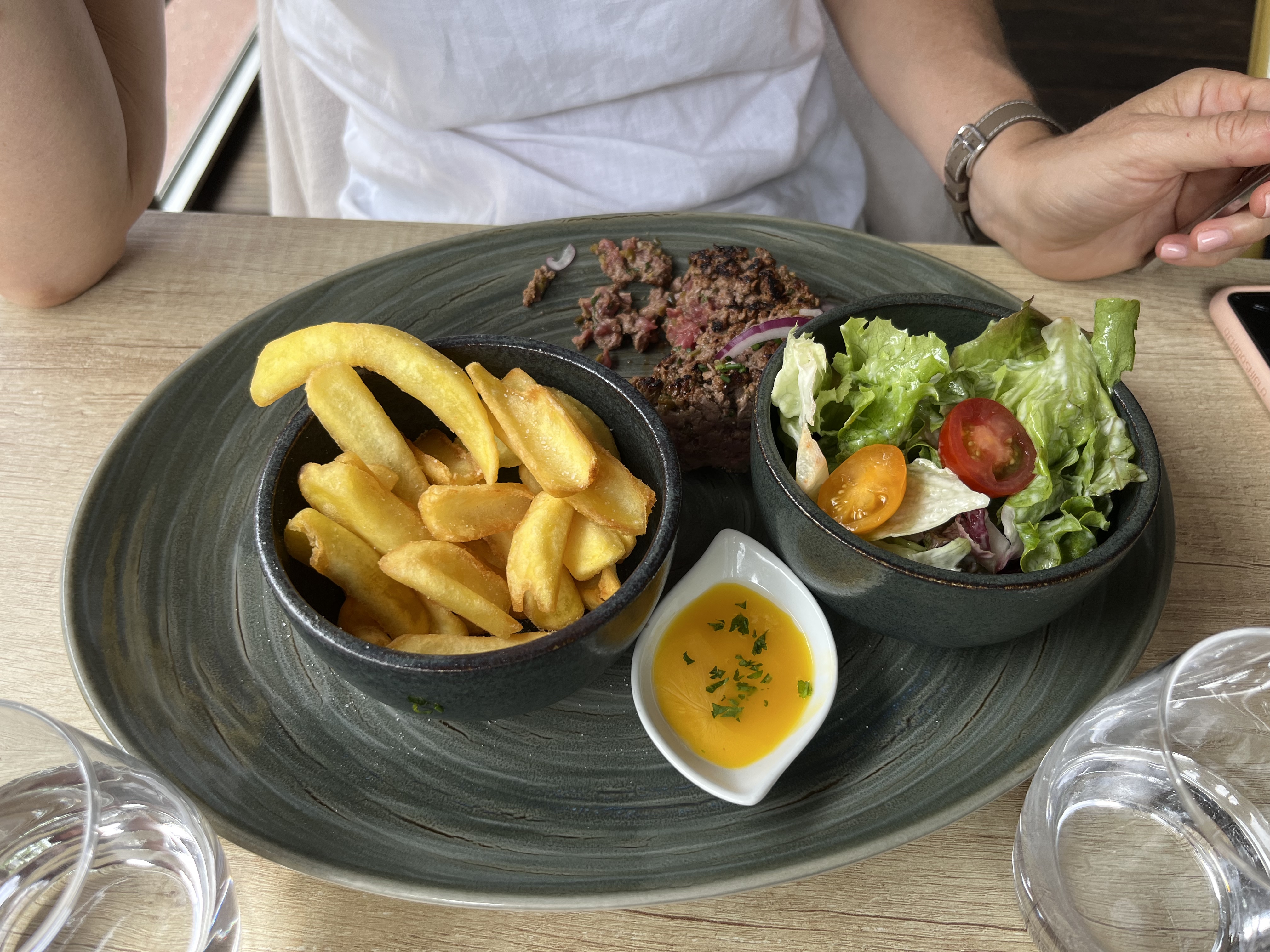 Repas de qualité plutôt médiocre malgré le monde et les avis positifs : la viande du burger était correcte mais le pain très mou. Salade d’endives avec une sauce à base de crème-mayonnaise plutôt lourde.