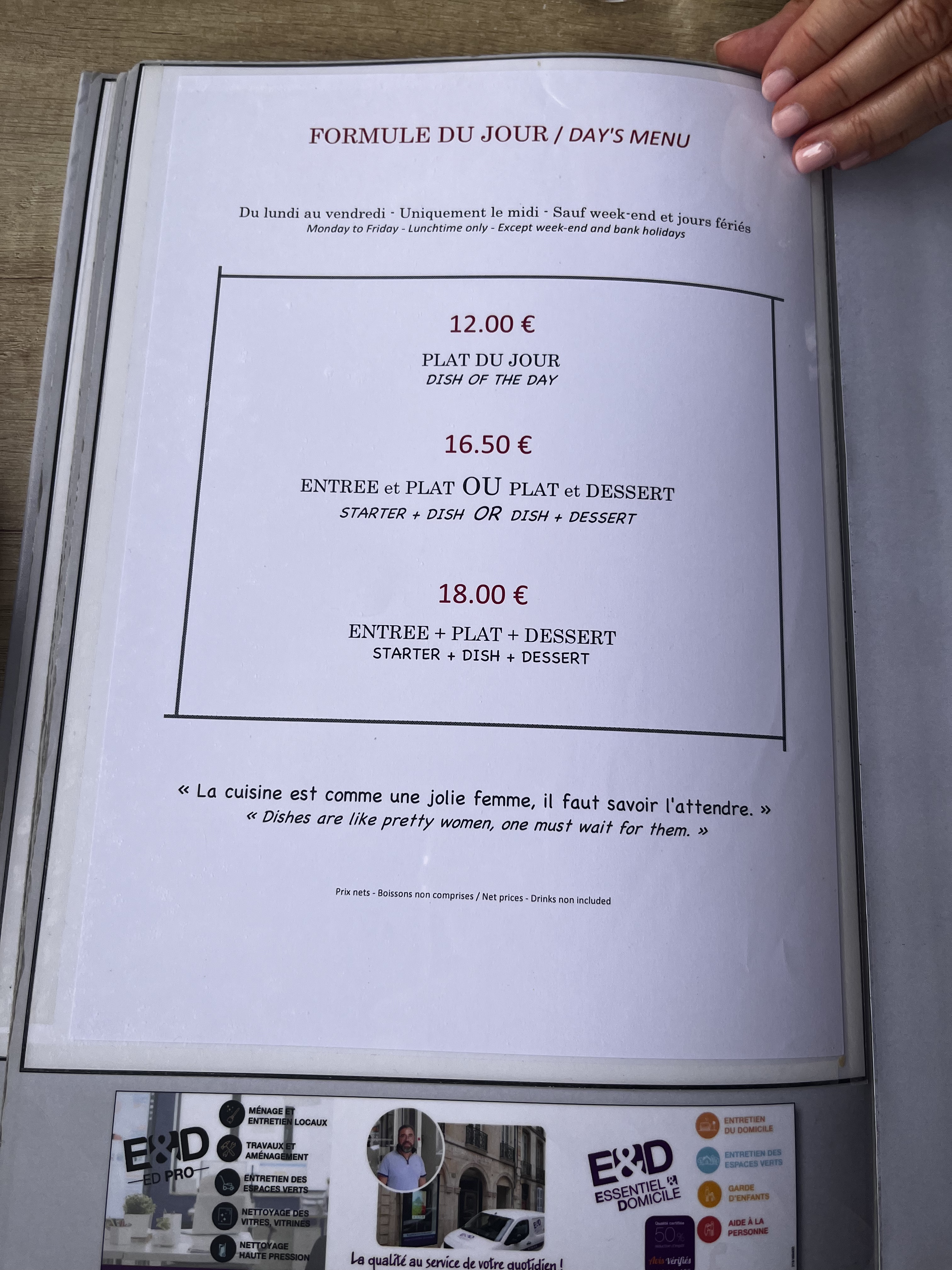 Excellent rapport qualité prix. Un menu à 3 plats pour 14,50 euros. Un service agréable. Je suis enchantée !
