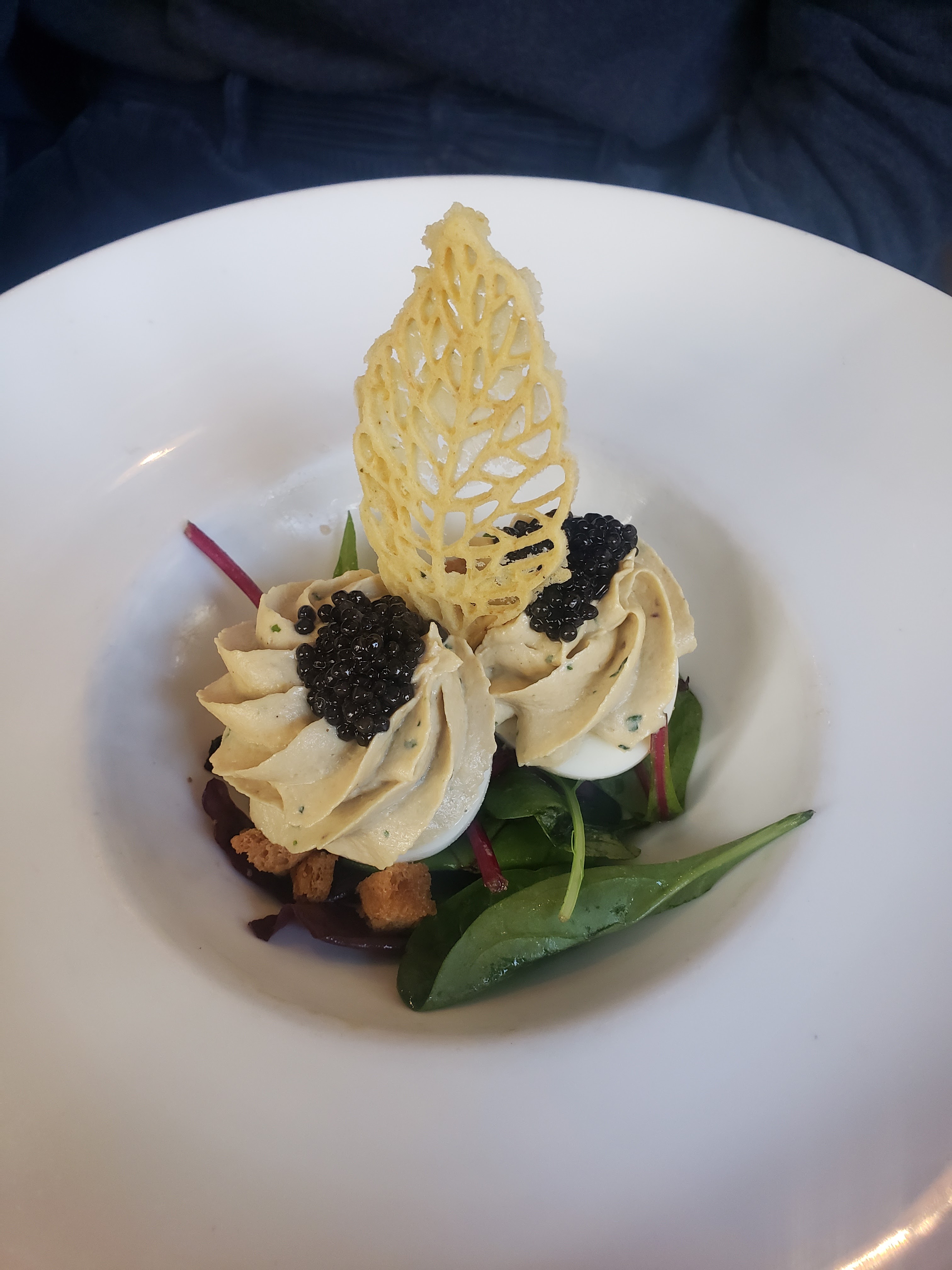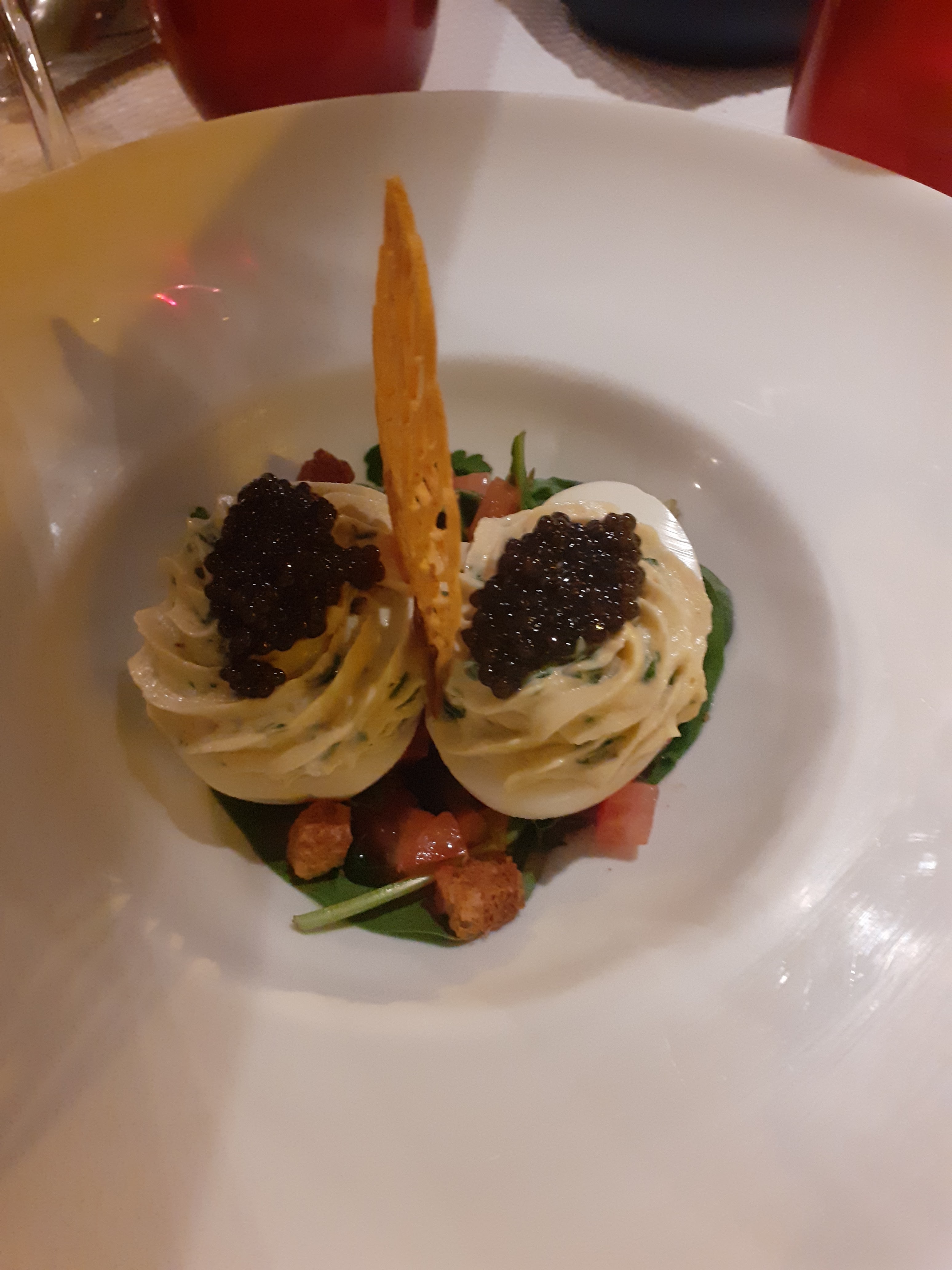 Entrée oeuf et caviar coquillettes truffes très bon fait avec goût pour le play poulet sauce homardine la sauce manqué de goût de crustacé !!!!