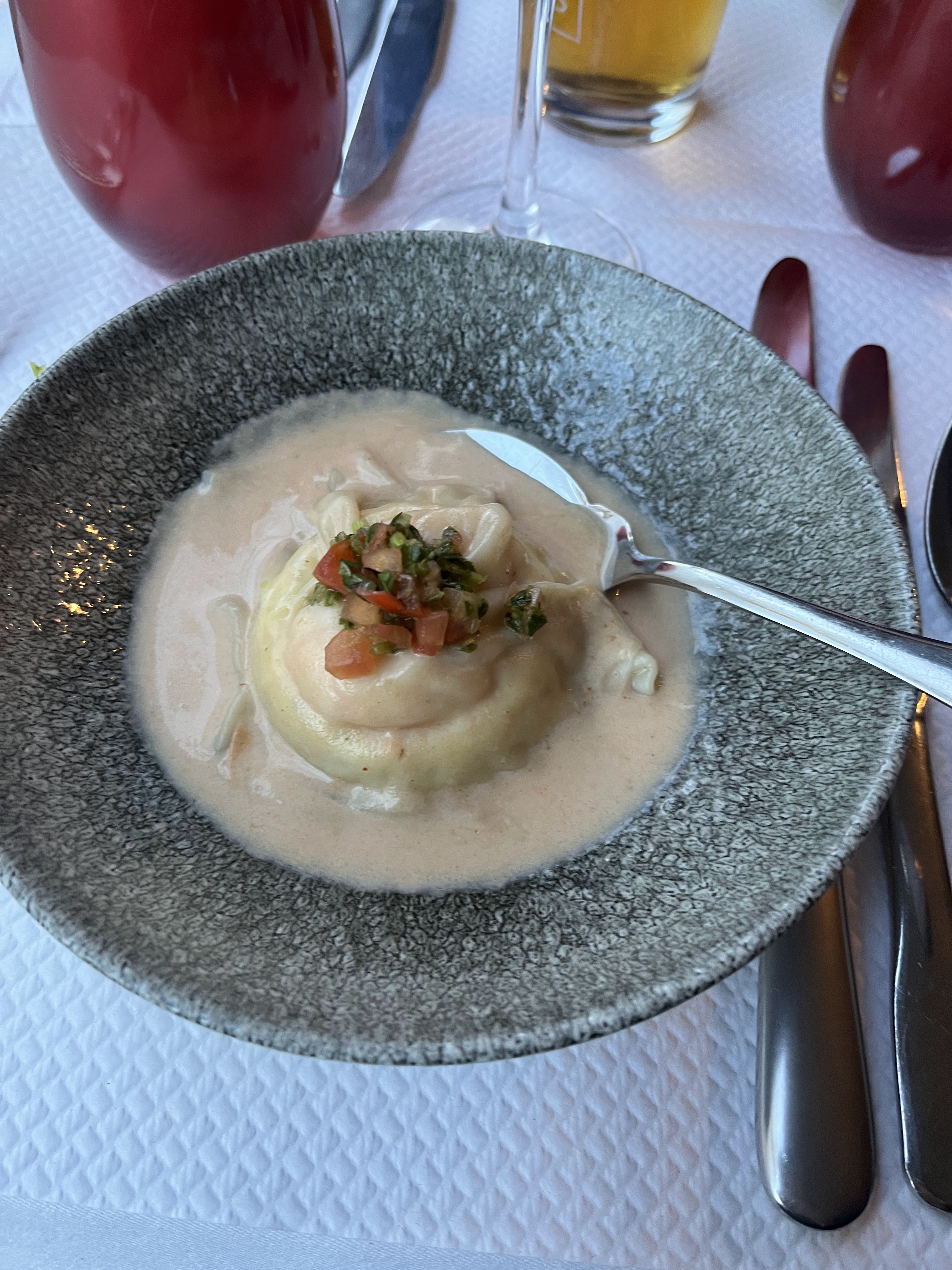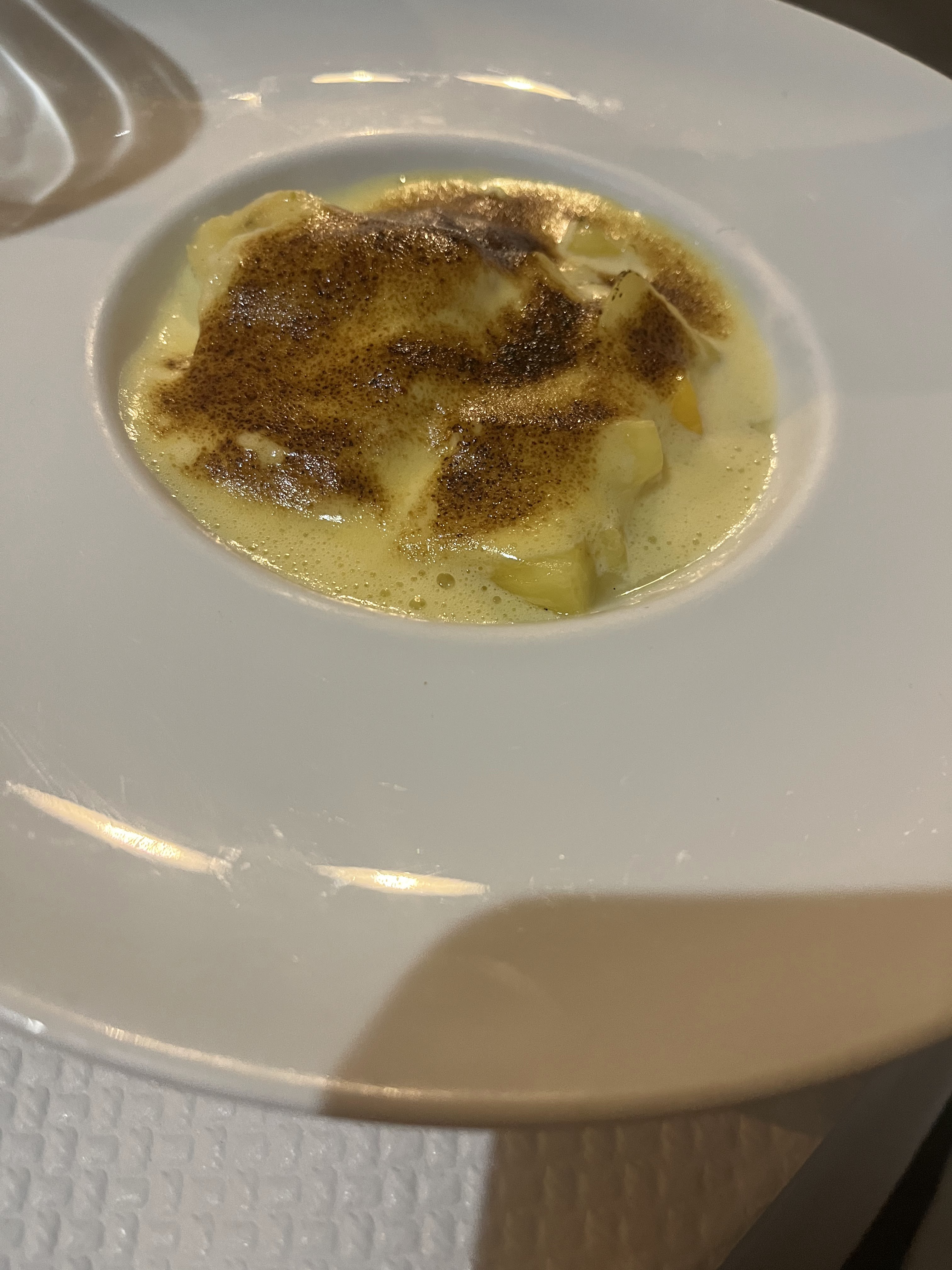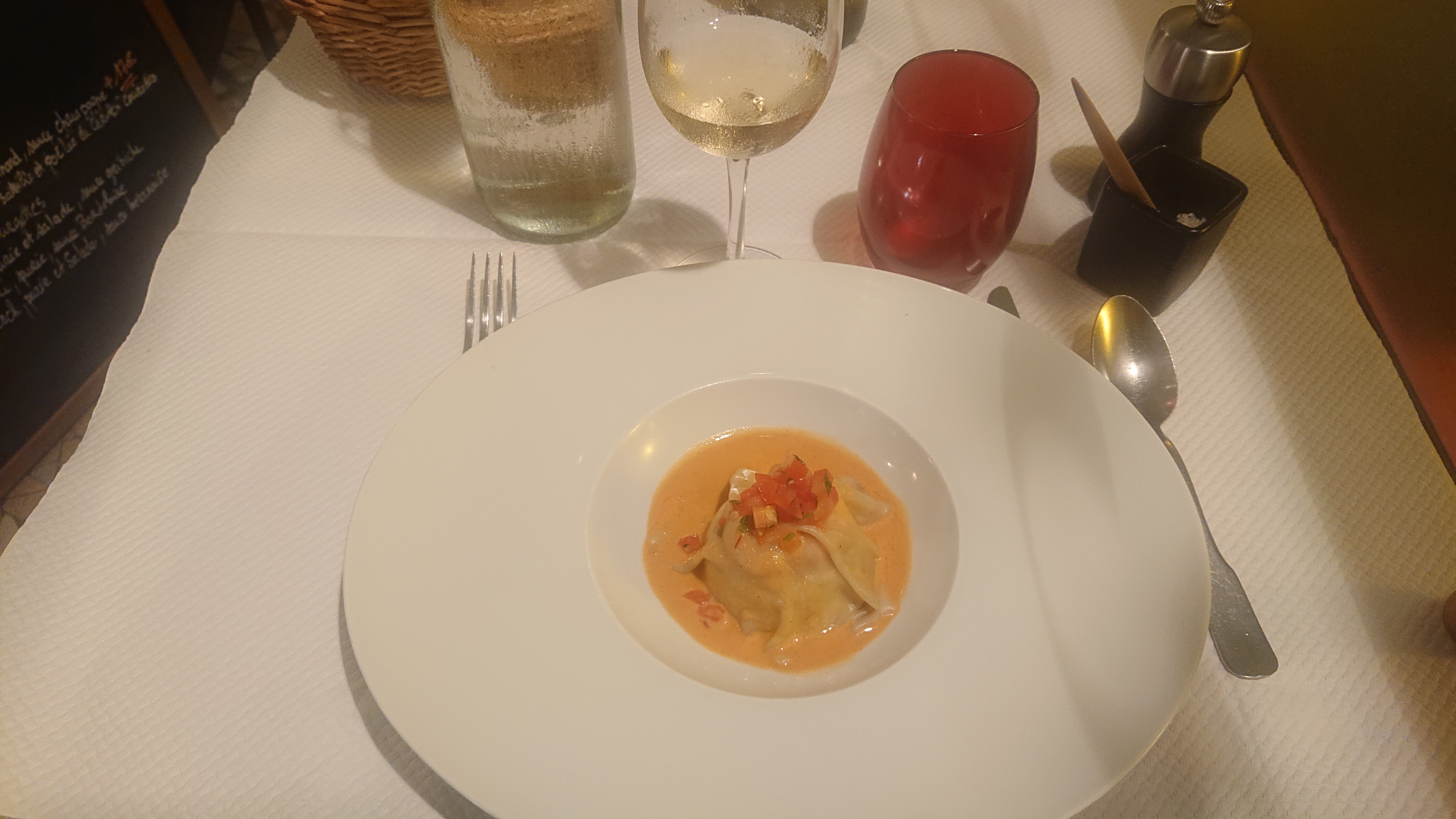 Une très agréable découverte, nous n’avions pas envie de choisir donc nous avons pris le menu découverte 5 plats à 55€ et nous avons en effet découvert des choses que nous ne connaissions pas comme les subtiles ravioles aux algues et au homard. Le tout accompagné de sourire et du chef qui vient vous saluer. Je n’aimais pas le dessert, et le chef voyant que je ne mangeais pas m’a immédiatement remplacé mon assiette avec un fondant parfait. La carte des vins n’est pas en peine… quelques jolies bouteilles pour vous ravir. Merci pour ce joli moment