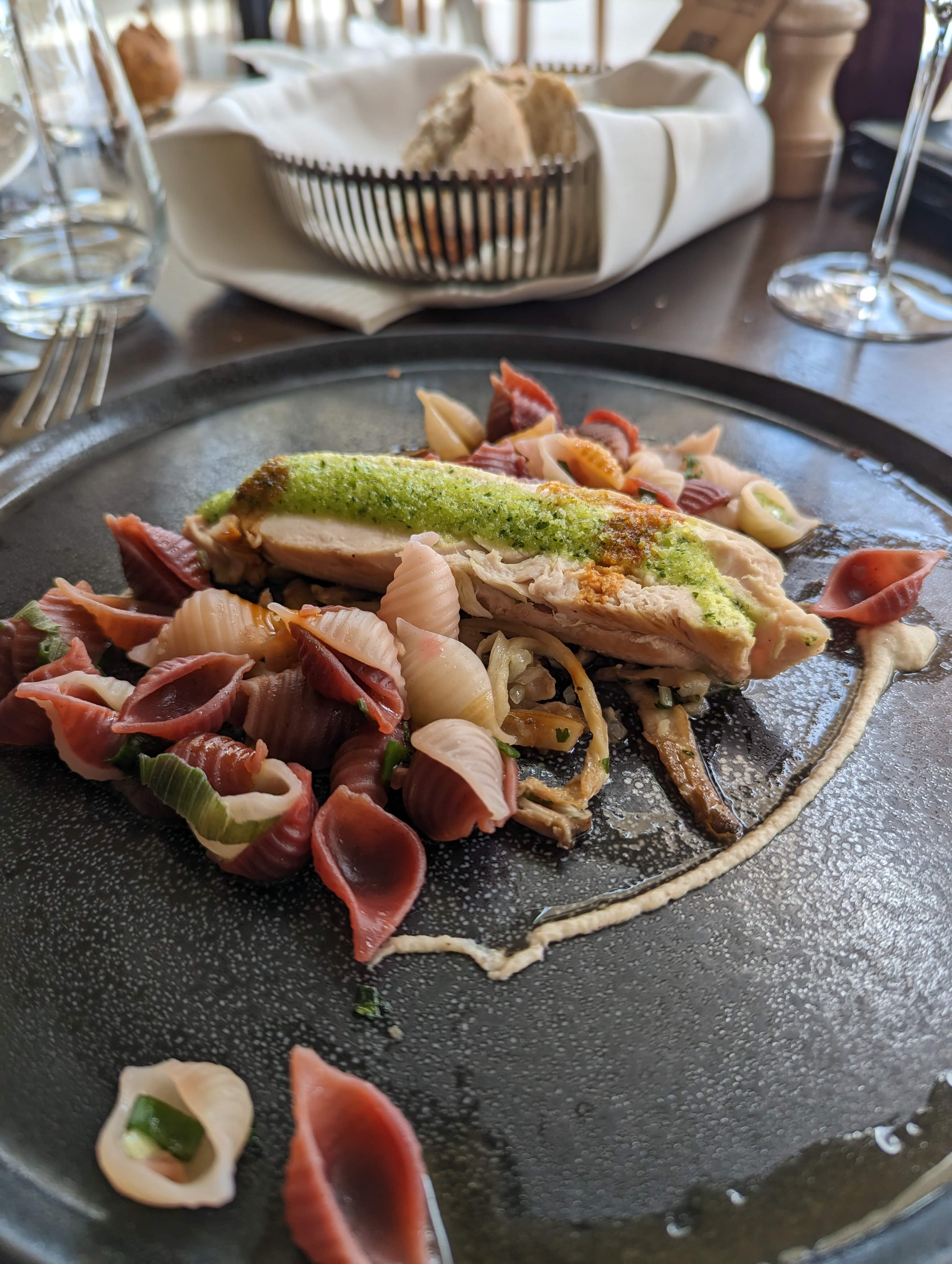 Excellent service, ambiance impeccable, vue incroyable, nourriture oubliable... Une expérience décevante. Nous avons commandé le menu du midi, 45 € l'entrée + plat + dessert. Tout était médiocre. Salade simple, jambon fade. Poisson pas assez cuit à la texture étrange, accompagné de pommes de terre type polenta, sèches et sans goût. Du poulet pâle qui semblait provenir d'une cantine universitaire, absolument insipide, accompagné de pâtes en boîte. Le tout peut être facilement reproduit dans ma cuisine maison, à la différence que cela aurait bien plus de saveur !! 45 € pour un menu de déjeuner d'hôtel aussi raffiné semble être une opportunité incroyable, mais au final on se sent floué. Pour moins cher, nous mangerions bien mieux dans un restaurant de village.