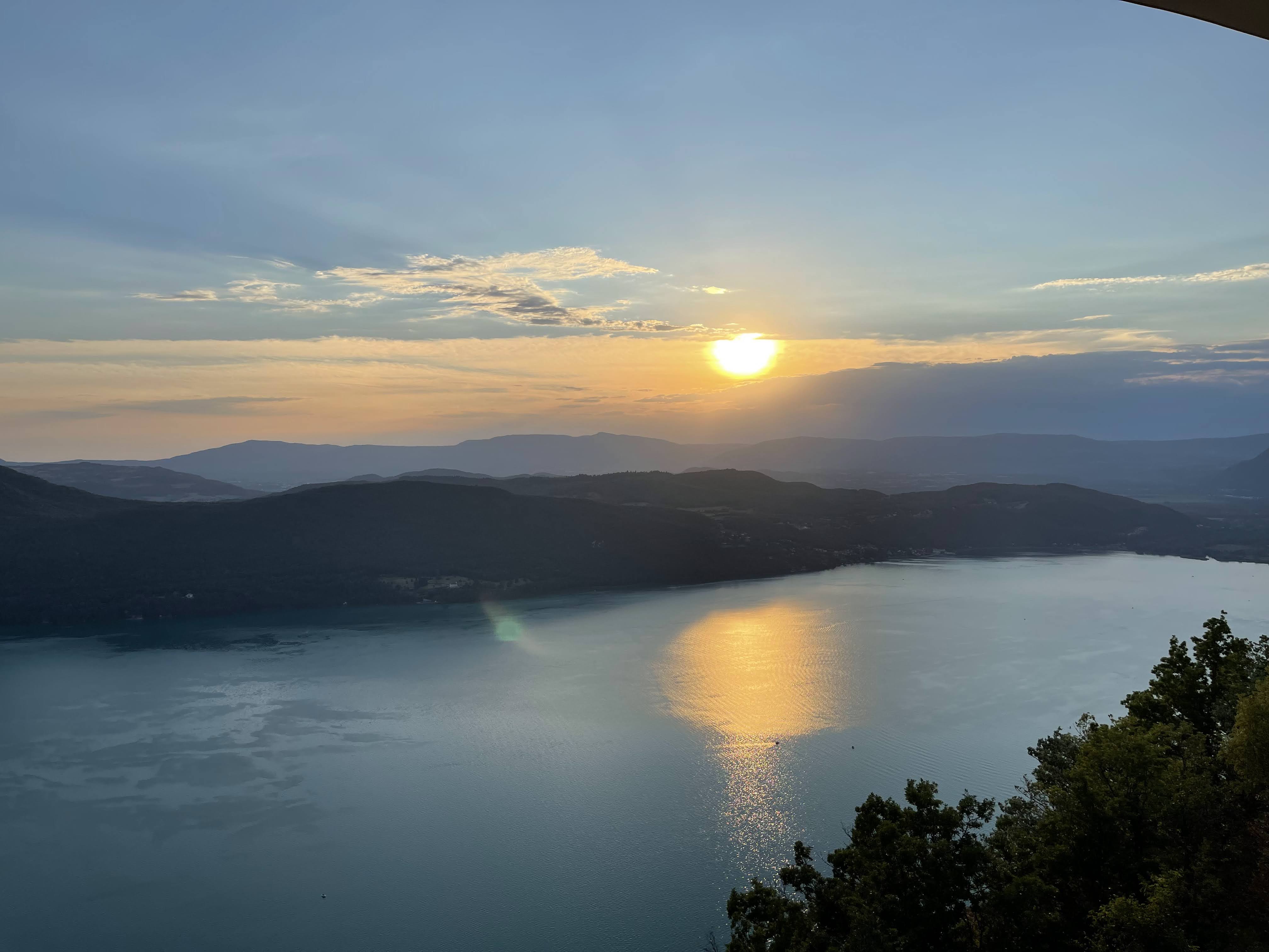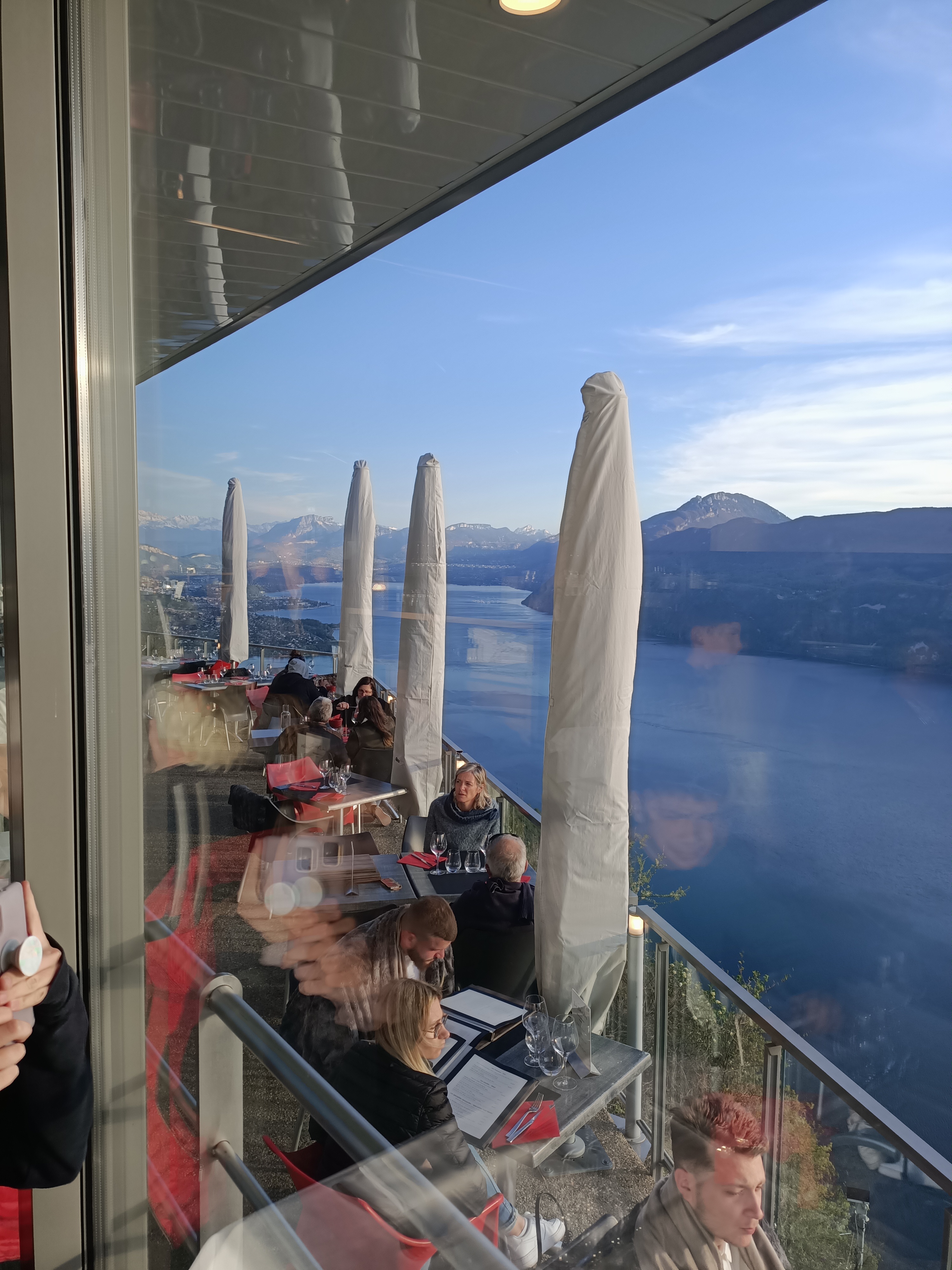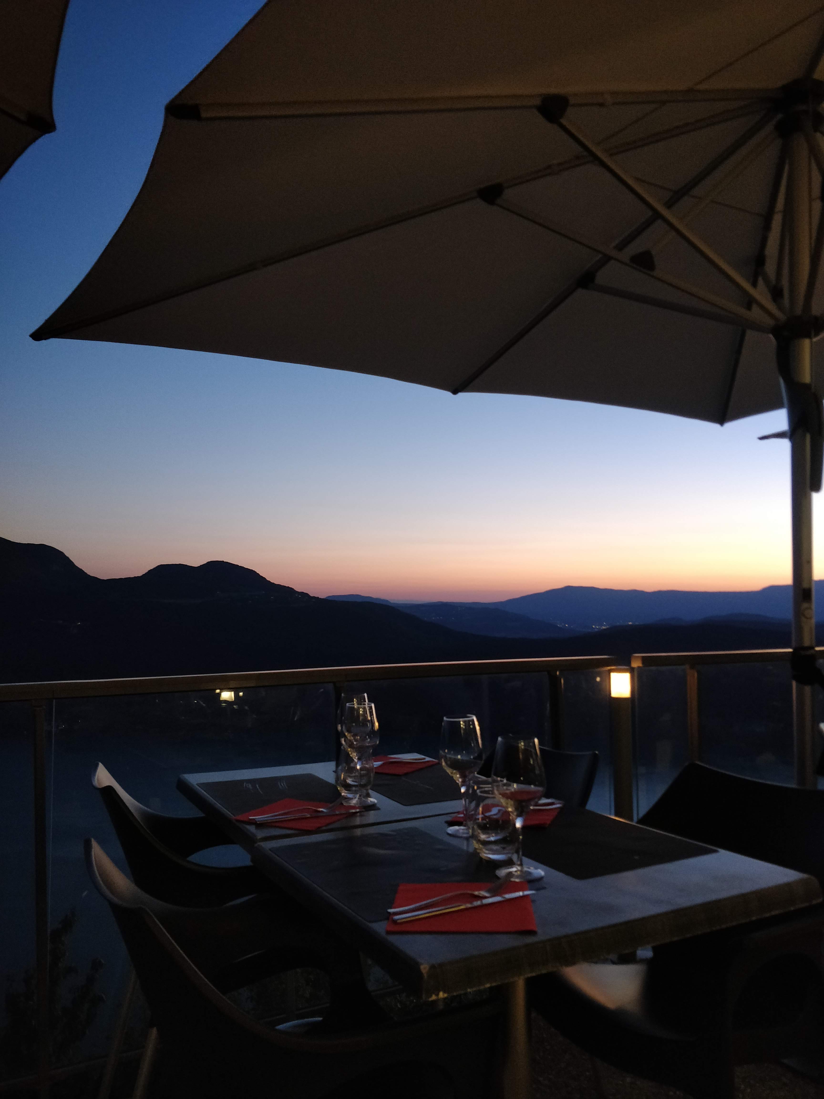 Une expérience inoubliable, le point de vue sur l'ensemble du lac du Bourget, les montagnes environnantes et le coucher de soleil vaut le détour, d'ailleurs l'accès est un peu tortueux. L'idéal est d'arriver un peu avant le coucher de soleil pour profiter des dégradés de couleurs qui ne saissent d'évoluer toute la soirée, pour se terminer par un ciel étoilé avec les lumières d'Aix en contre bas. Le restaurant moderne et bien conçu a été construit le long de la corniche, la salle toute en longueur est bordée par une baie vitrée qui permet de profiter parfaitement de la vue, une terrasse en contrebas rend l'expérience encore plus grandiose si le temps le permet, le restaurant propose des couvertures pour affronter les soirées un peu fraîches, un peu chic mais assez décontracté, la cuisine est de qualité mais assez simple, positionnement intermédiaire, un menu à 29€ et un menu enfant à 12€50. C'est tout à fait raisonnable vu la prestation.
