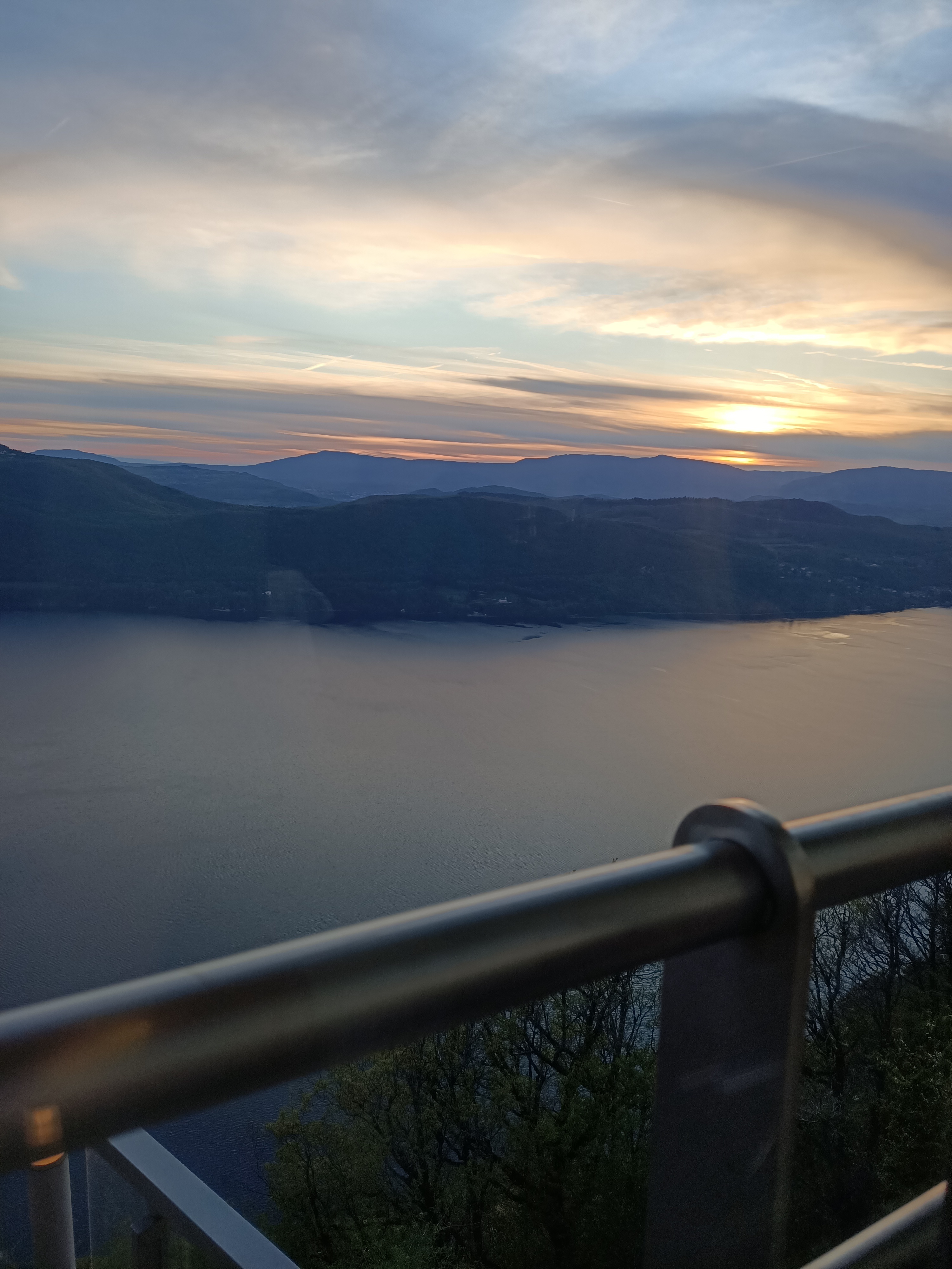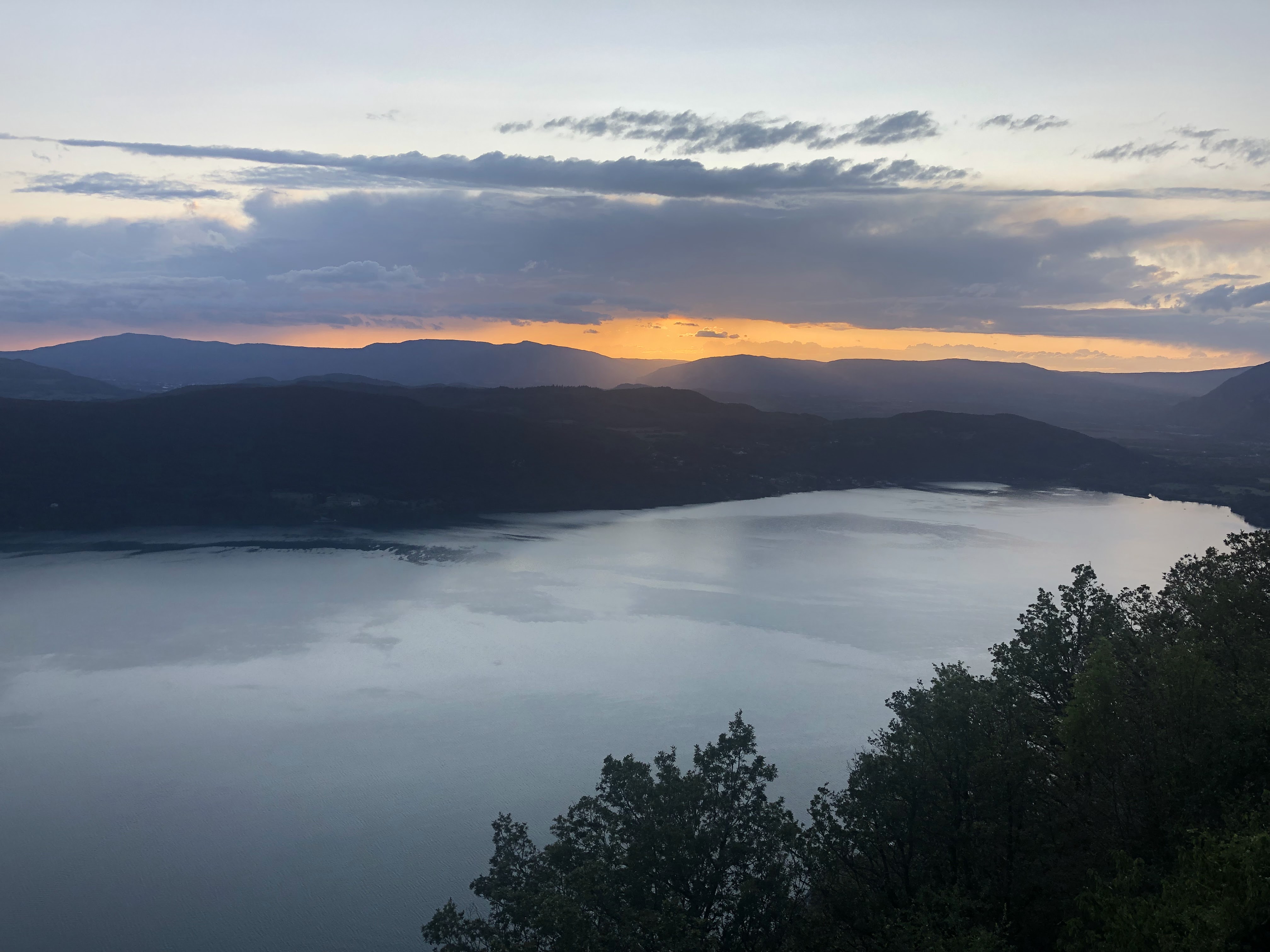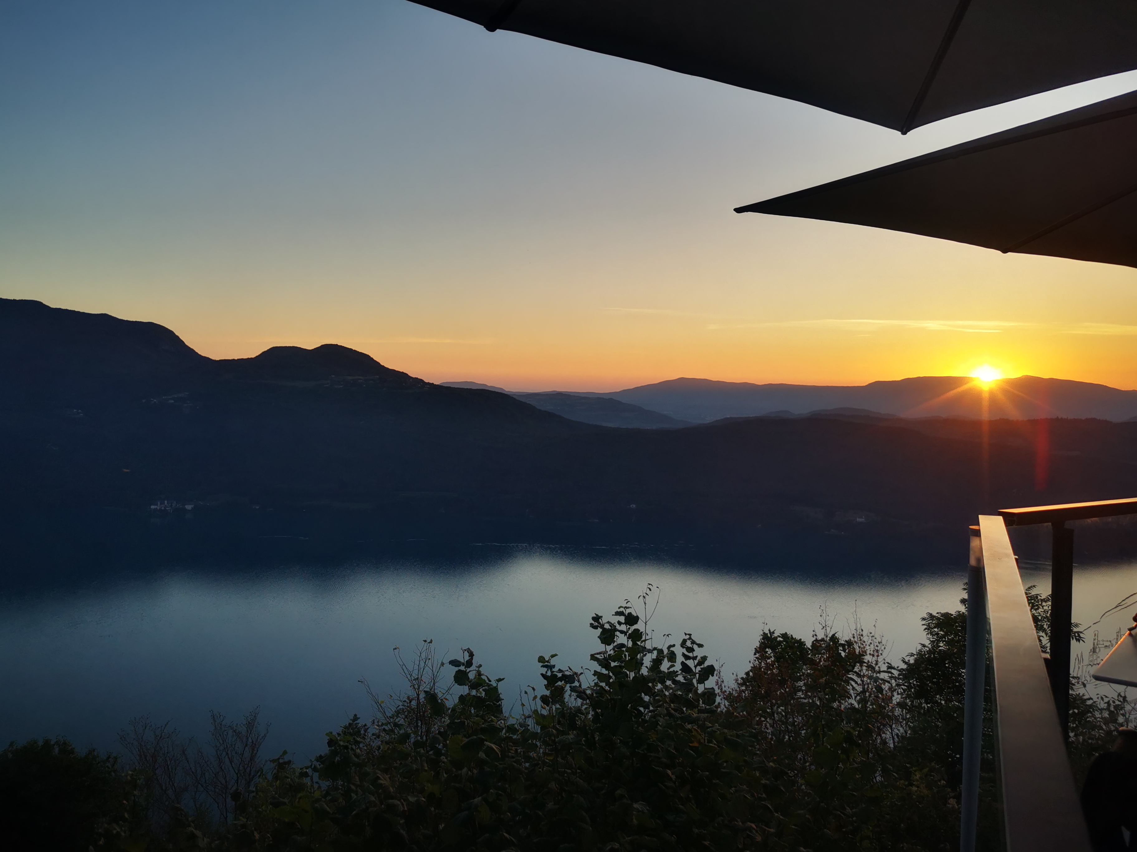 Une expérience inoubliable, le point de vue sur l'ensemble du lac du Bourget, les montagnes environnantes et le coucher de soleil vaut le détour, d'ailleurs l'accès est un peu tortueux. L'idéal est d'arriver un peu avant le coucher de soleil pour profiter des dégradés de couleurs qui ne saissent d'évoluer toute la soirée, pour se terminer par un ciel étoilé avec les lumières d'Aix en contre bas. Le restaurant moderne et bien conçu a été construit le long de la corniche, la salle toute en longueur est bordée par une baie vitrée qui permet de profiter parfaitement de la vue, une terrasse en contrebas rend l'expérience encore plus grandiose si le temps le permet, le restaurant propose des couvertures pour affronter les soirées un peu fraîches, un peu chic mais assez décontracté, la cuisine est de qualité mais assez simple, positionnement intermédiaire, un menu à 29€ et un menu enfant à 12€50. C'est tout à fait raisonnable vu la prestation.